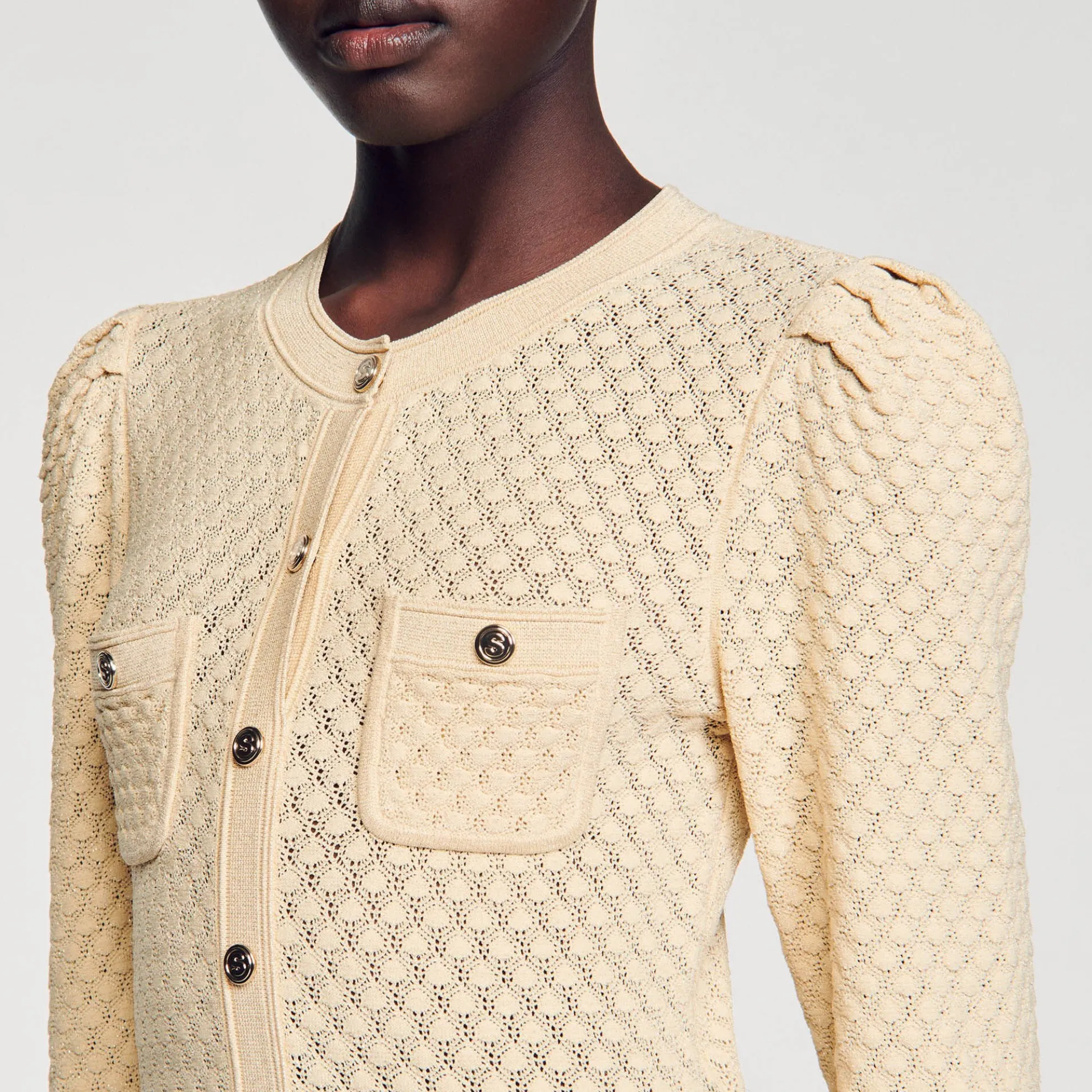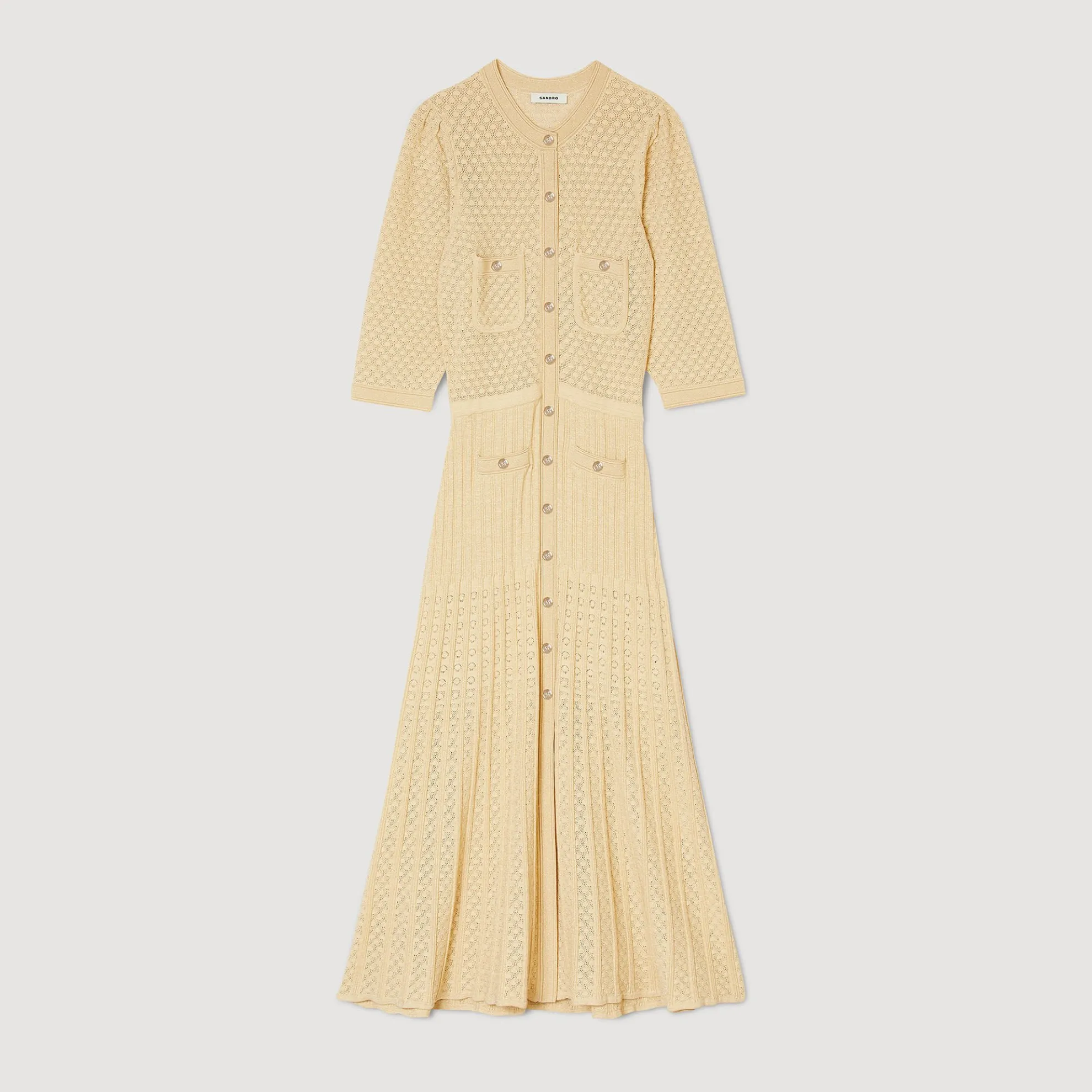 Midi-jurk van pointillé gebreid materiaal met ronde hals, knoopsluiting, uitlopend rokgedeelte met split en knoopzakken.