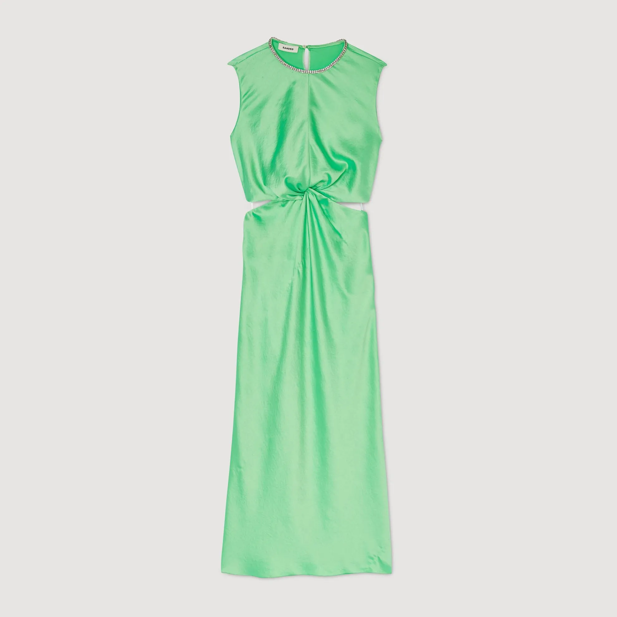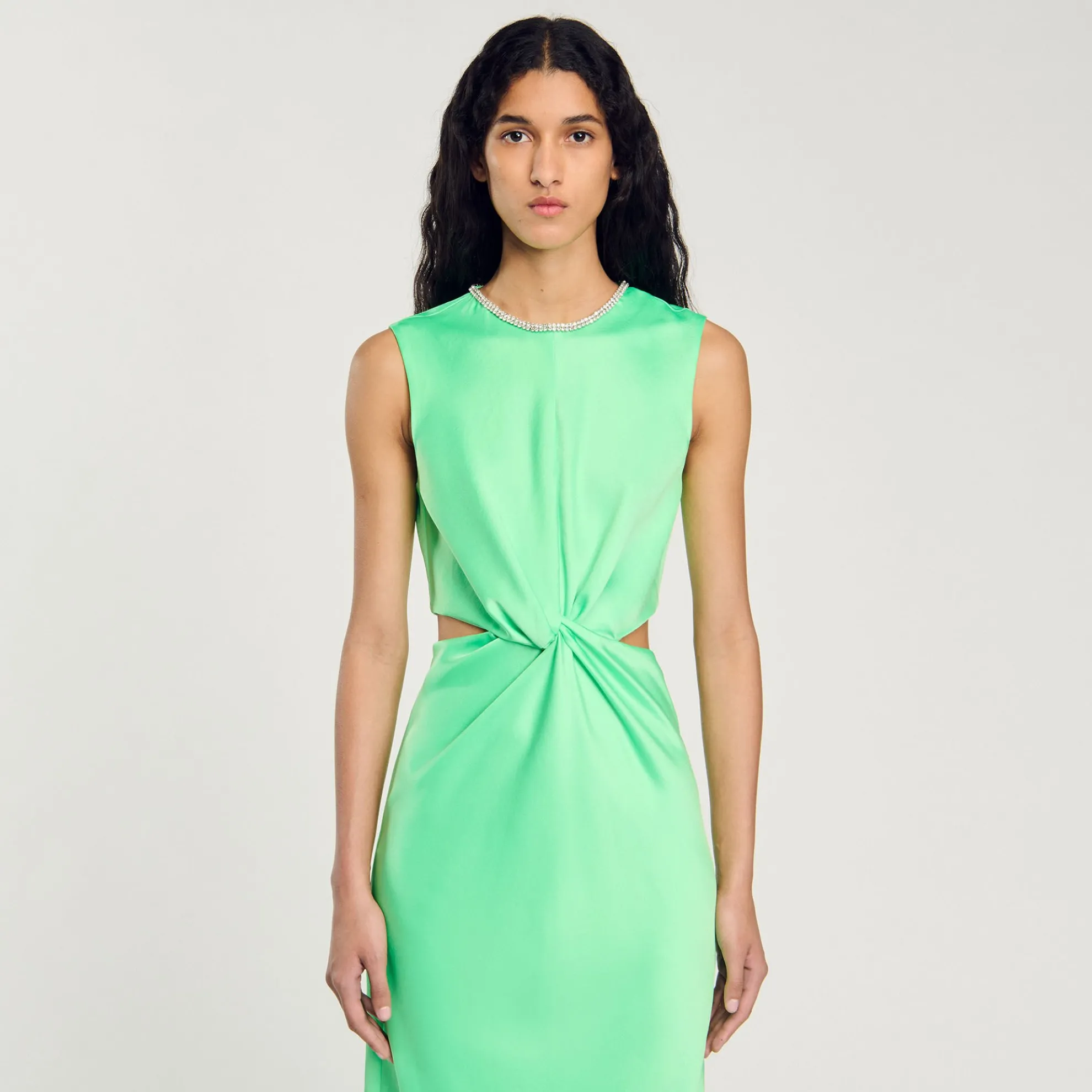 Mouwloze, rechte midi jurk met een ronde hals met stras, cut-outs aan de zij- en achterkant en wikkelplooien in de taille.