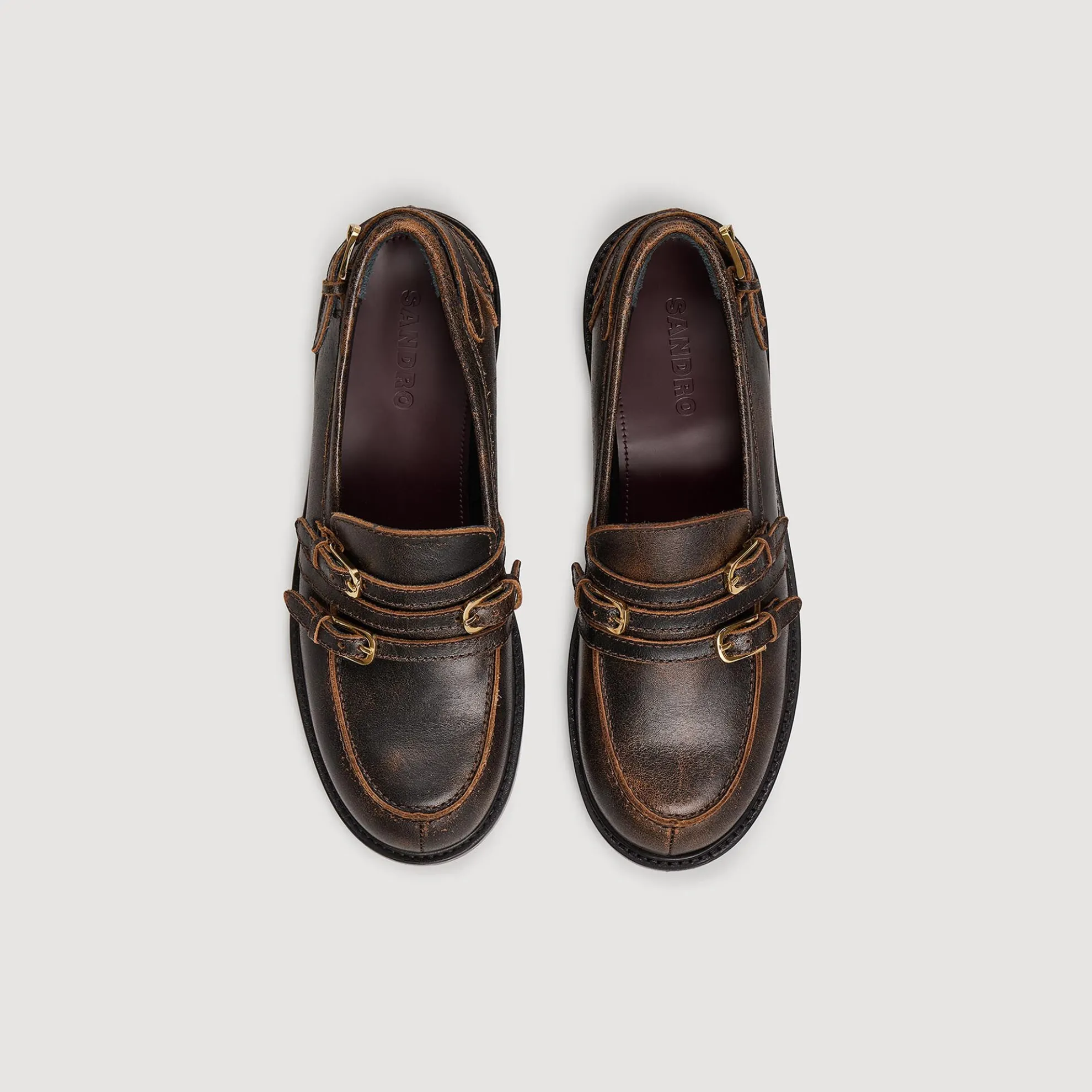 Mocassins van leer met verweerd effect, met meerdere bandjes aan de voor- en achterkant en een kleine hak.