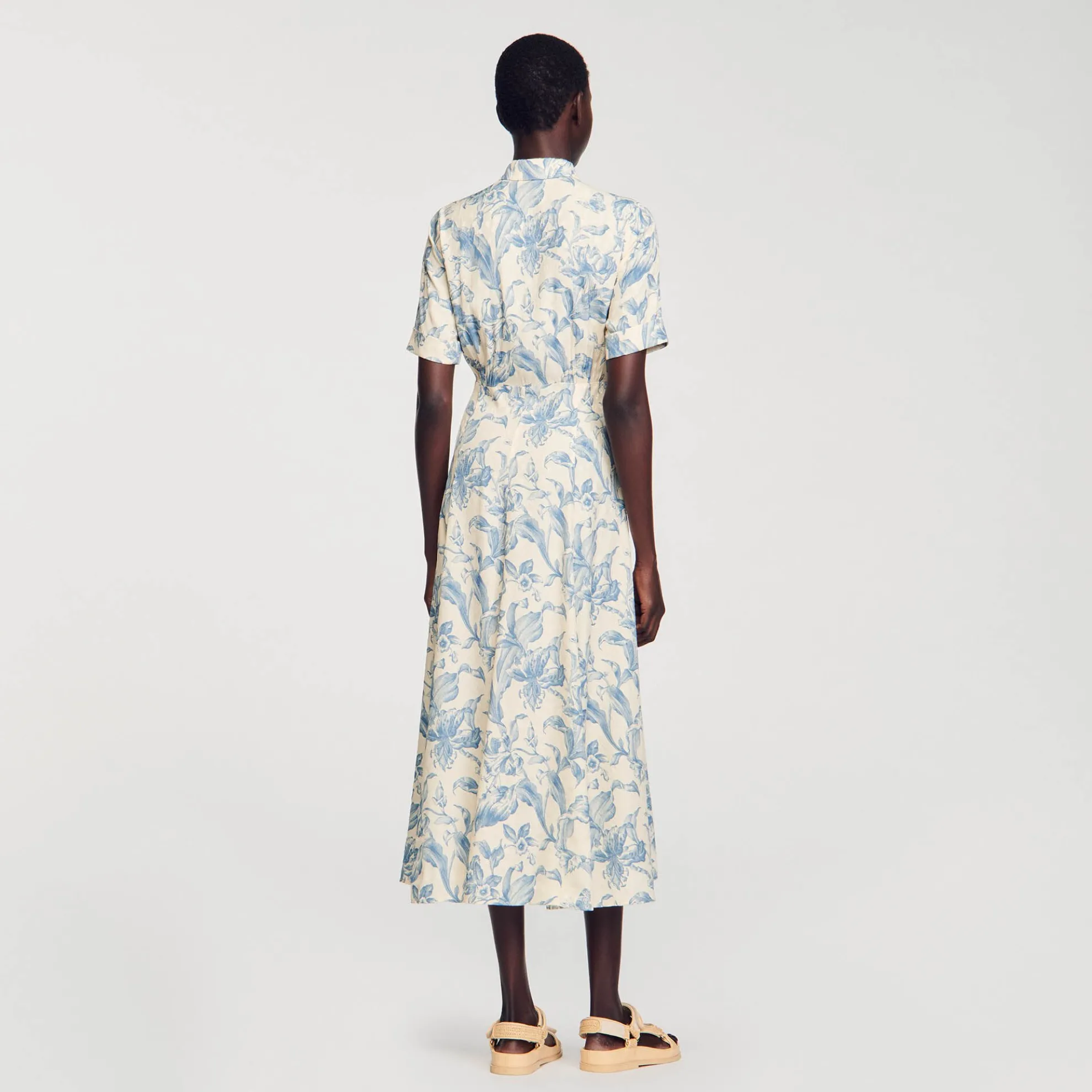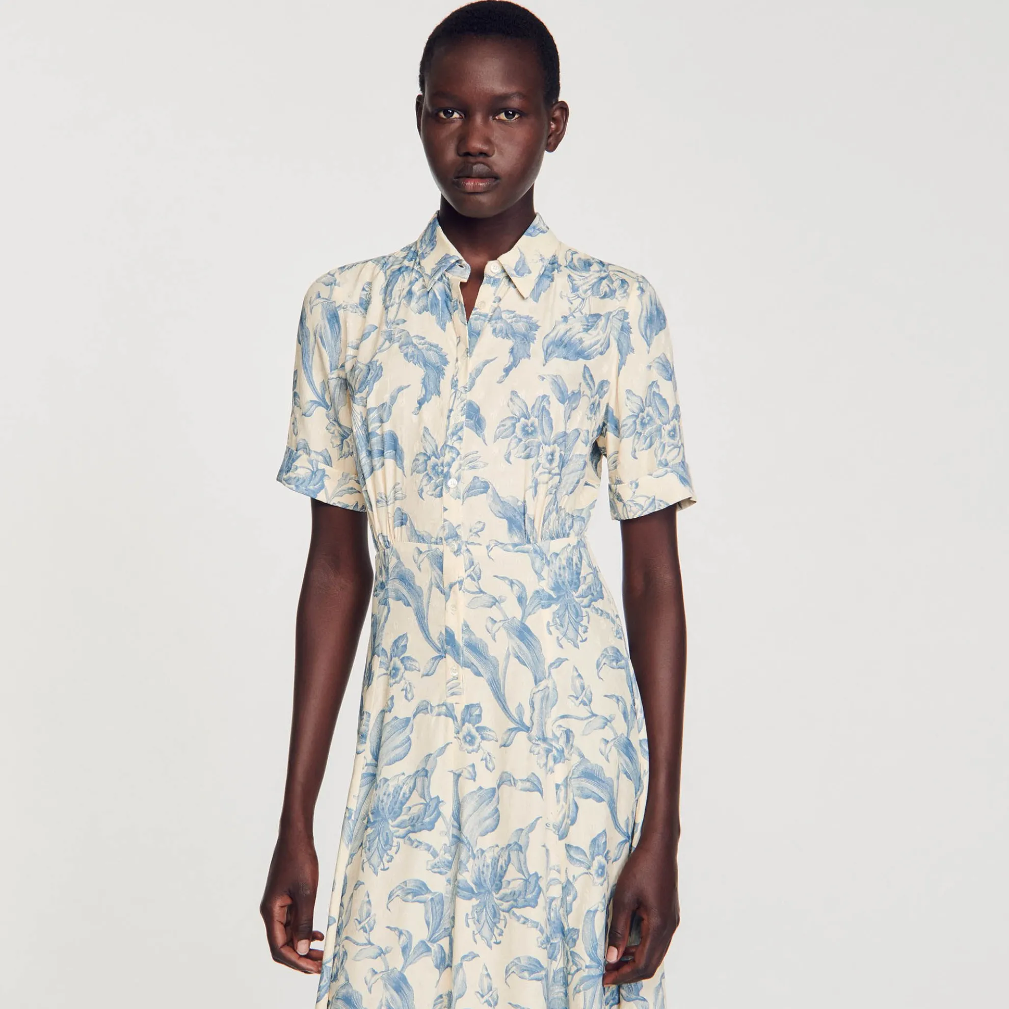Lange overhemdjurk met bloemenprint, nauwsluitend in de taille met overhemdkraag, korte mouwen met omslag en knoopsluiting aan de voorkant.