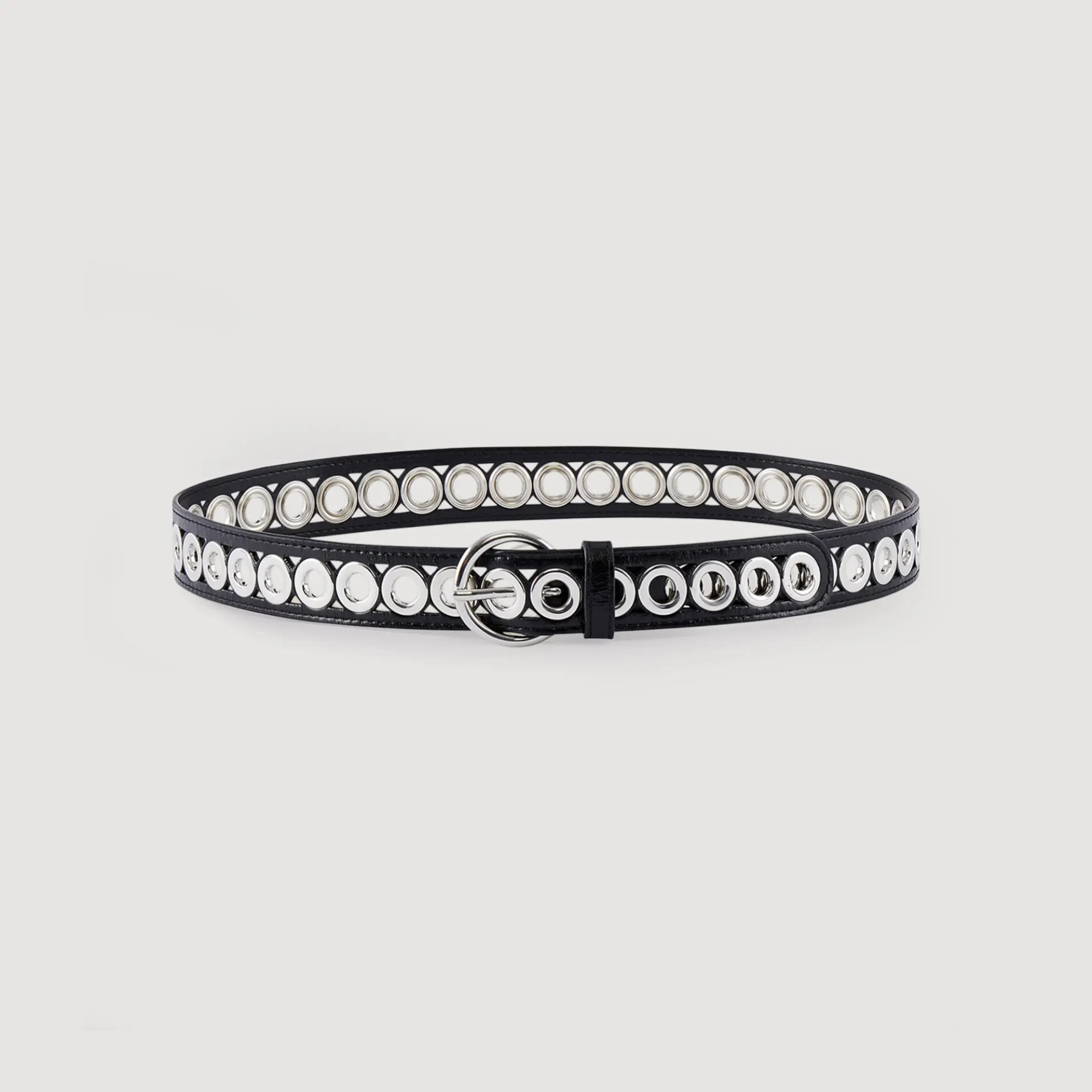 Leren riem met verstelbare gesp, versierd met metalen oogjes.