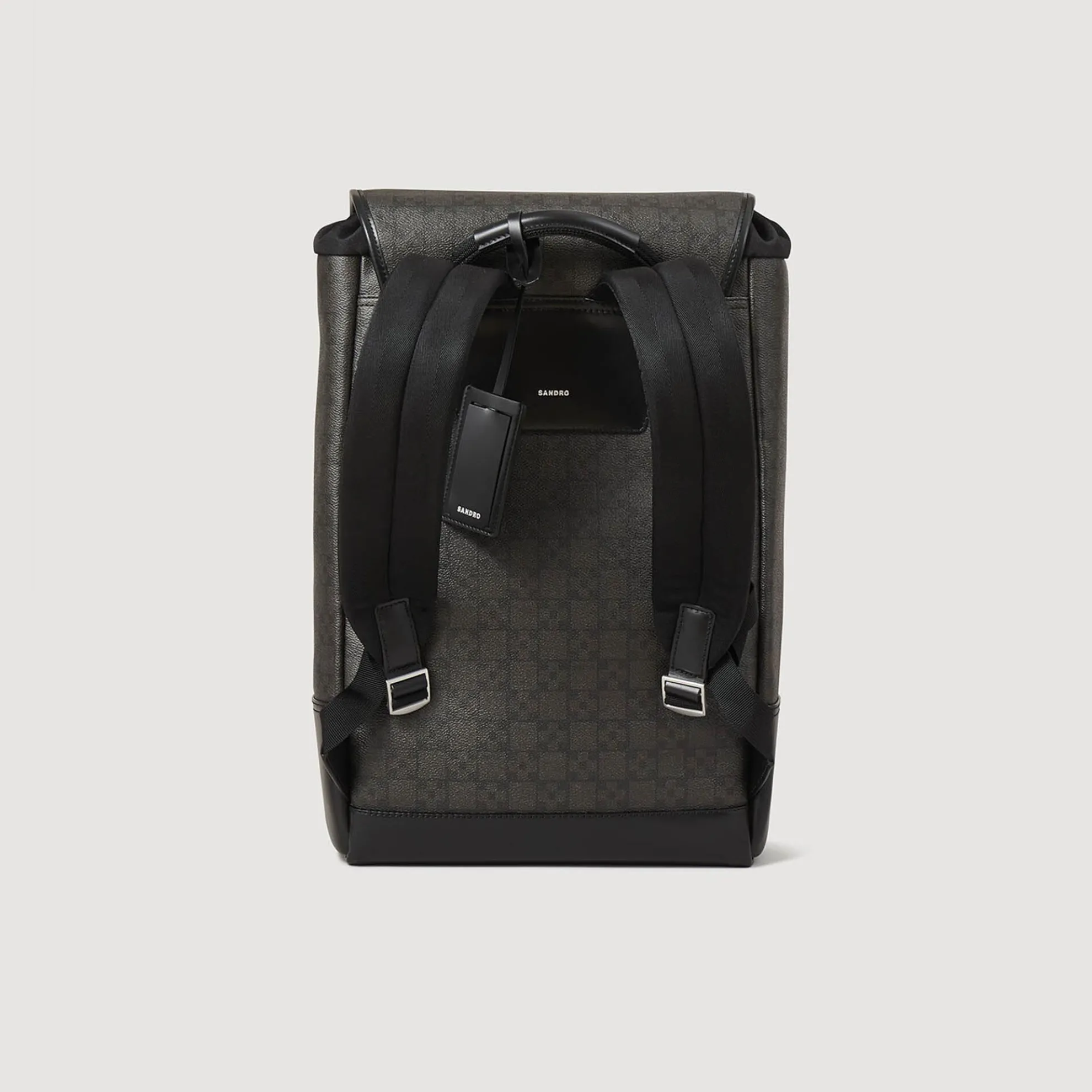 Rugzak van generfd gecoat canvas versierd met een Square Cross print, leren details en een zilveren opgedrukt Sandro-logo; voorzien van een klep met verstelbare gespen, een met leer bekleed handvat, interne opbergvakken en gevoerde schouderbanden met metalen stoppers.