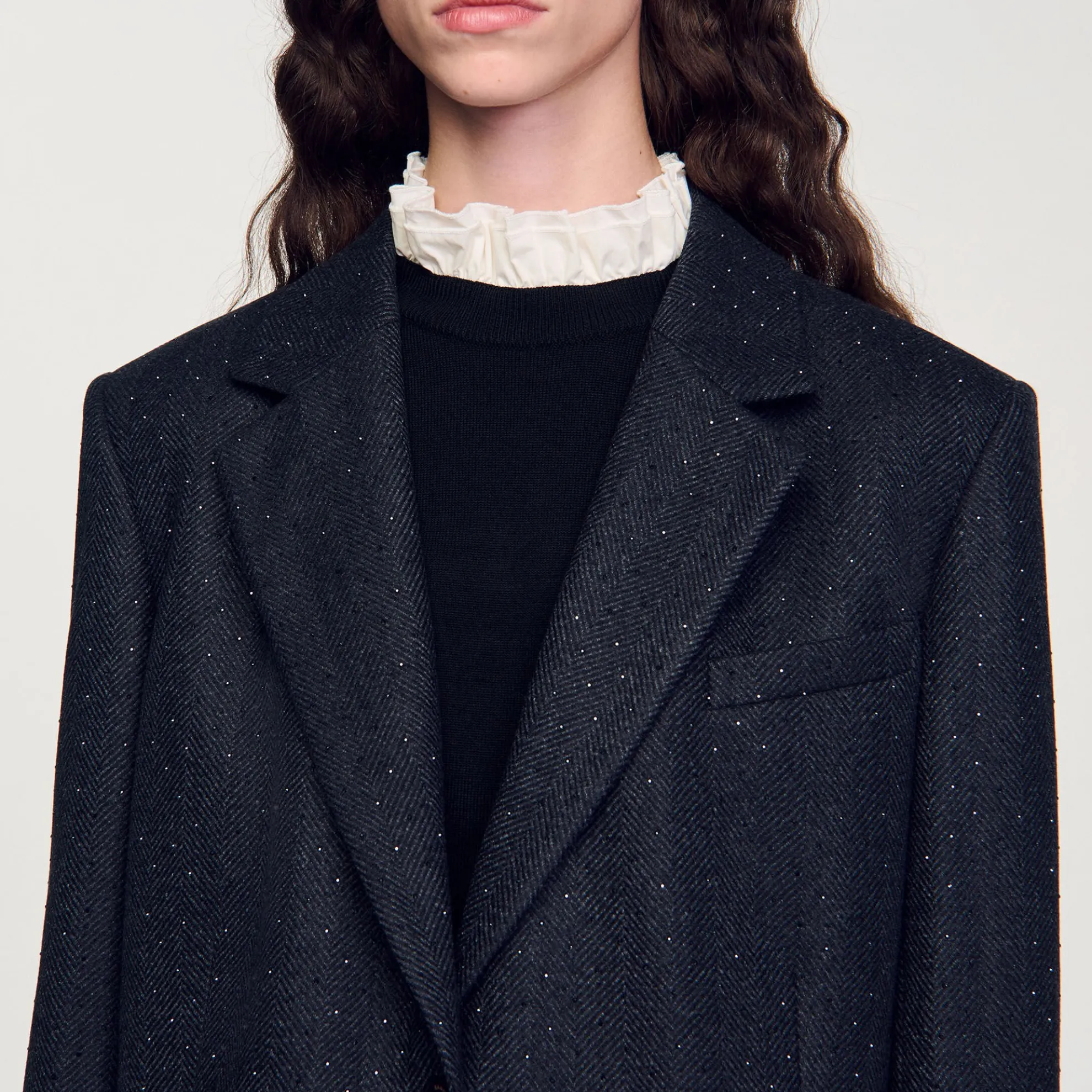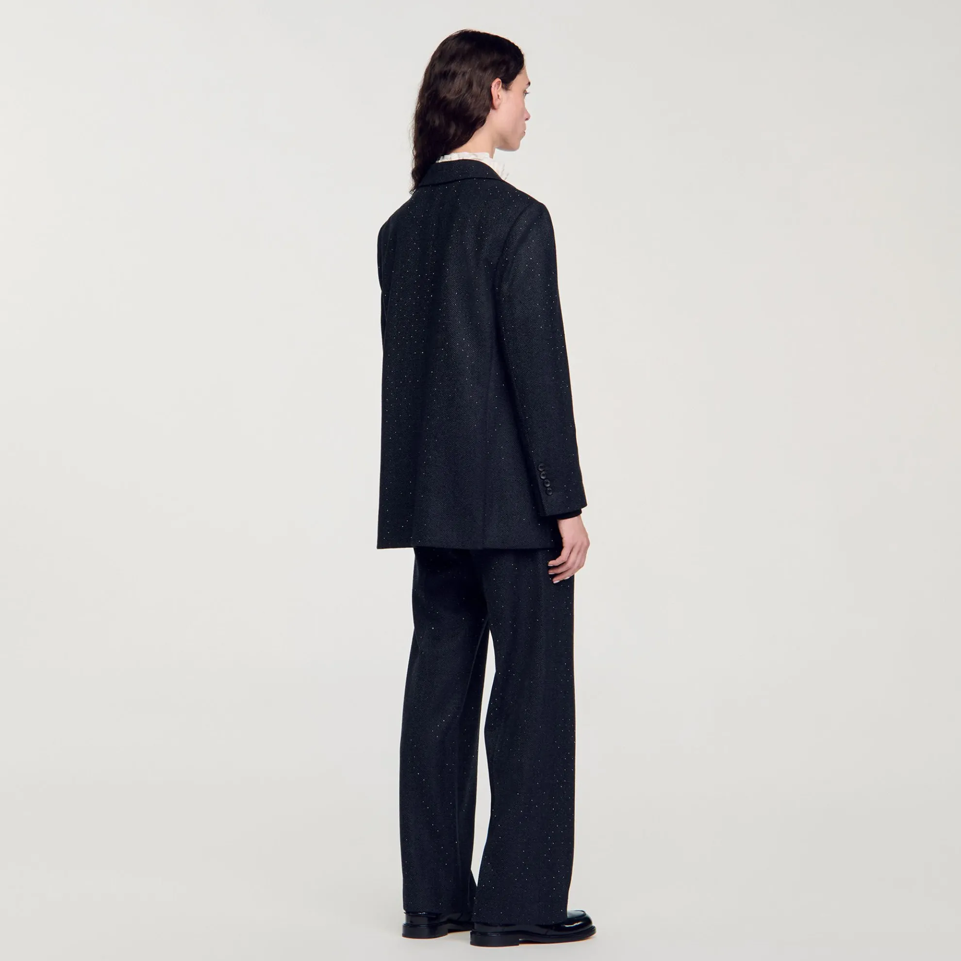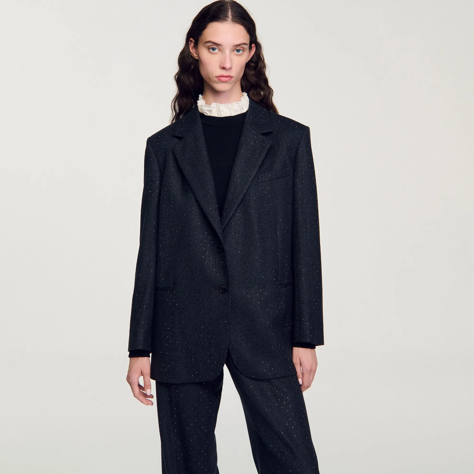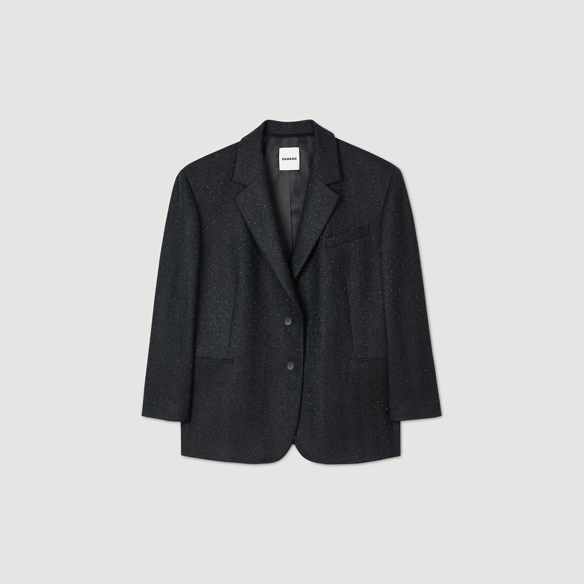 Ruimvallend colbert met visgraatmotief volledig versierd met stras, uitgevoerd met lange mouwen, paspelzakken en een split aan de achterkant.
