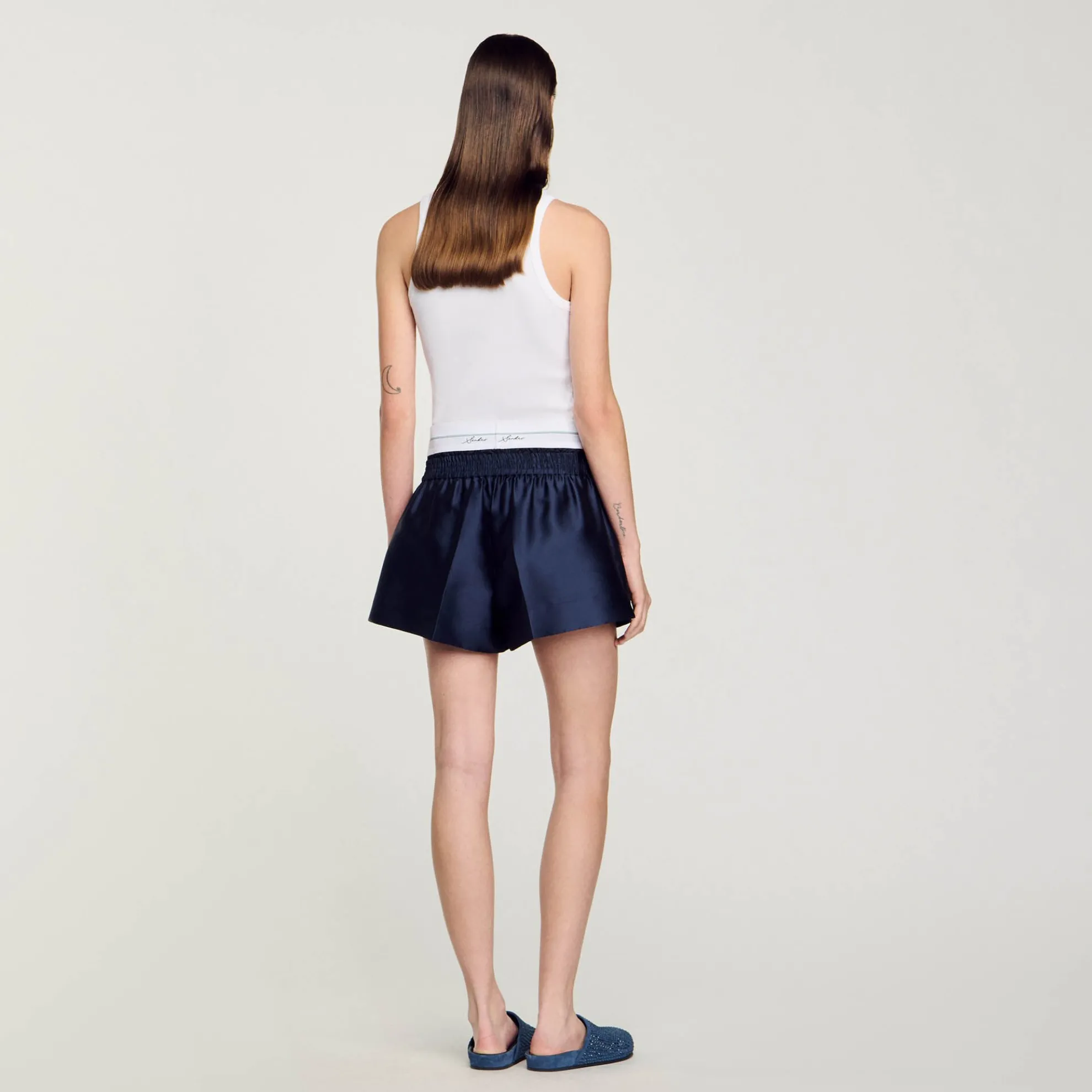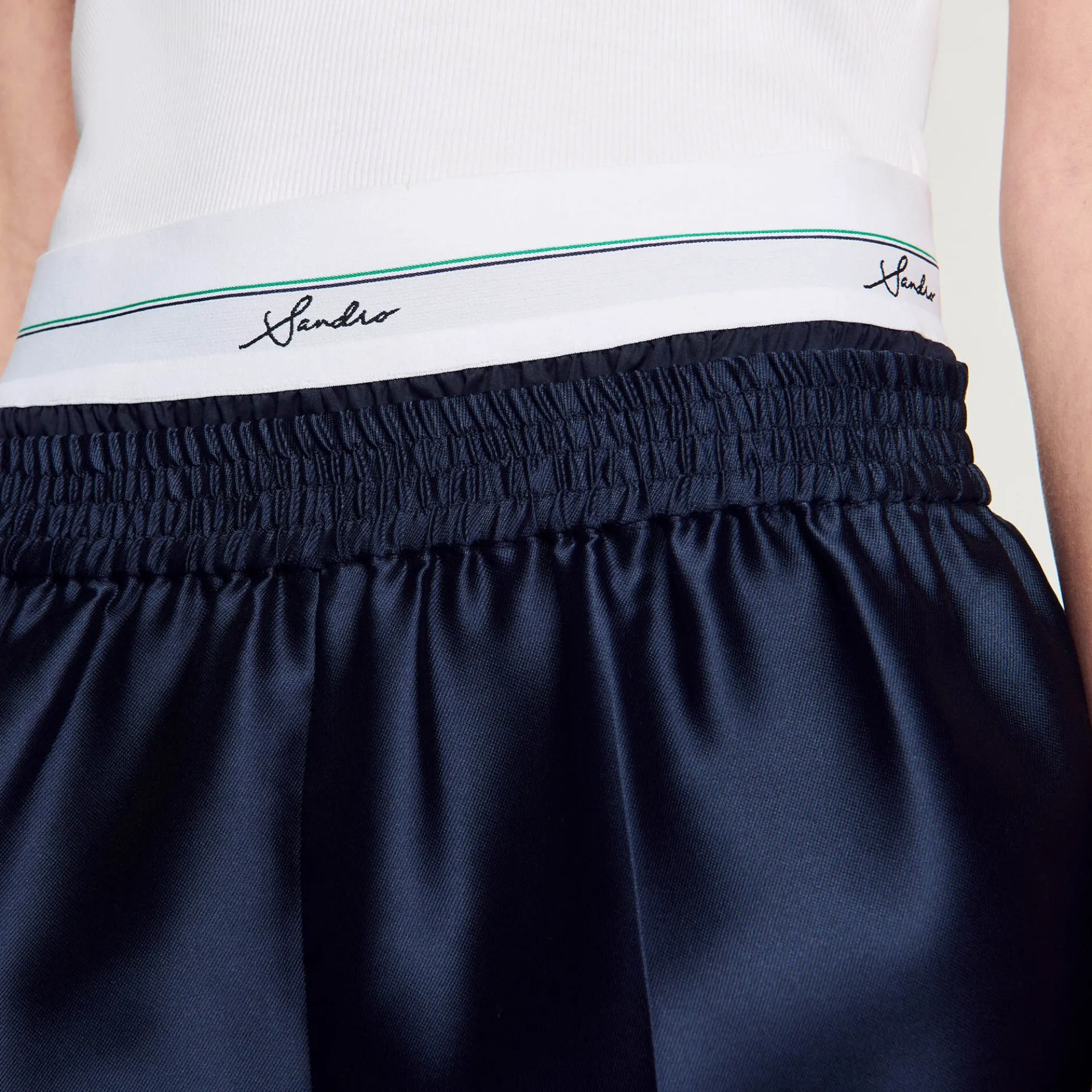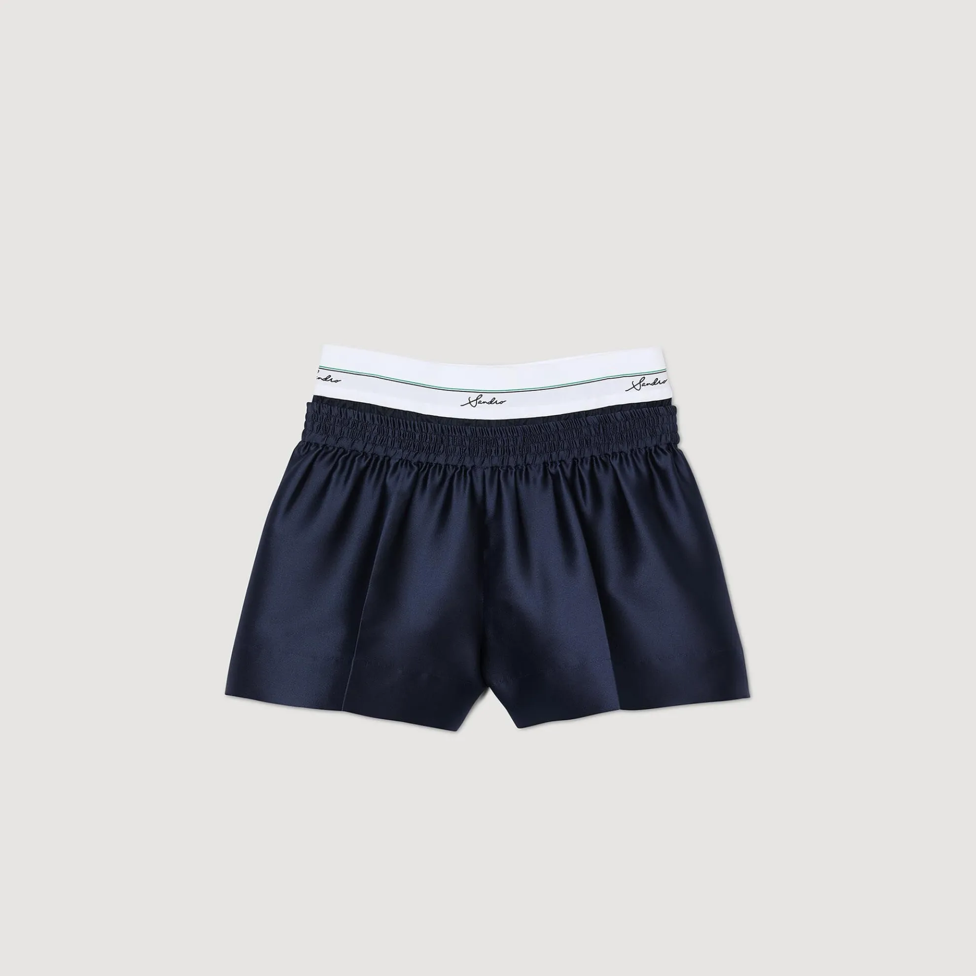 Volumineuze 2-in-1 short van zware satijnen stof met contrasterende trompe l’oeil sportswear ceintuur en gesmokte tailleband