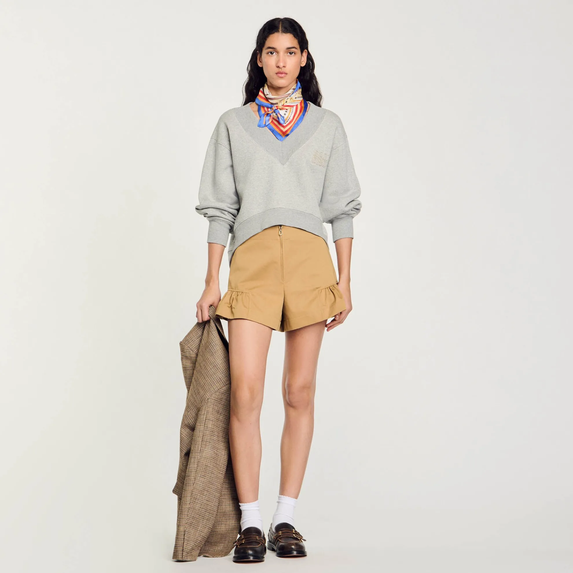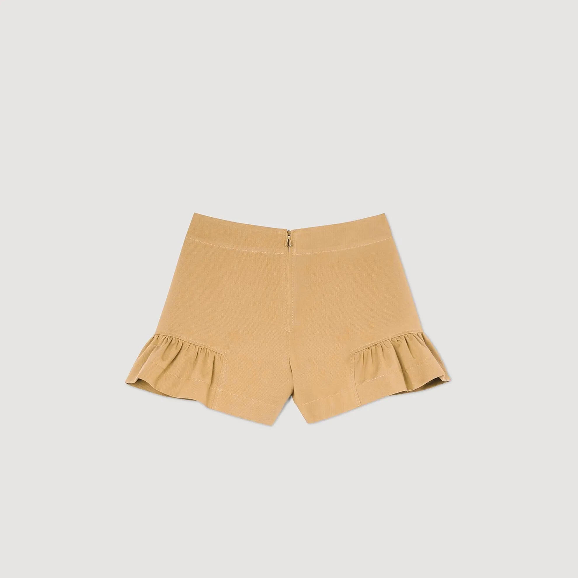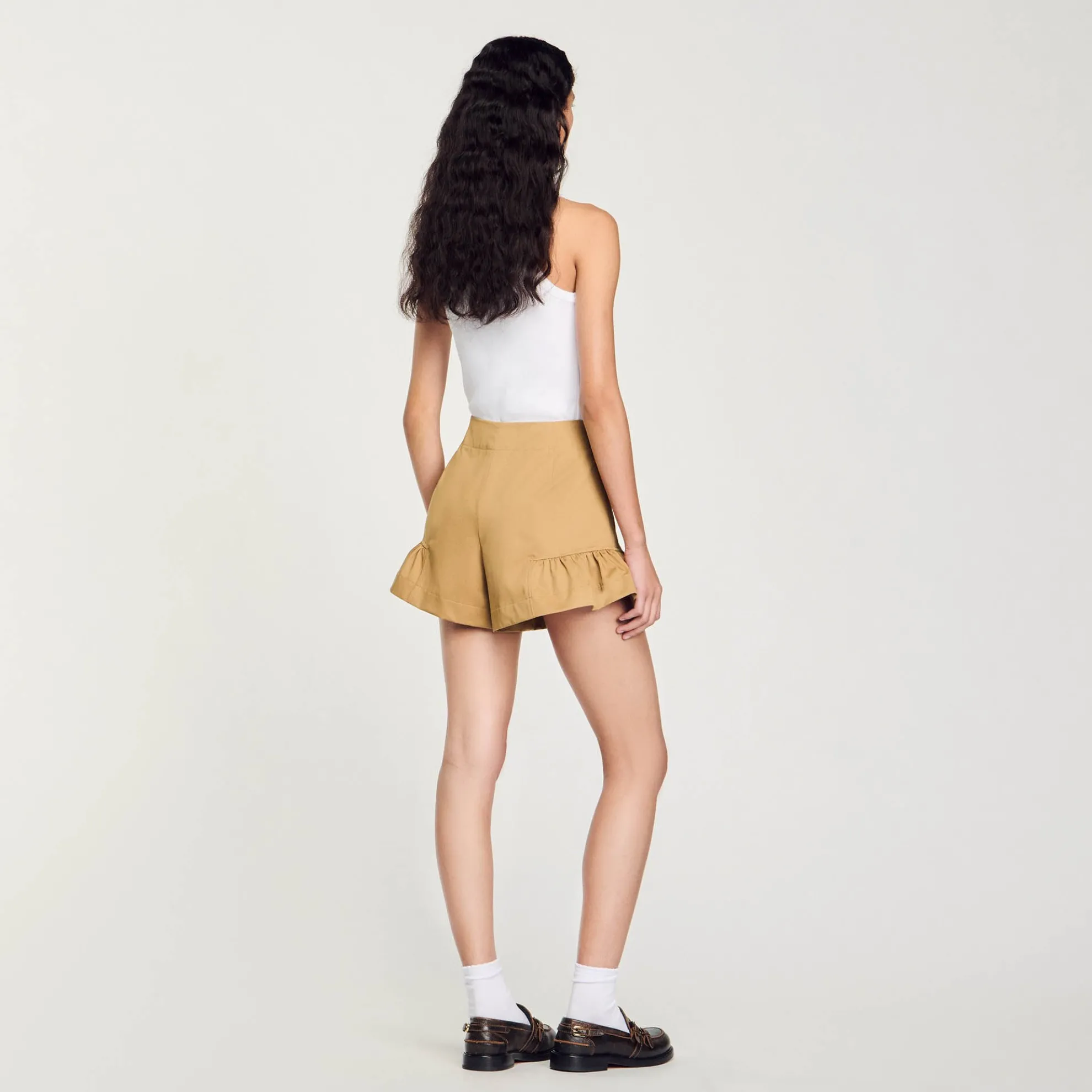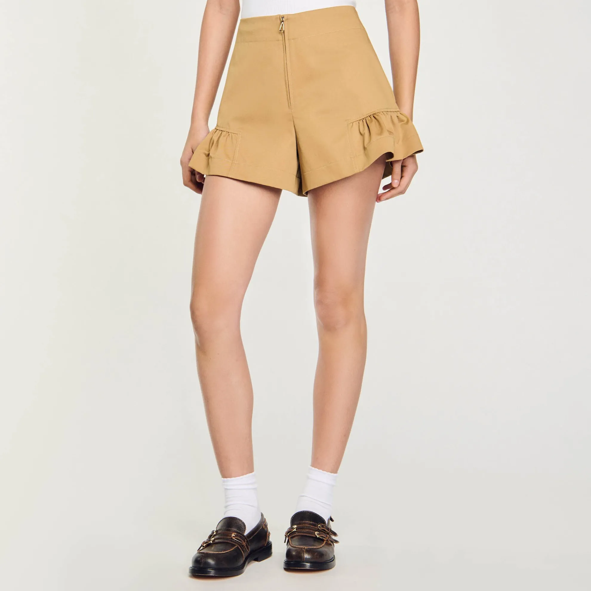 Kort licht uitlopend short met volants aan de zijkanten en een ritssluiting.