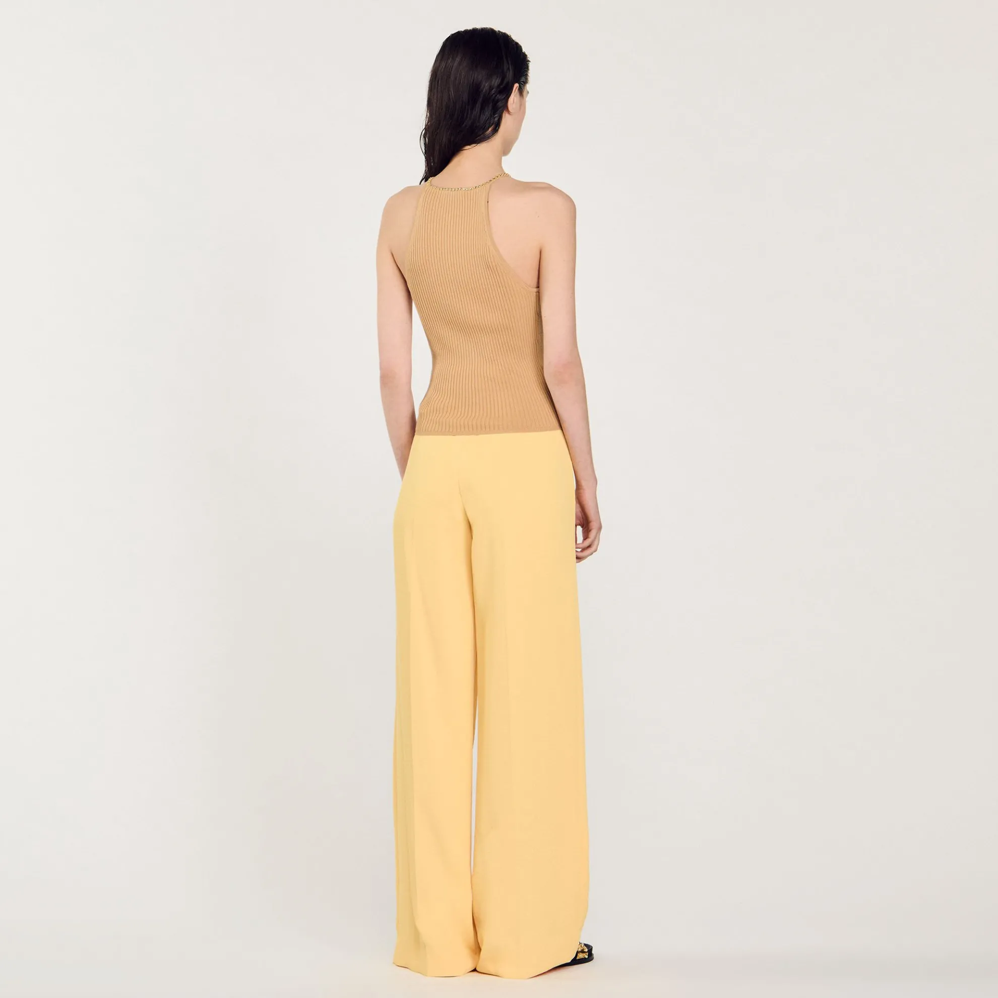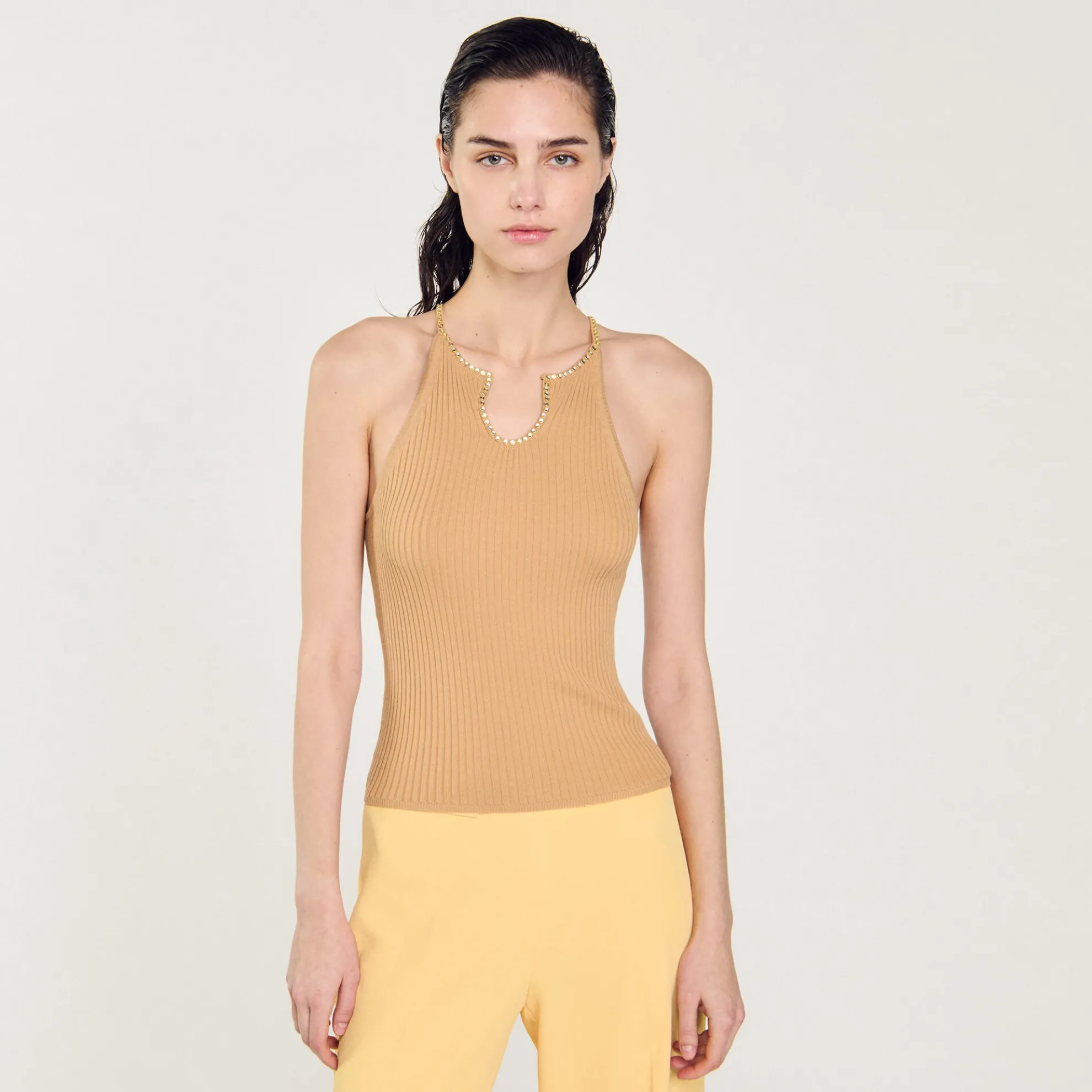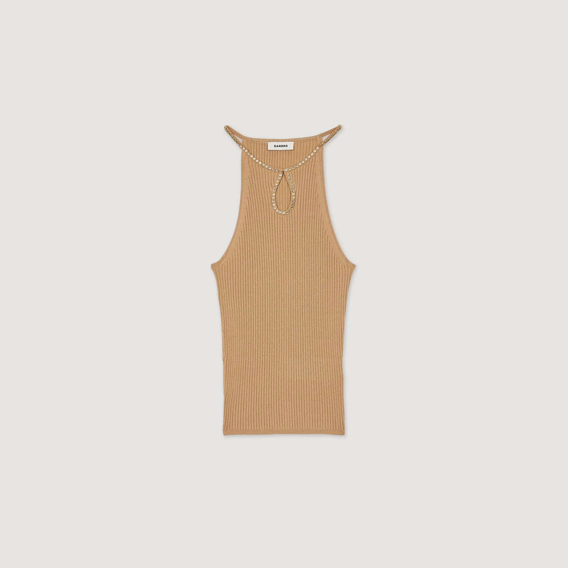 Mouwloos ribgebreid spencer vest met een kraag versierd met strassteentjes in druppelvorm.