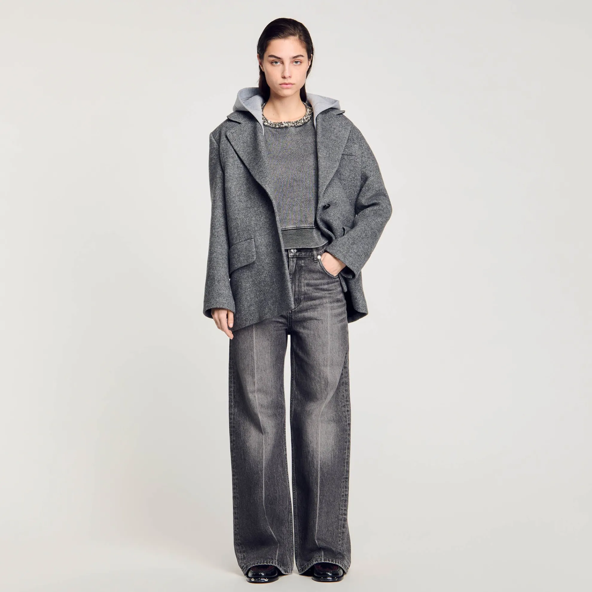 Korte, wijdvallende sweater van stone washed fleece met volumineuze lange mouwen en een ronde hals met stras.