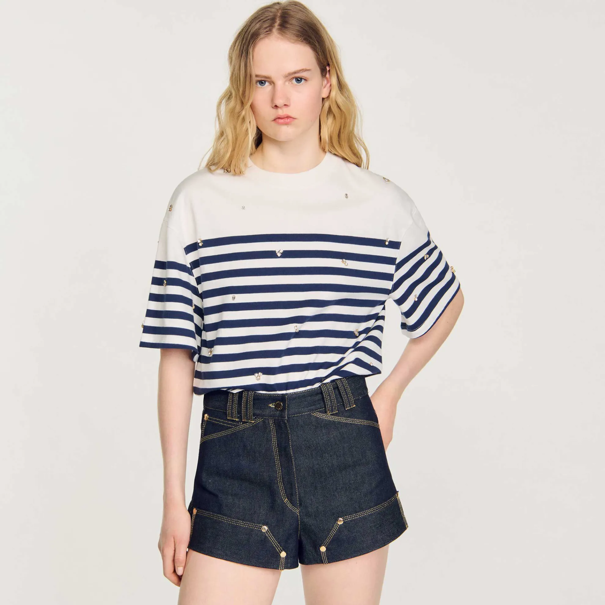 T-shirt in maritieme stijl met ronde hals, korte mouwen, contrasterende strepen en gezette geborduurde stras.