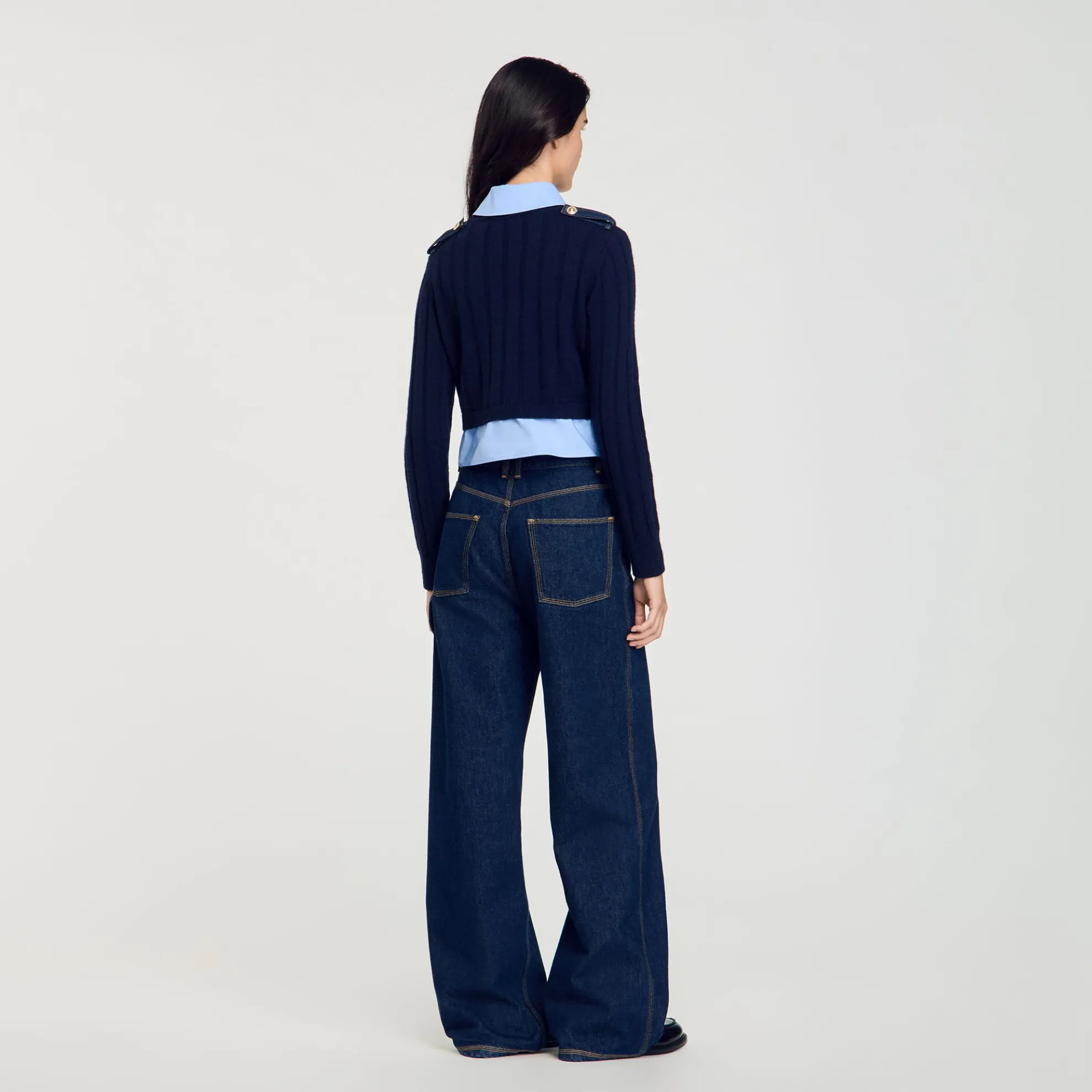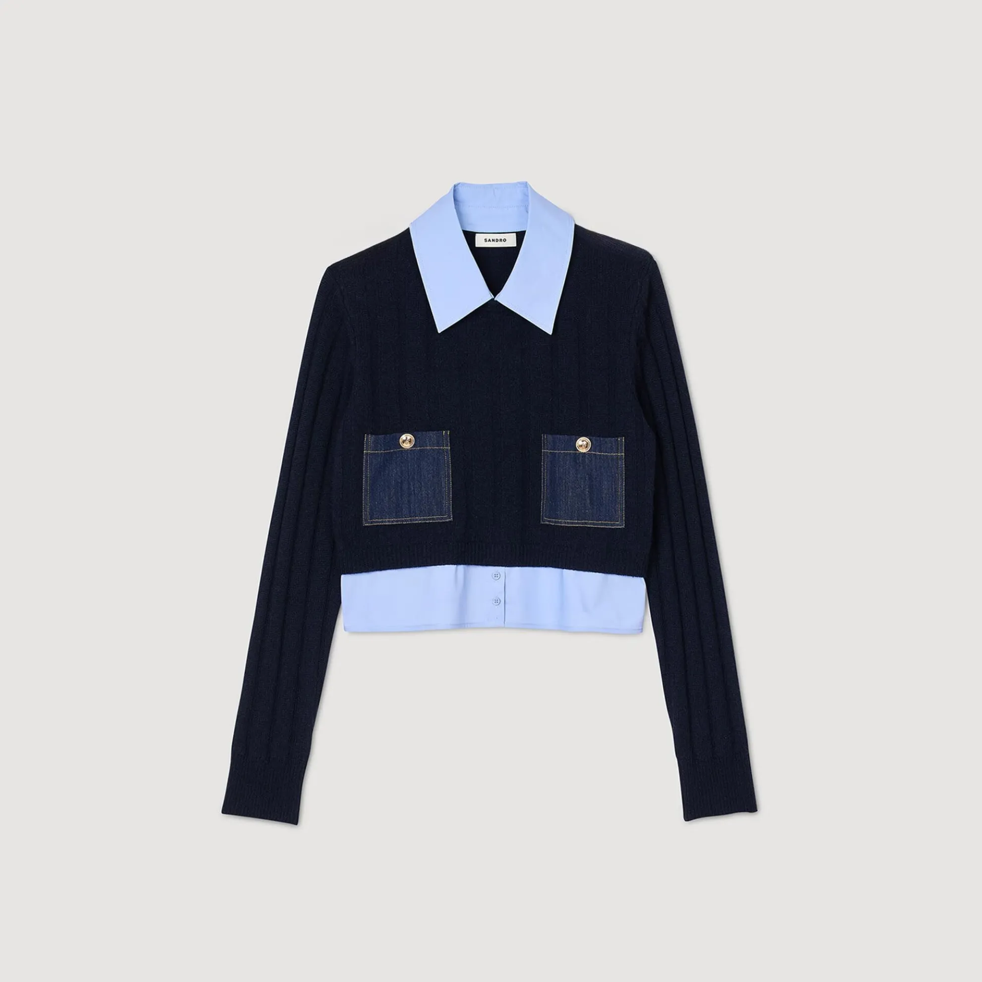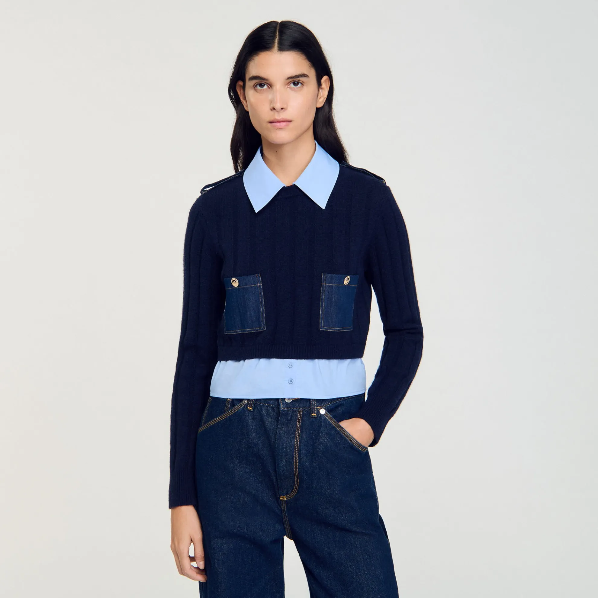 Trompe l’oeil-trui van gebreide wol en kasjmier met inzetstukken in overhemdlook bij de kraag en zoom, lange mouwen en opgestikte denimzakken aan de voorkant.