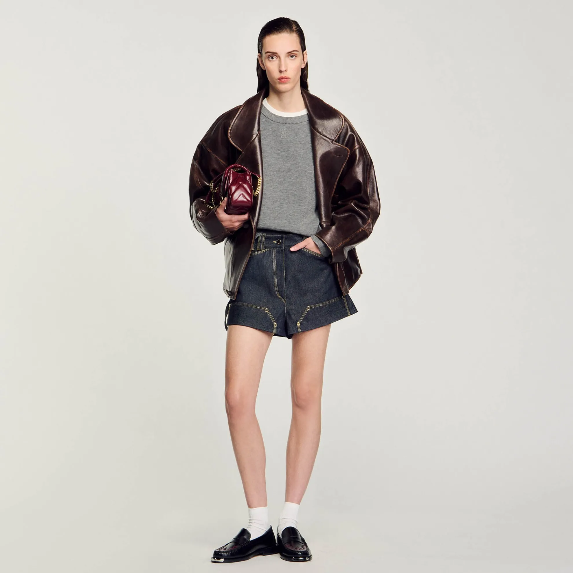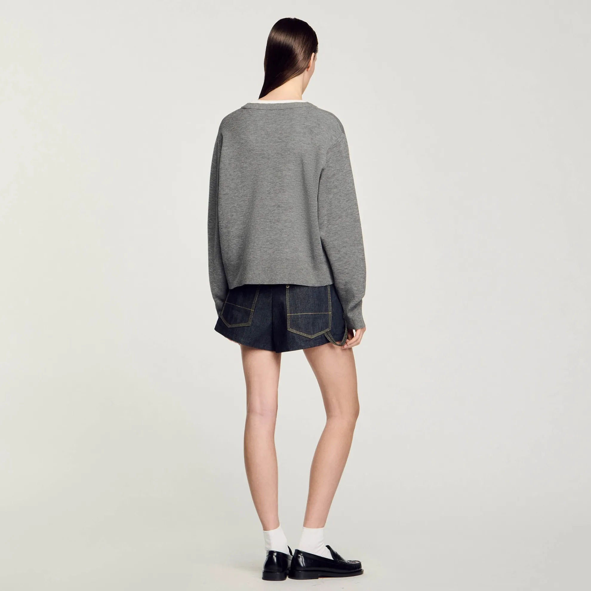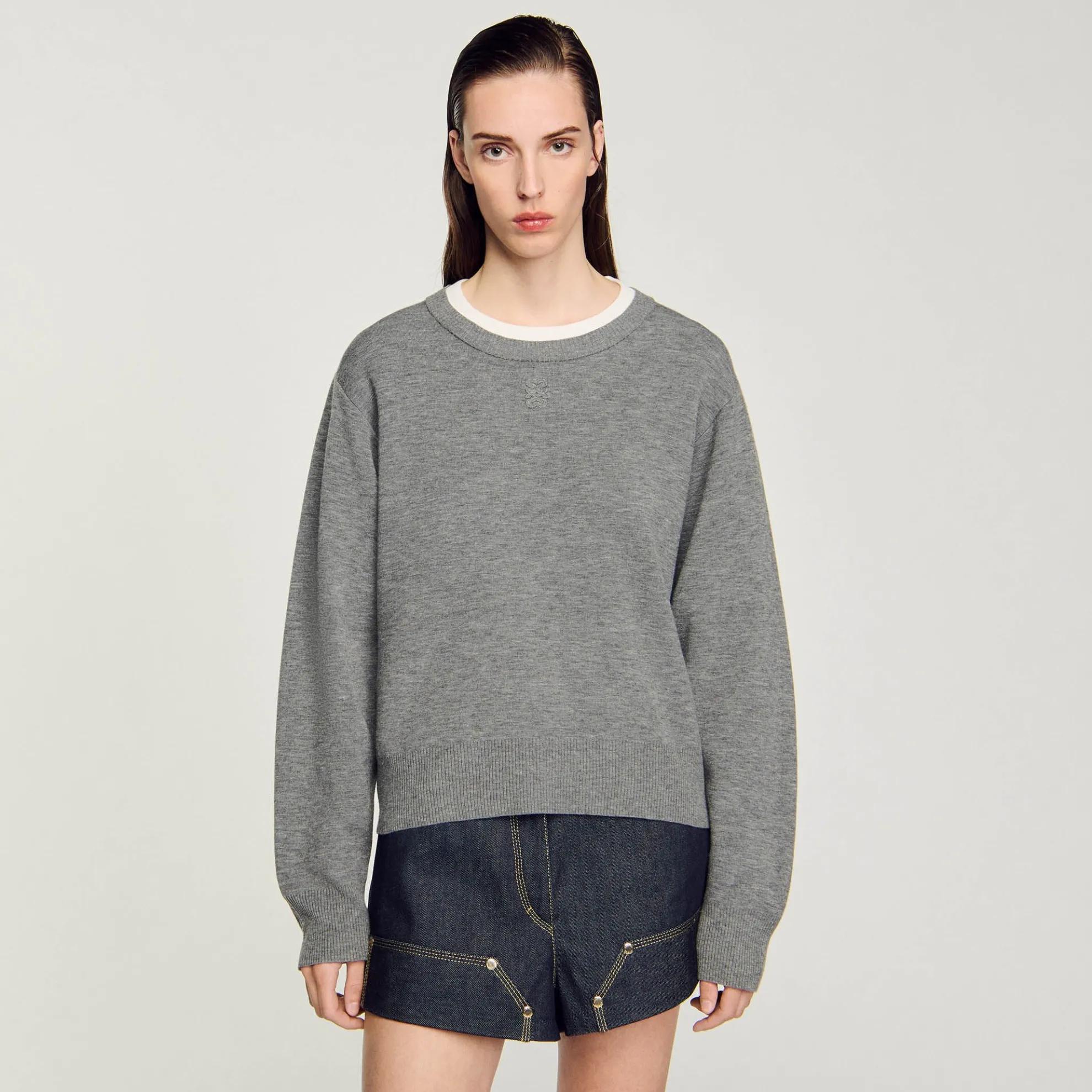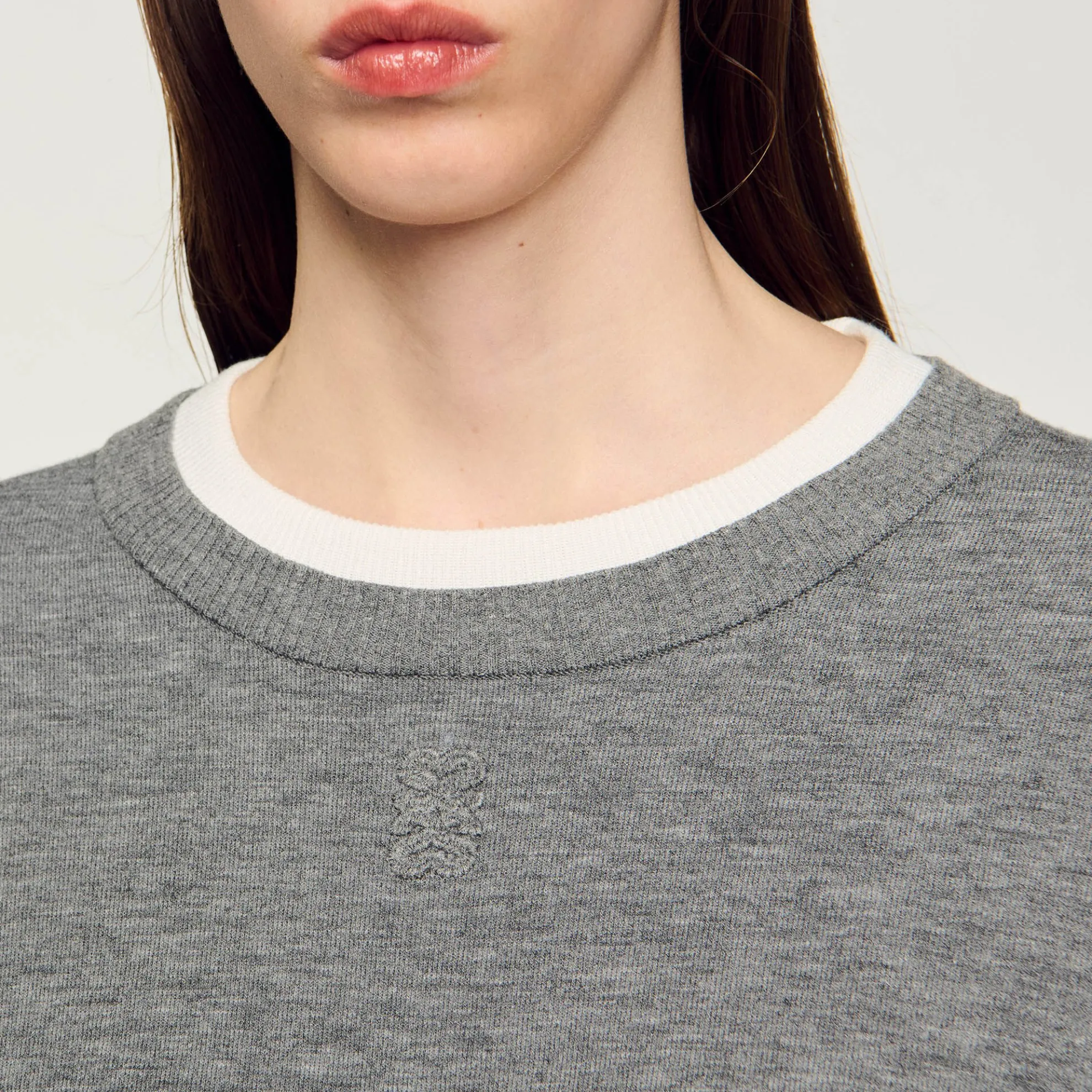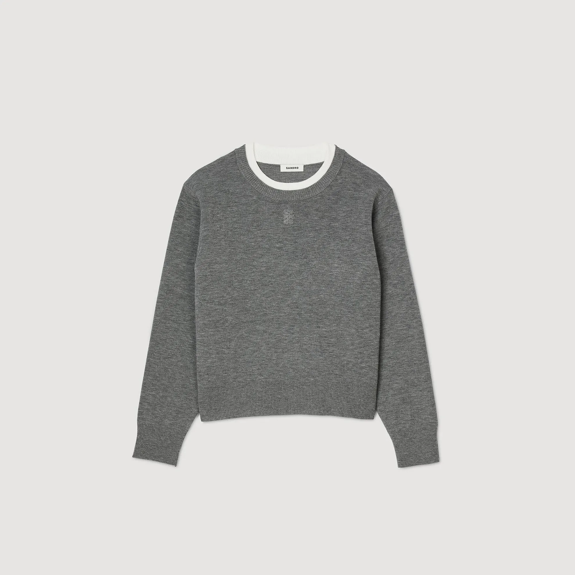 Gebreide trui met lange mouwen en een ronde hals versierd met een contrasterende trompe l’oeil band.