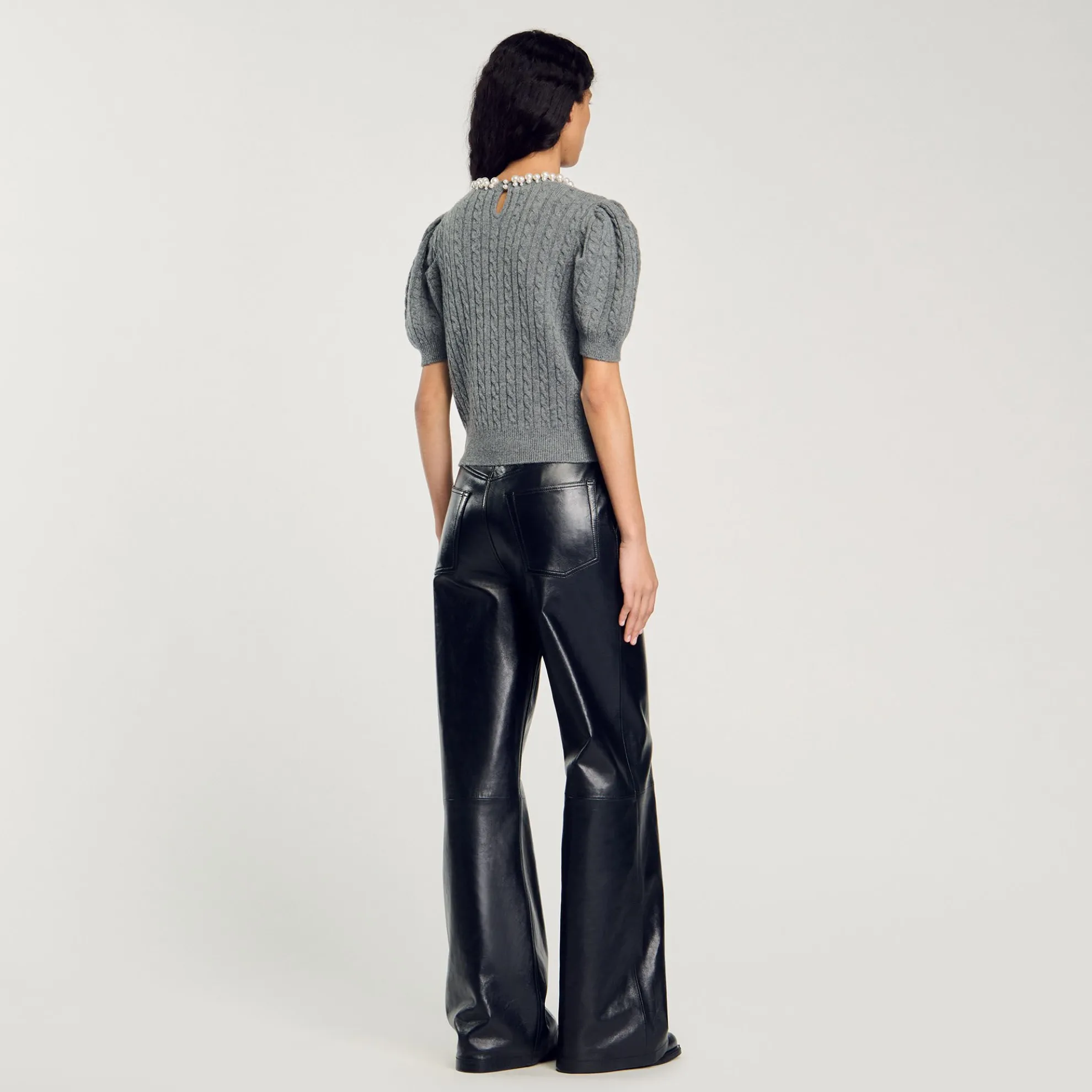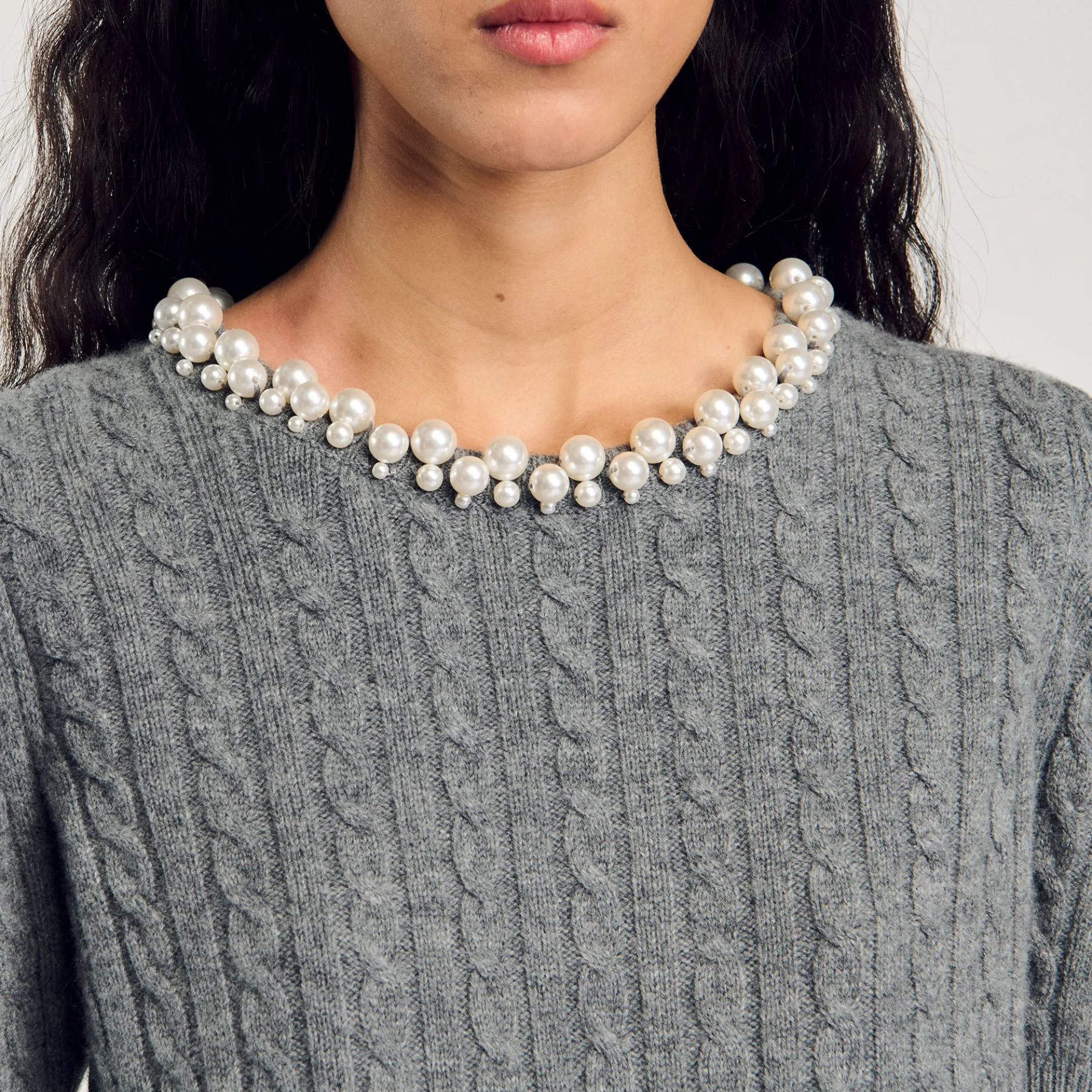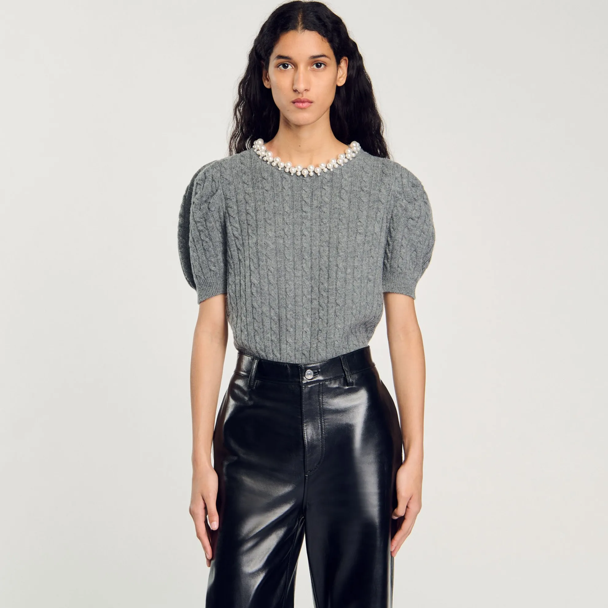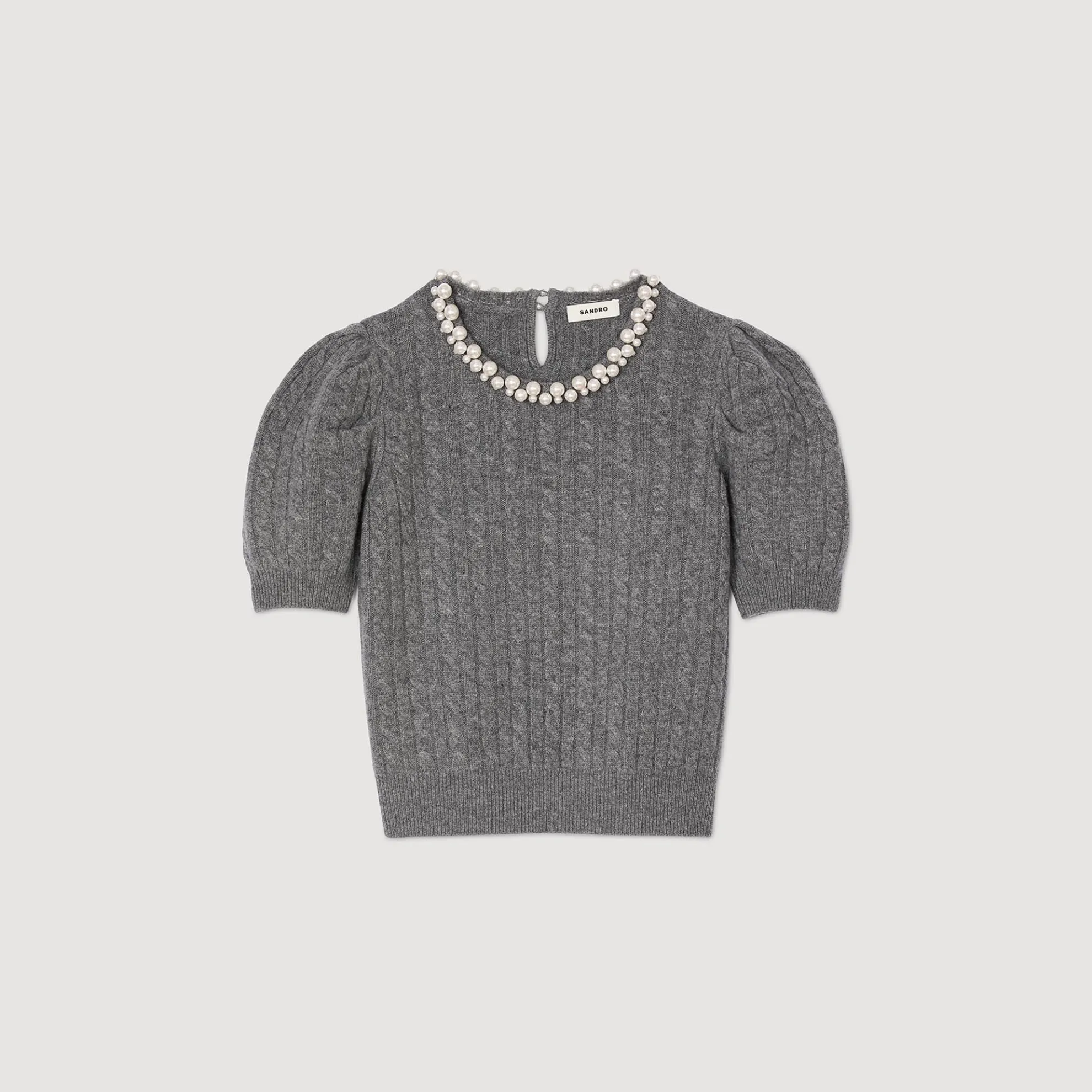 Trui van kabelgebreide wol en kasjmier met korte mouwen en een ronde hals met parels.