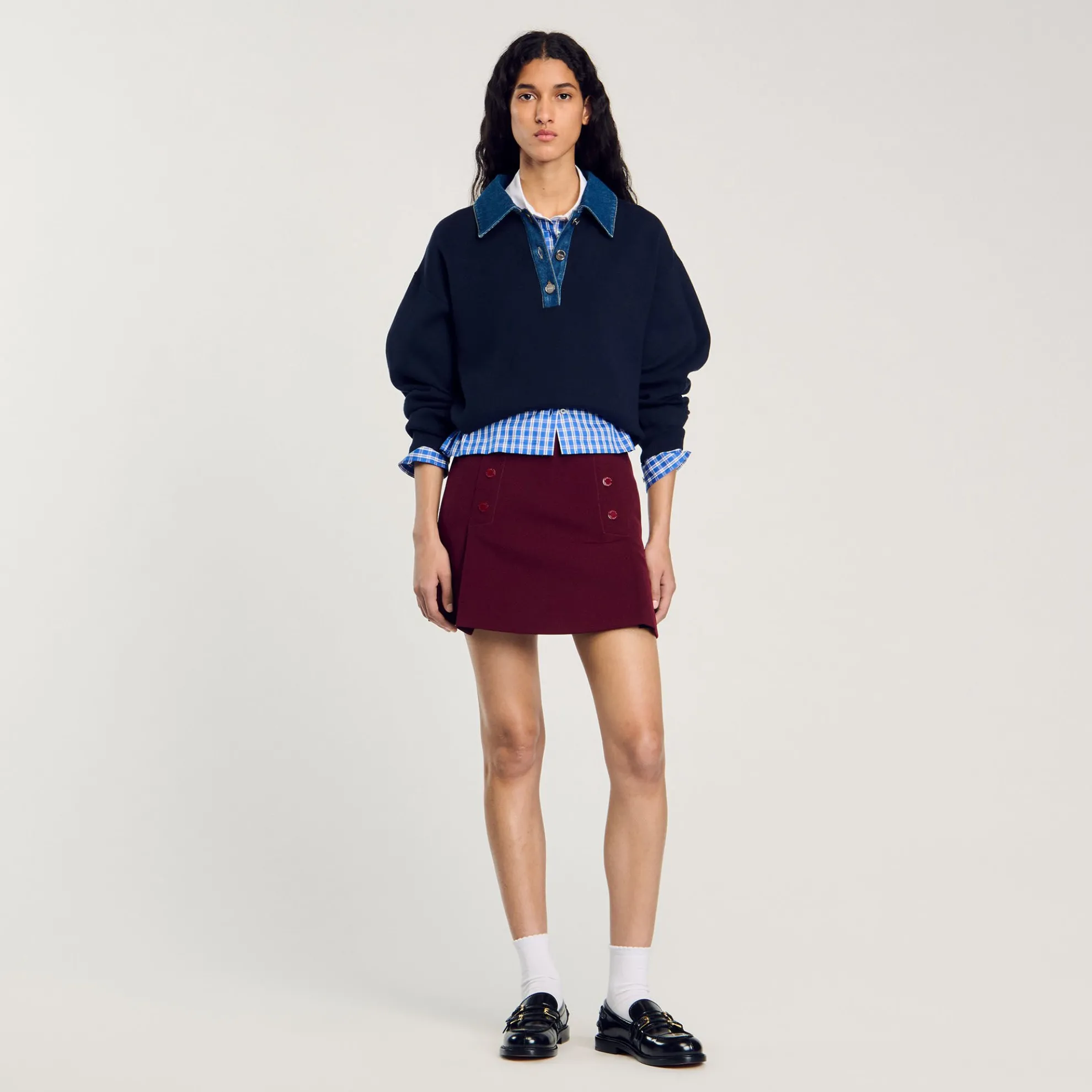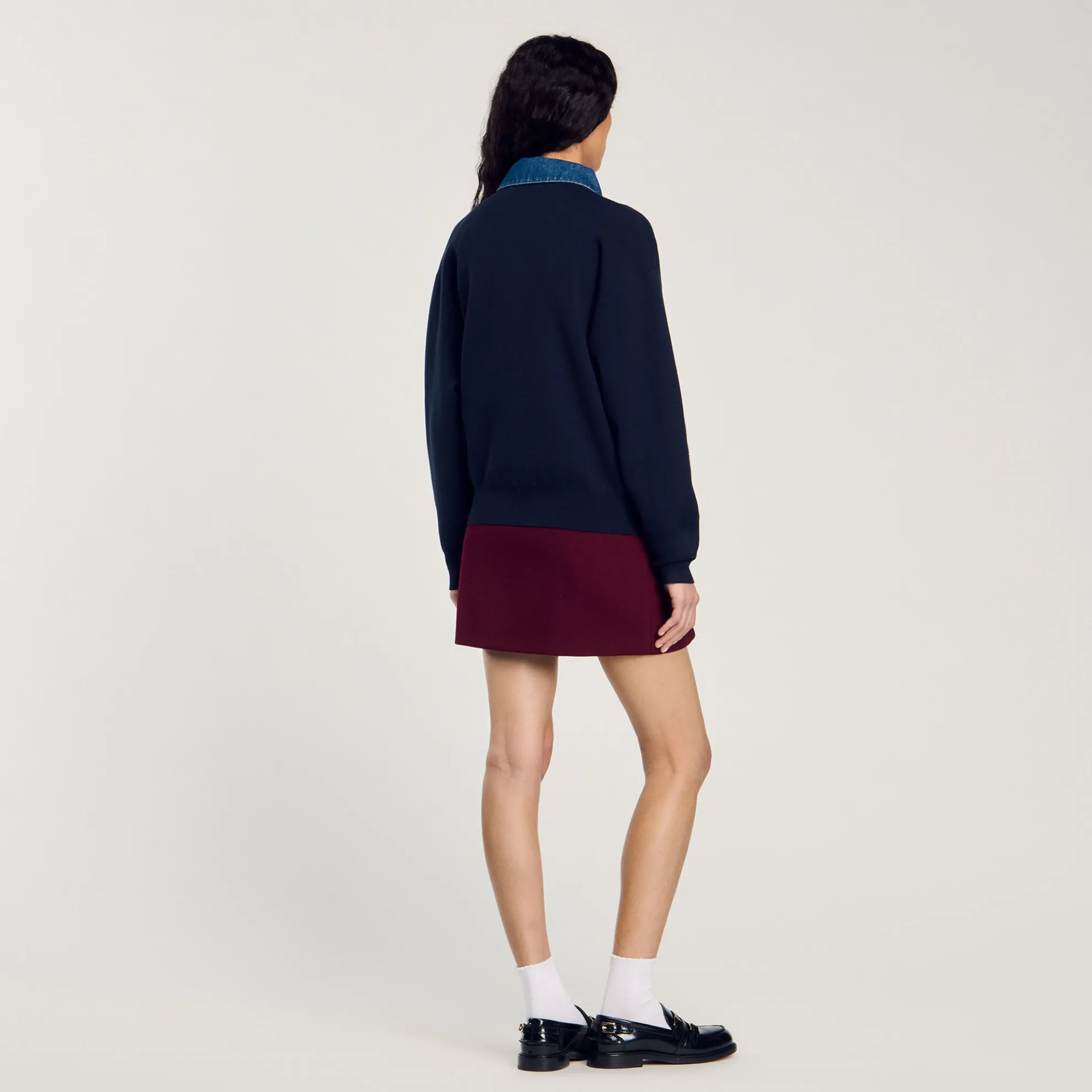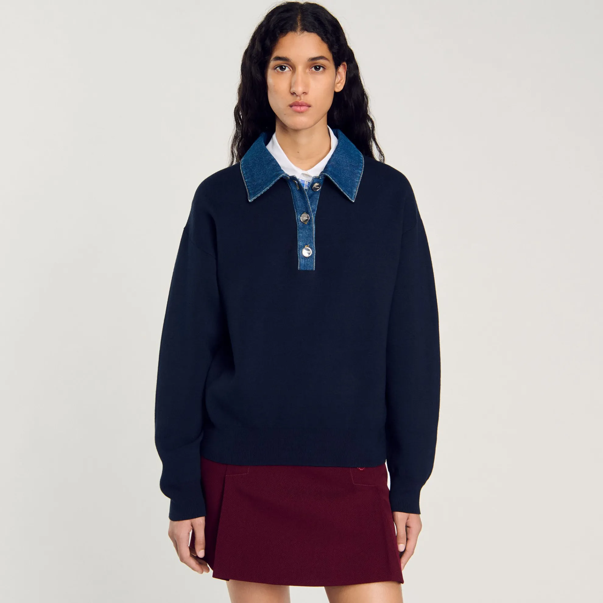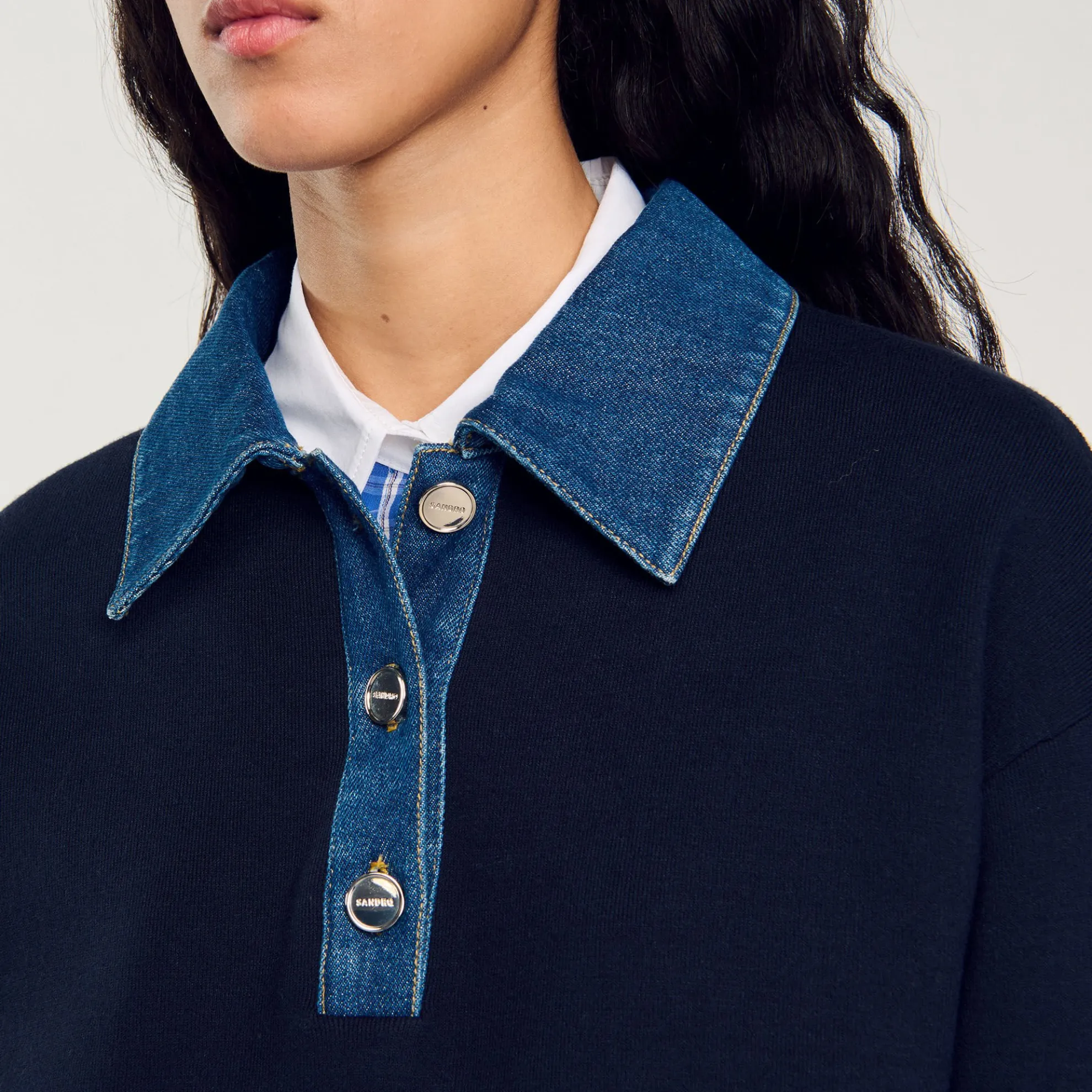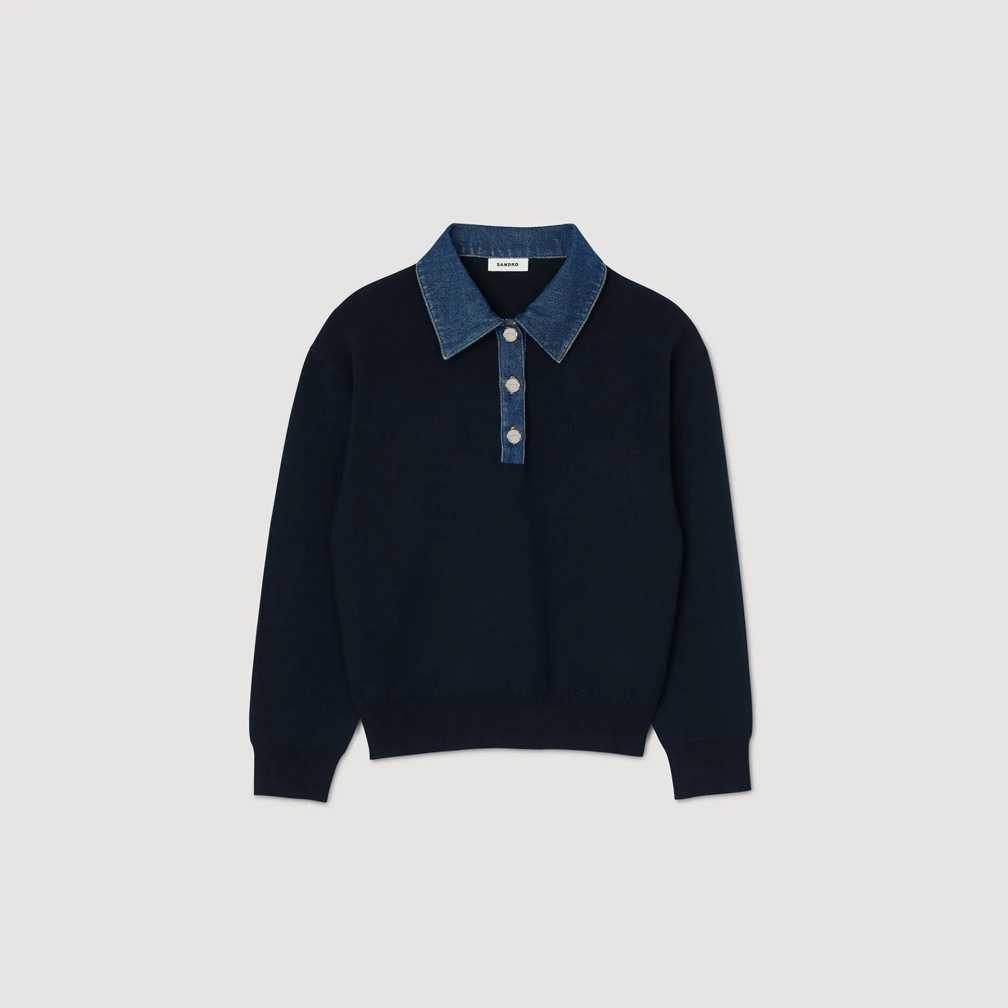 Tricot trui met polokraag van spijkerstof met knoopjes, lange mouwen met strakke manchetten.