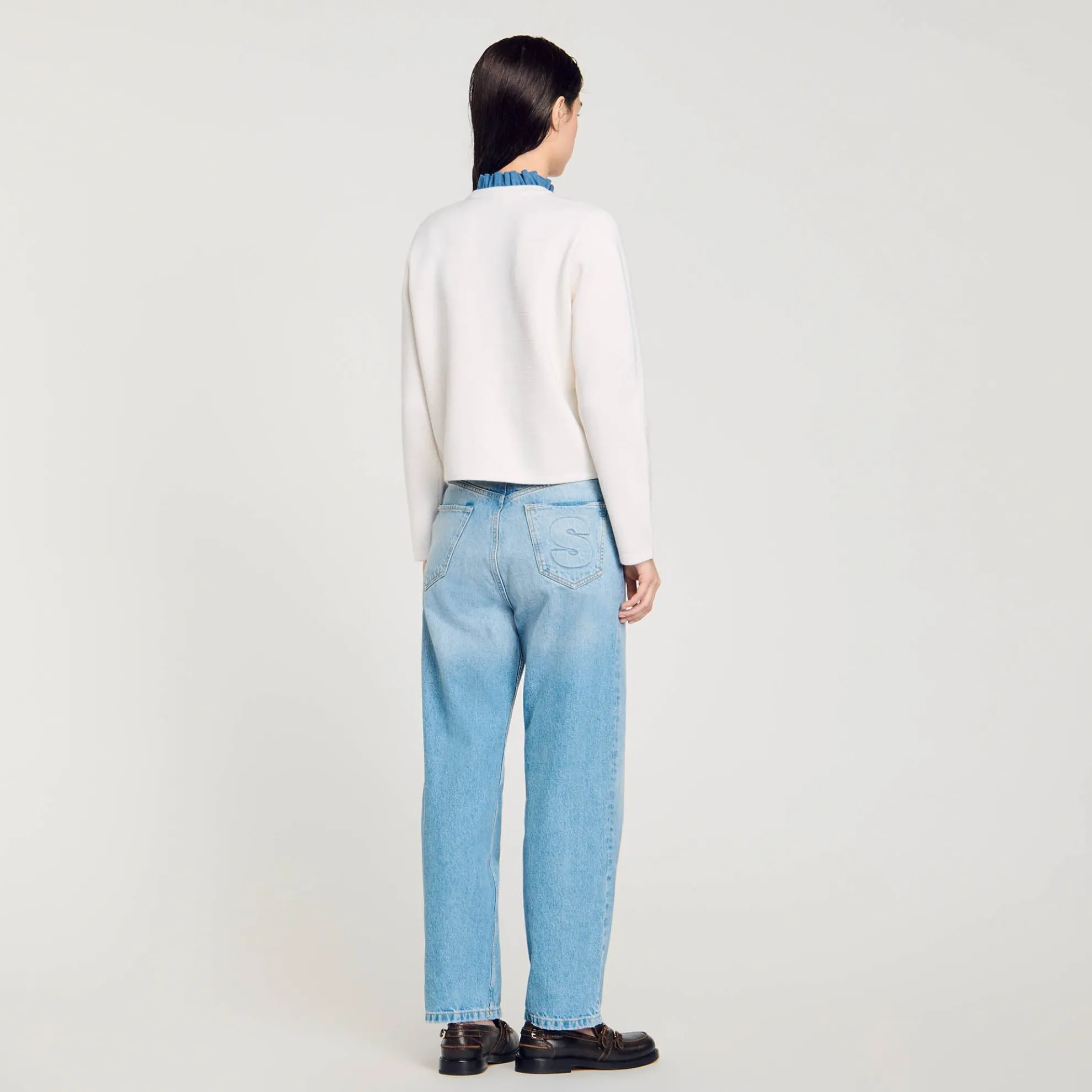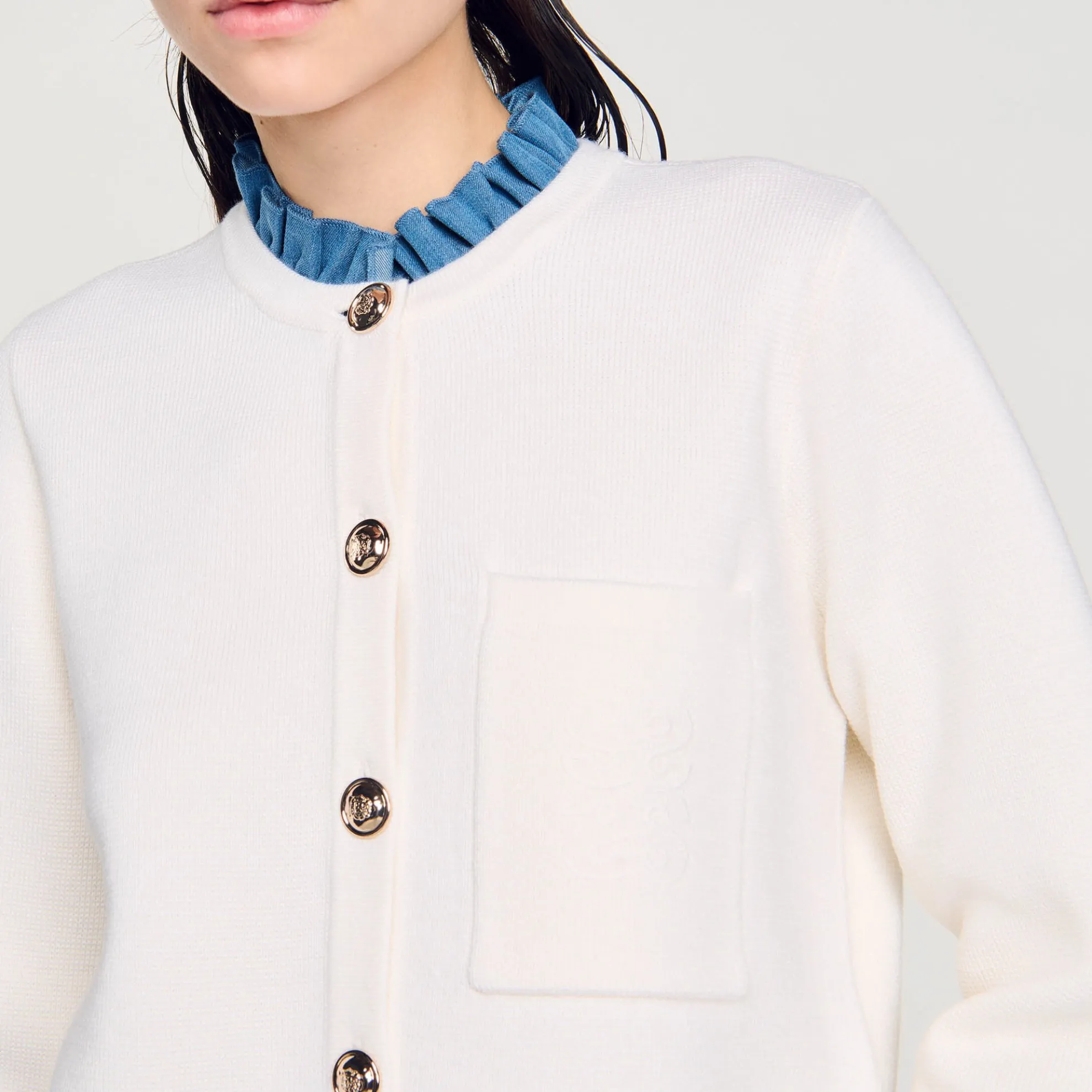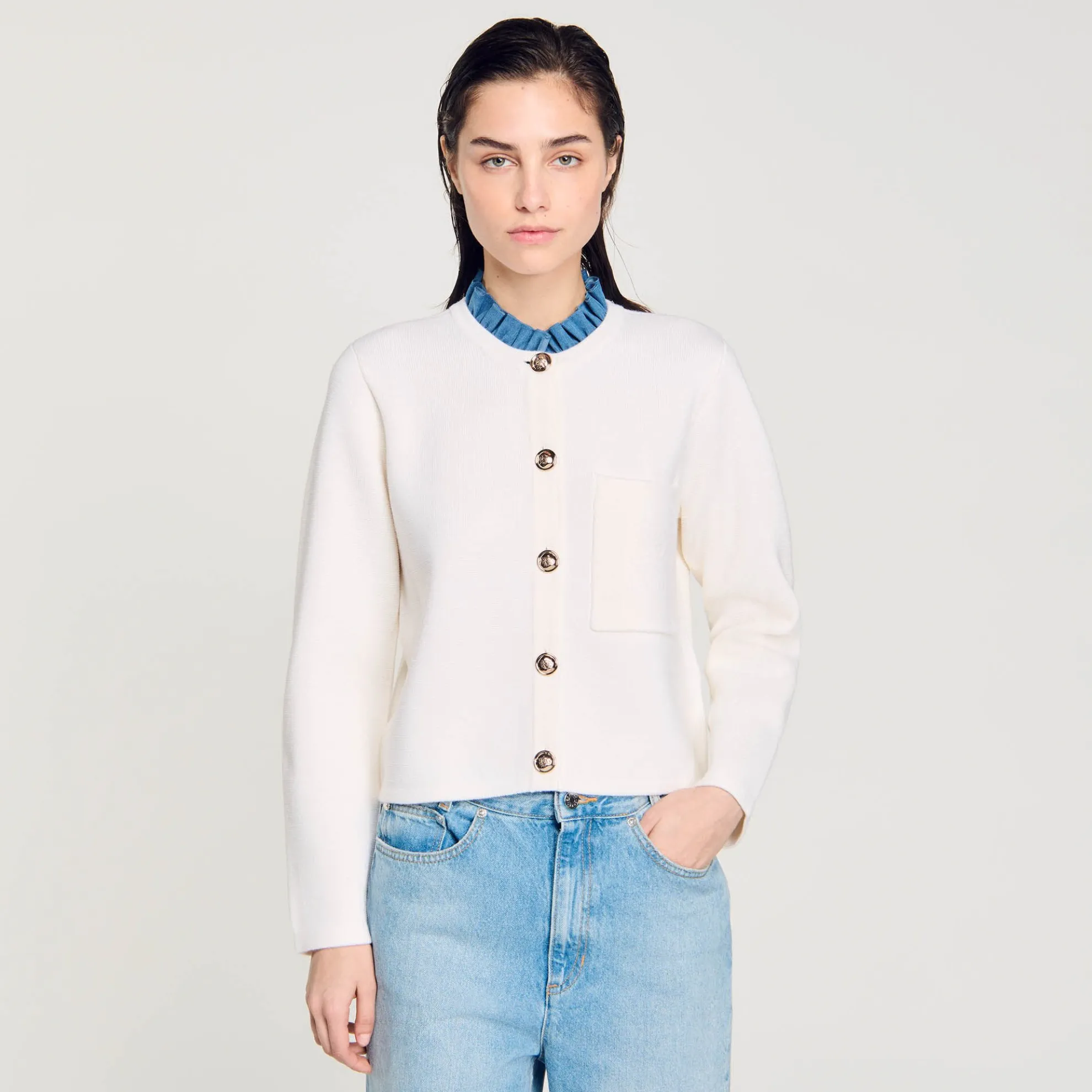 Gebreid vest in fantasiesteek met ronde hals met afneembare contrasterende volants, lange mouwen, knoopsluiting met sierknopen en opgestikte zak op de borst.