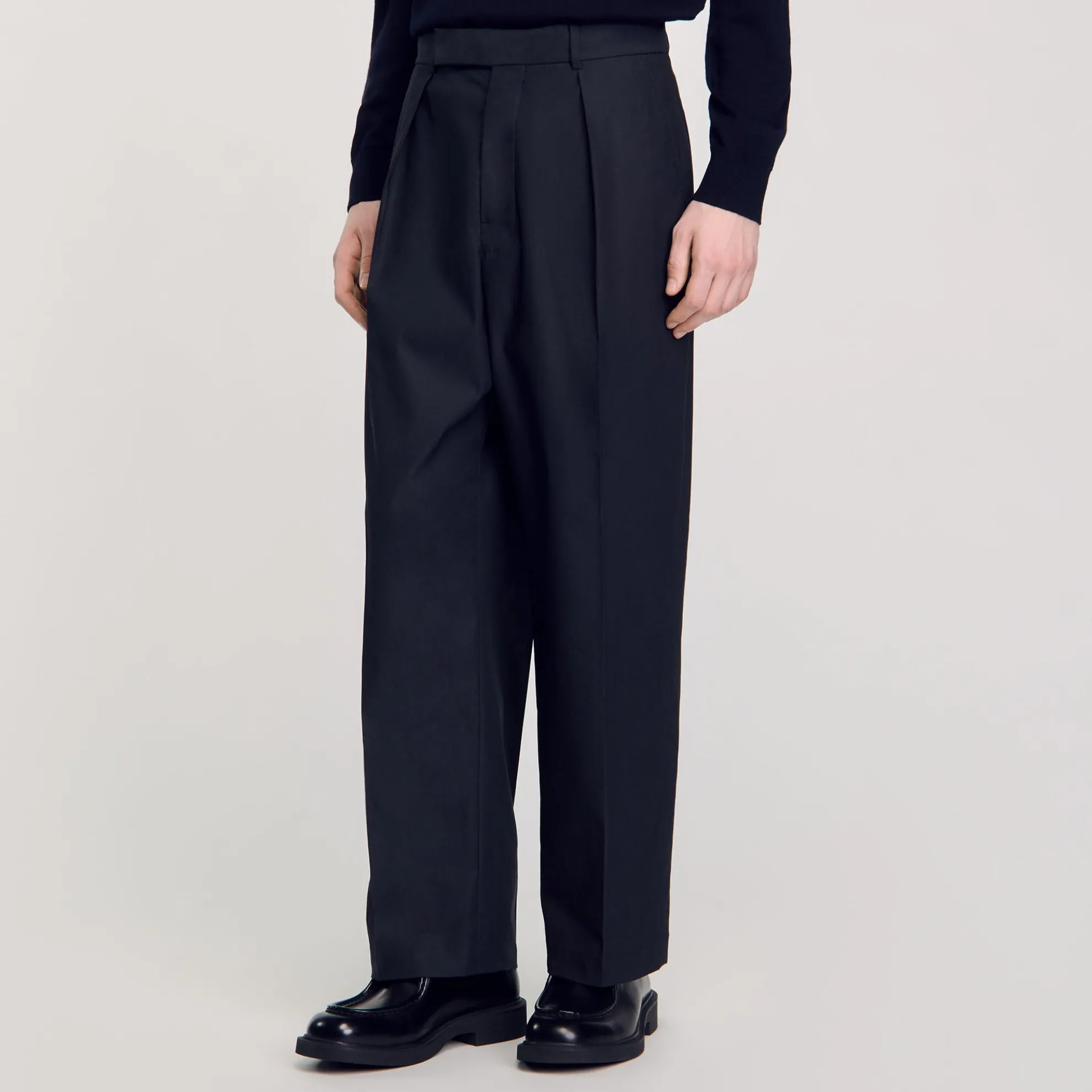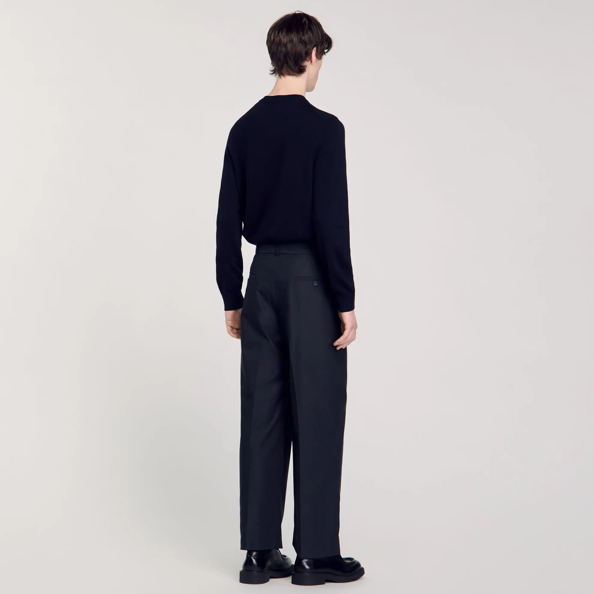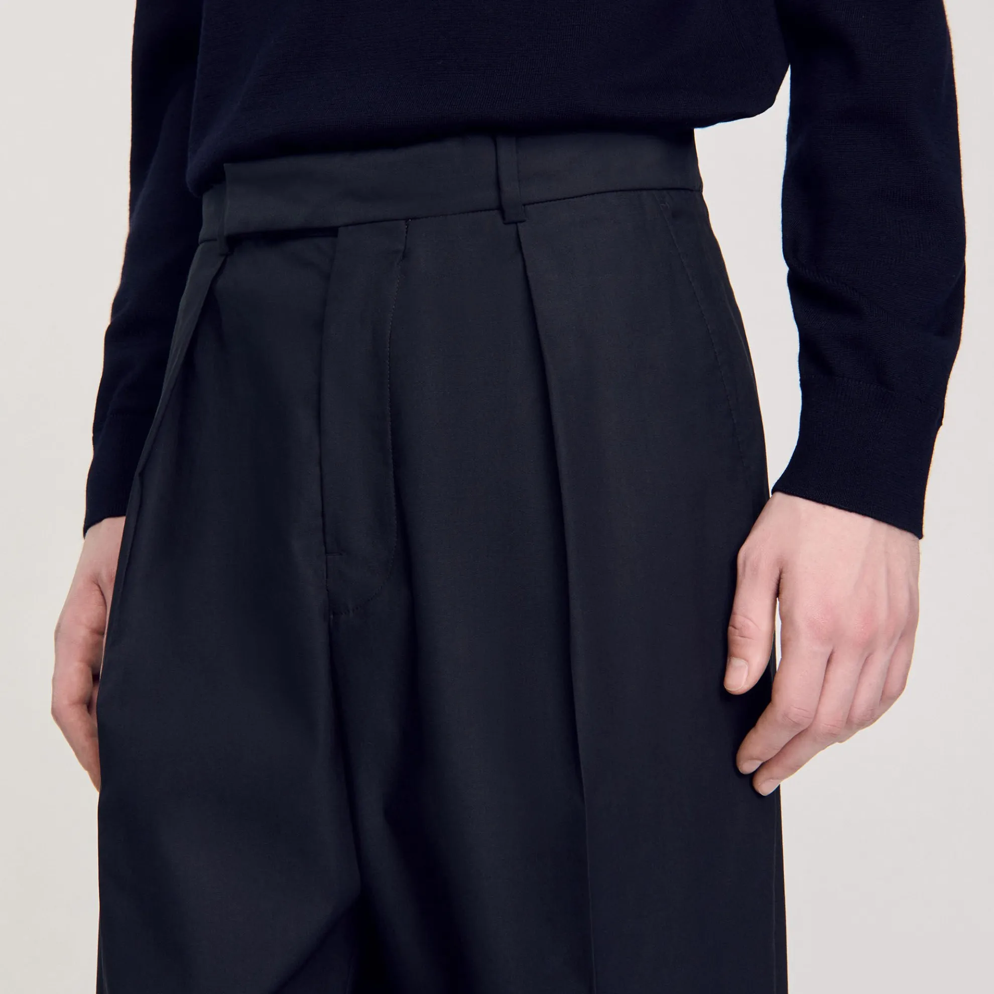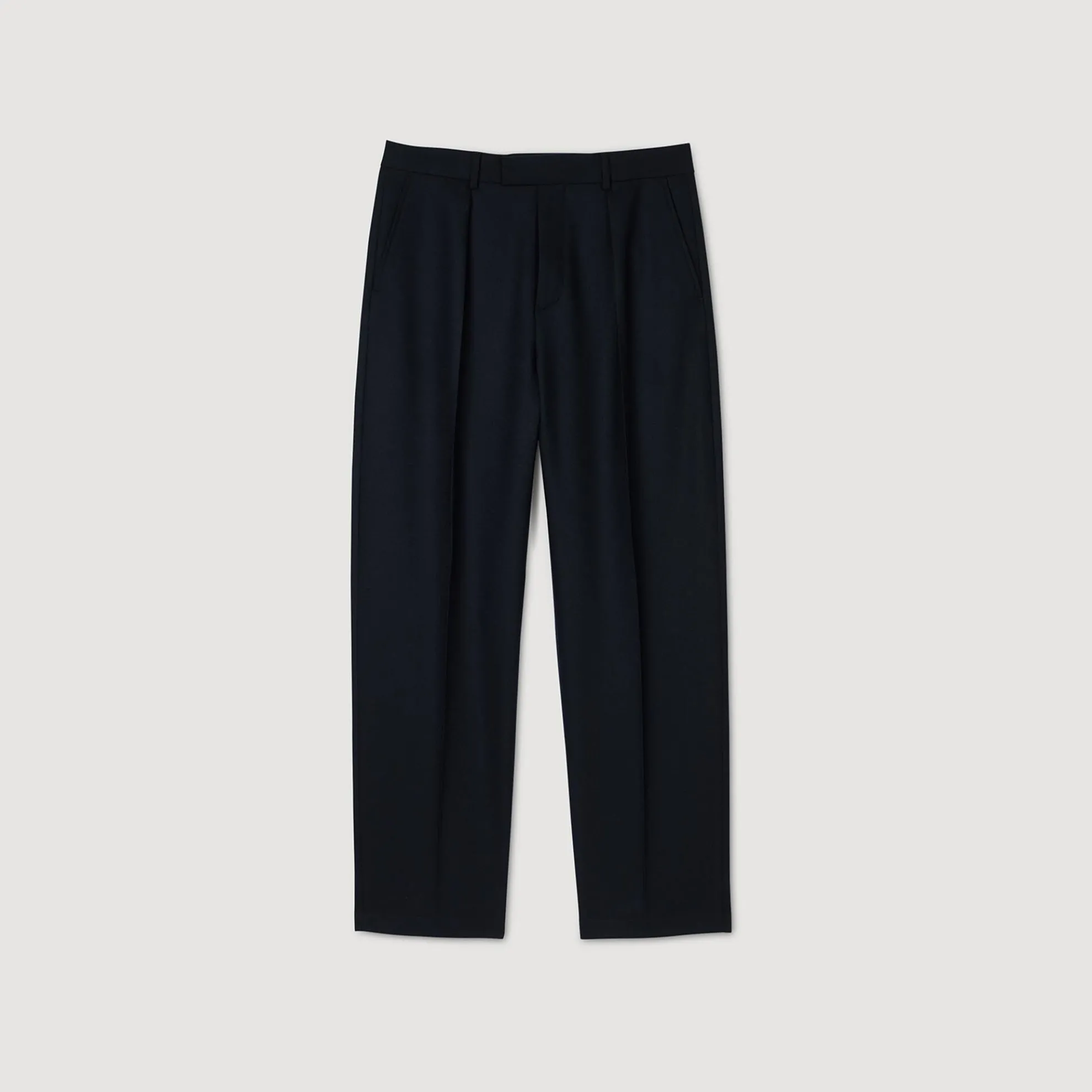 Wijde wollen brok met diepe plooien, riemlussen en zakken aan de voor- en achterkant.