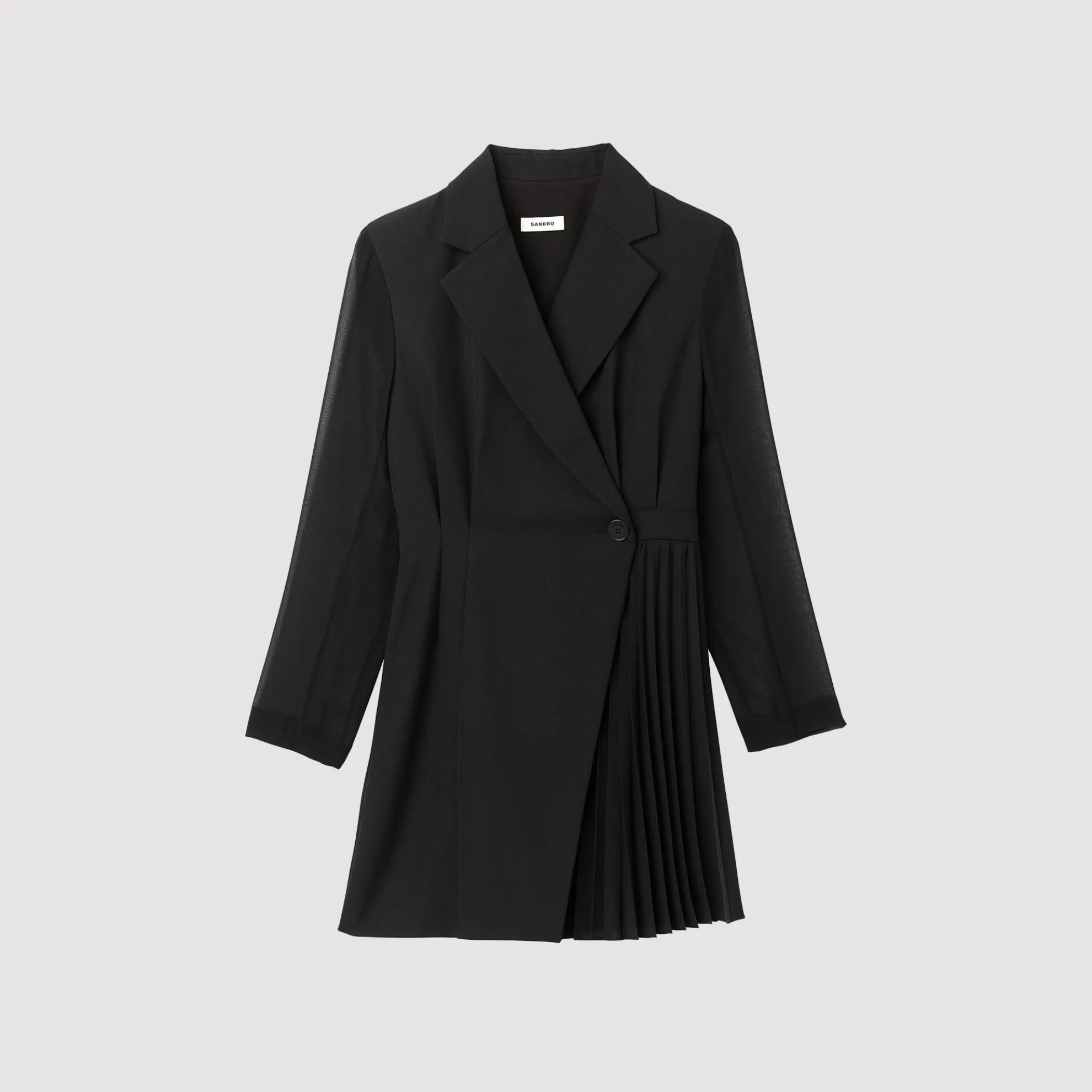 Wikkeljurk met lange mouwen, een brede kraag en een asymmetrische plissérok van mousseline aan de zijkant.