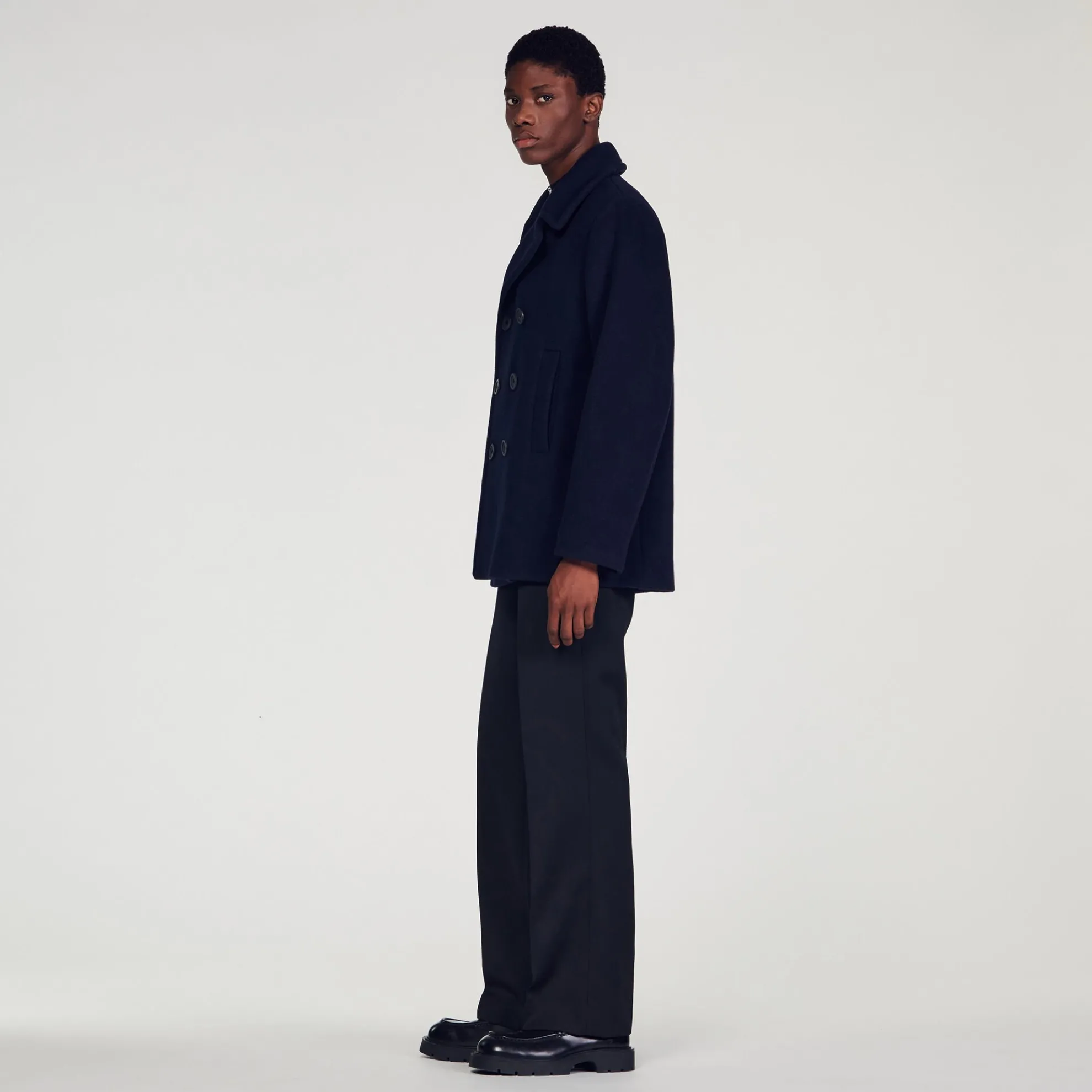 Wollen draagtas met gekruiste knoopsluiting, lange mouwen, getailleerde kraag en paspelzakken.