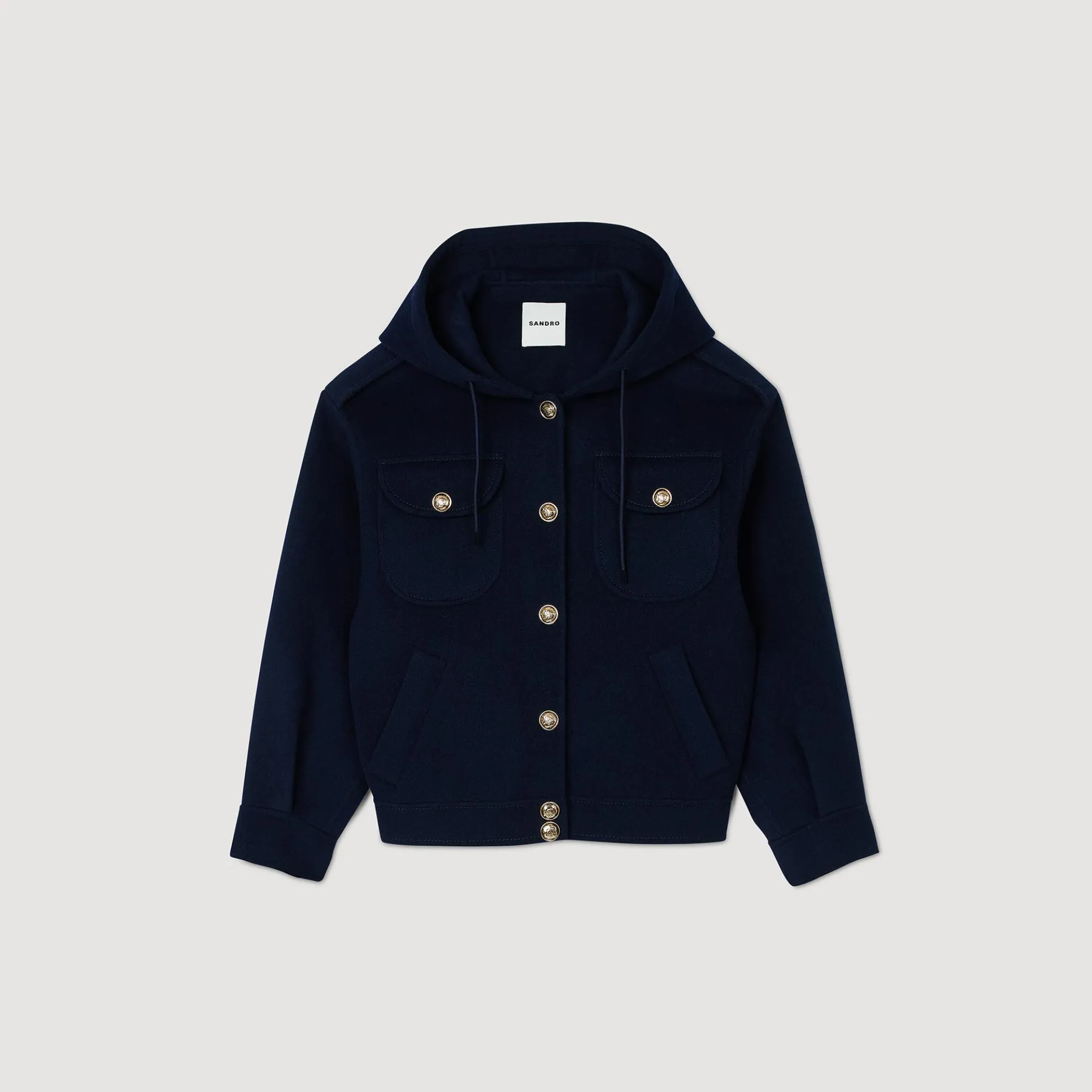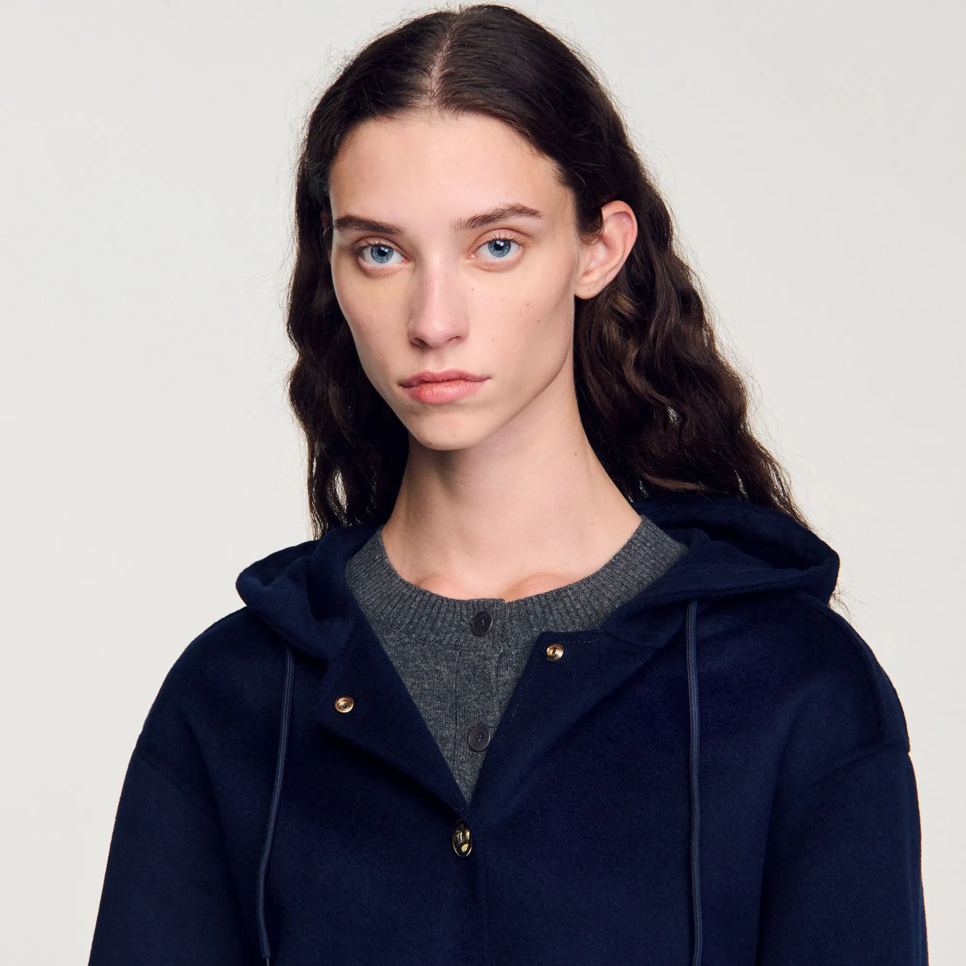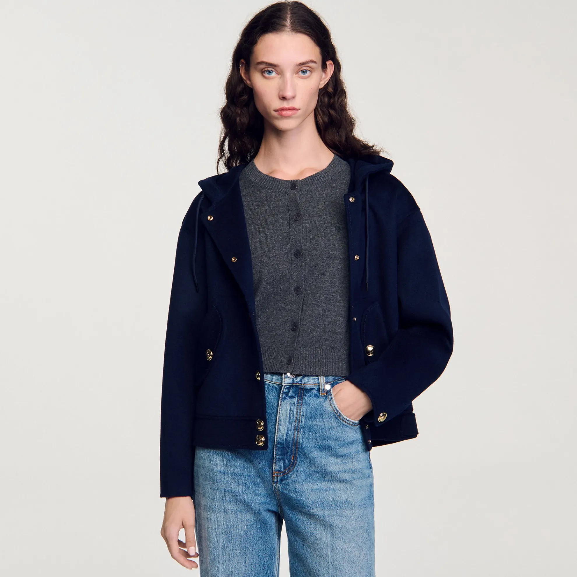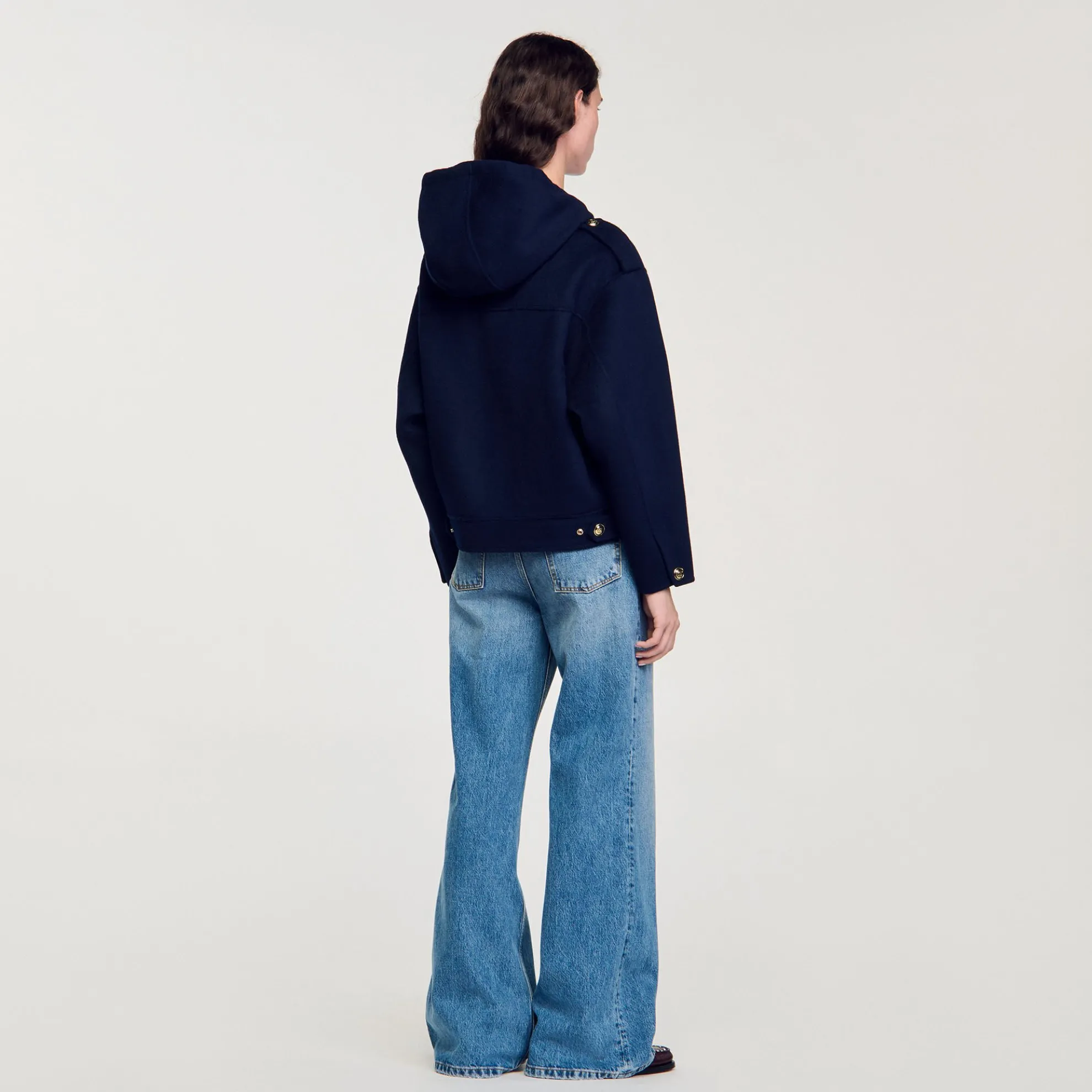 Dubbelzijdig wollen jack met een capuchon met koordjes, lange mouwen met manchetknopen, een sluiting met gouden knopen, zakken aan de zijkant en schouderstukken.