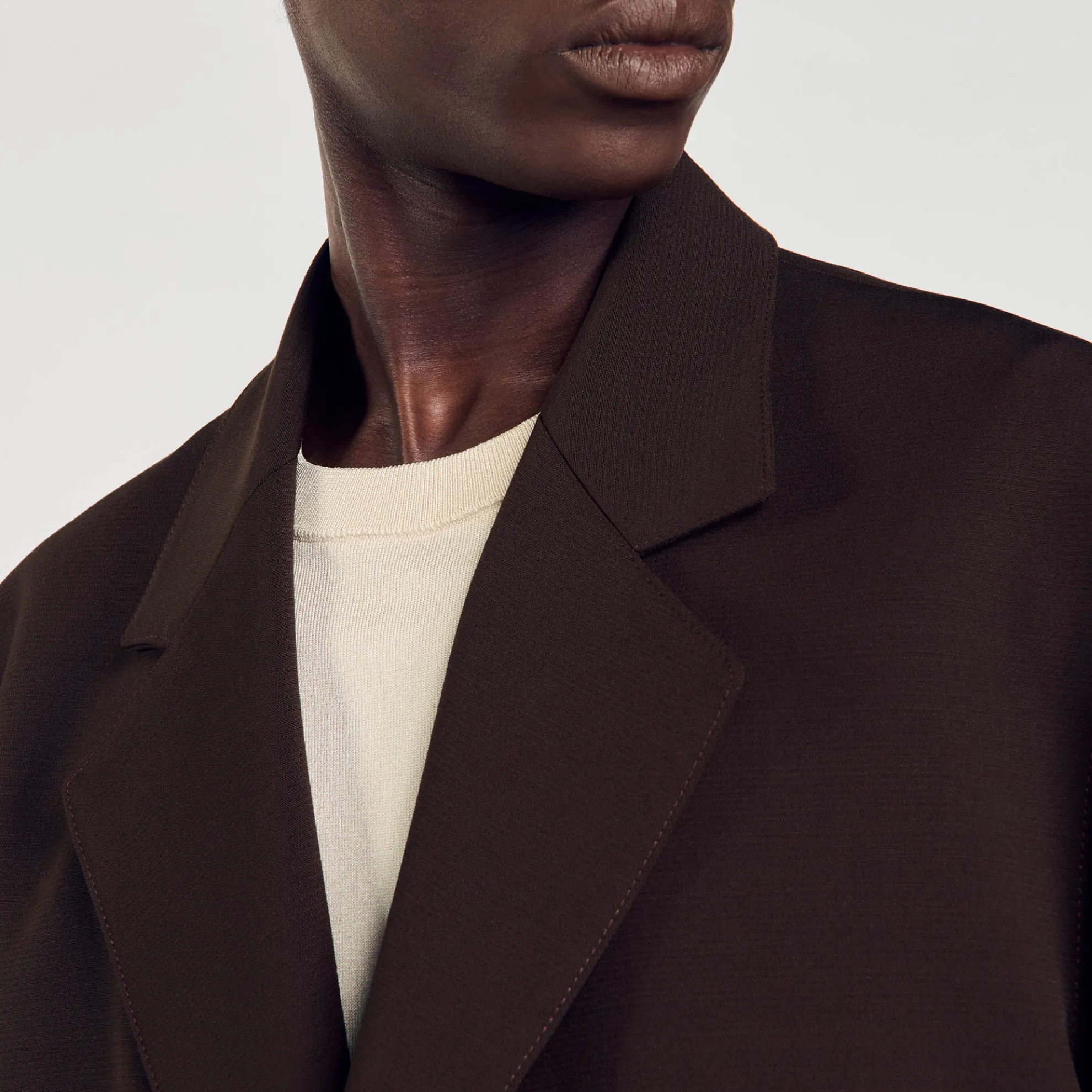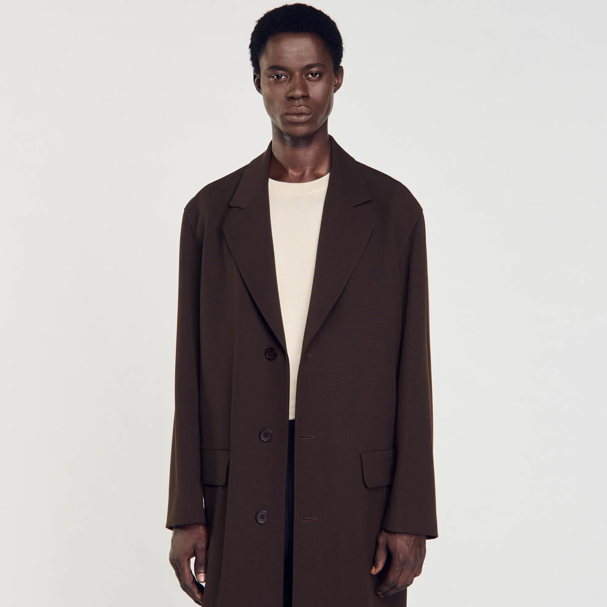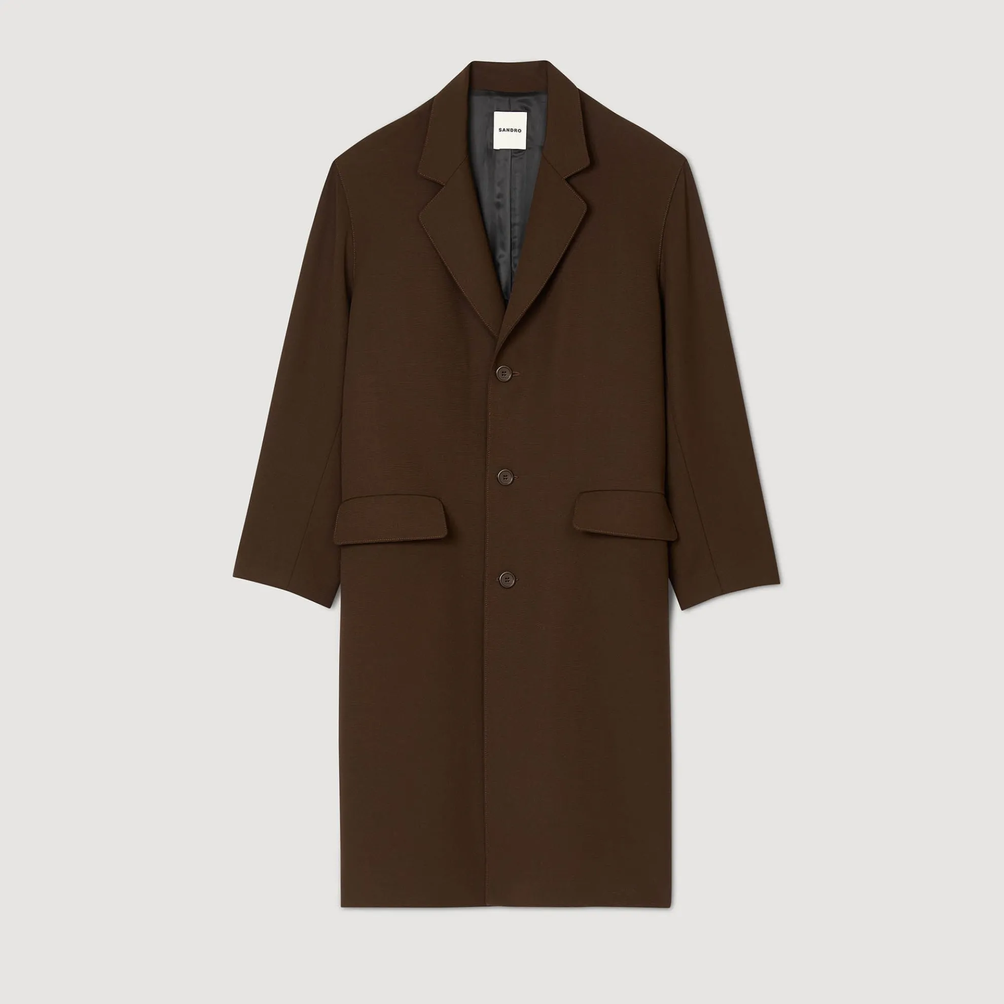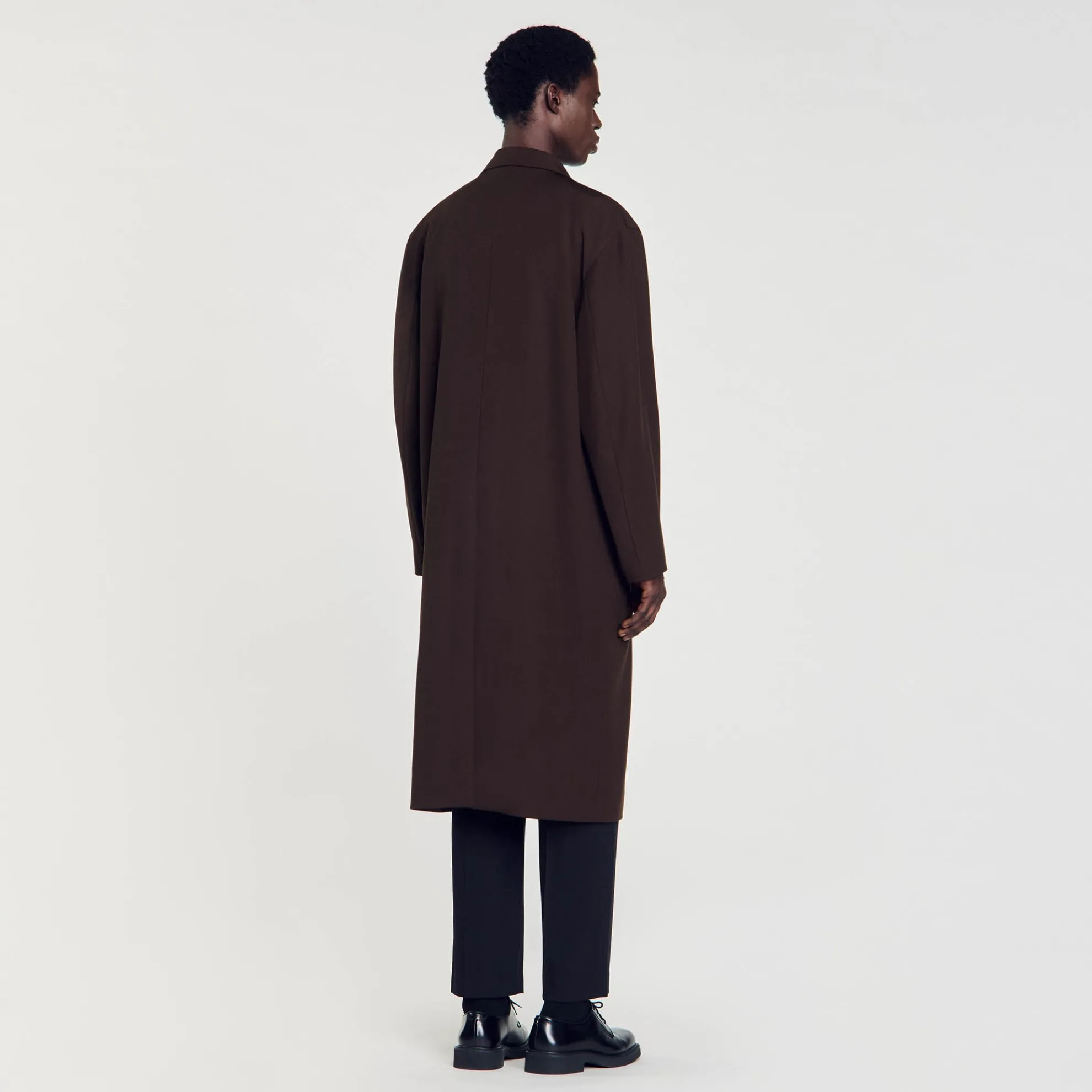 Soepelvallende zeer lange, wijde wollen jas met lange mouwen, reverskraag, knoopsluiting en split aan de achterkant.