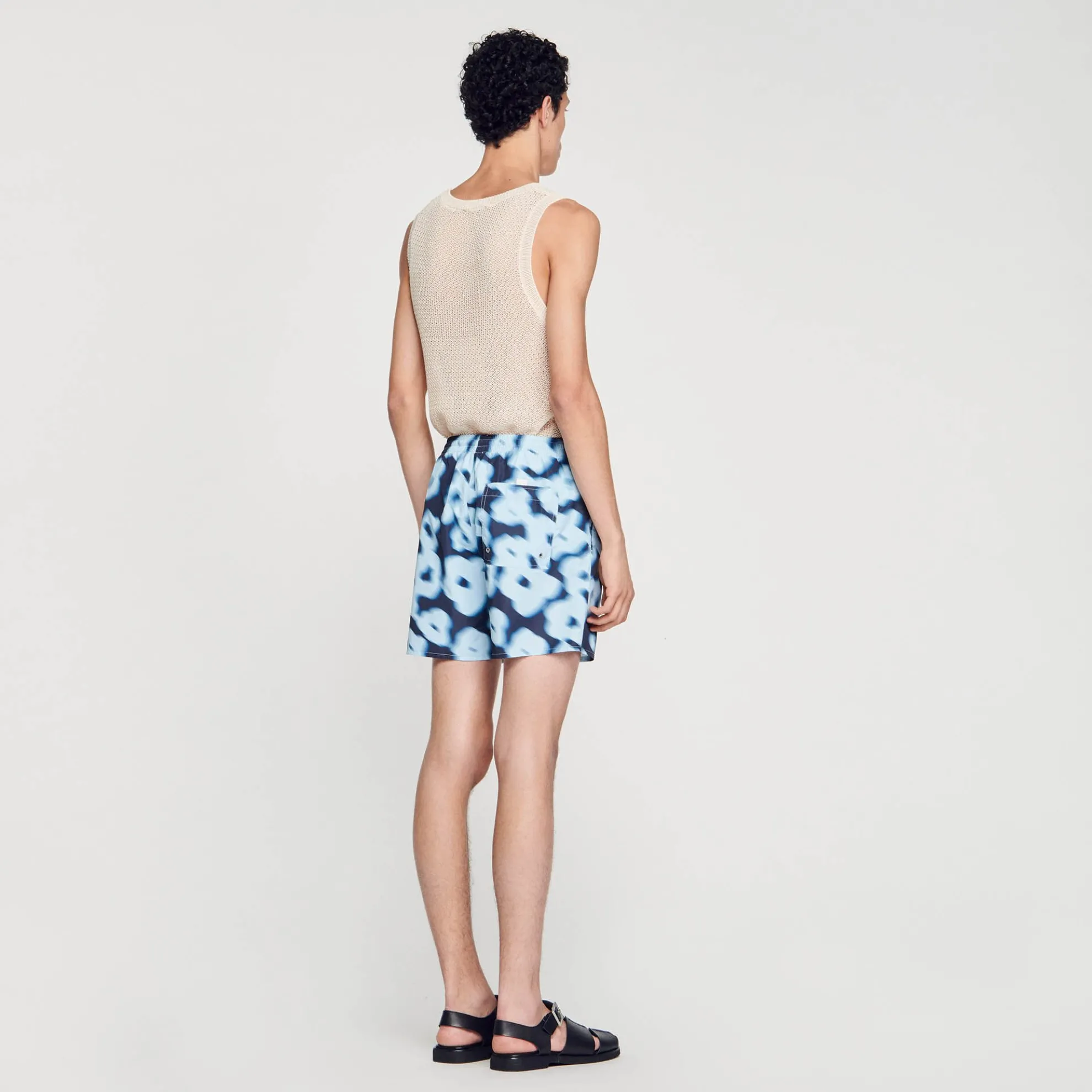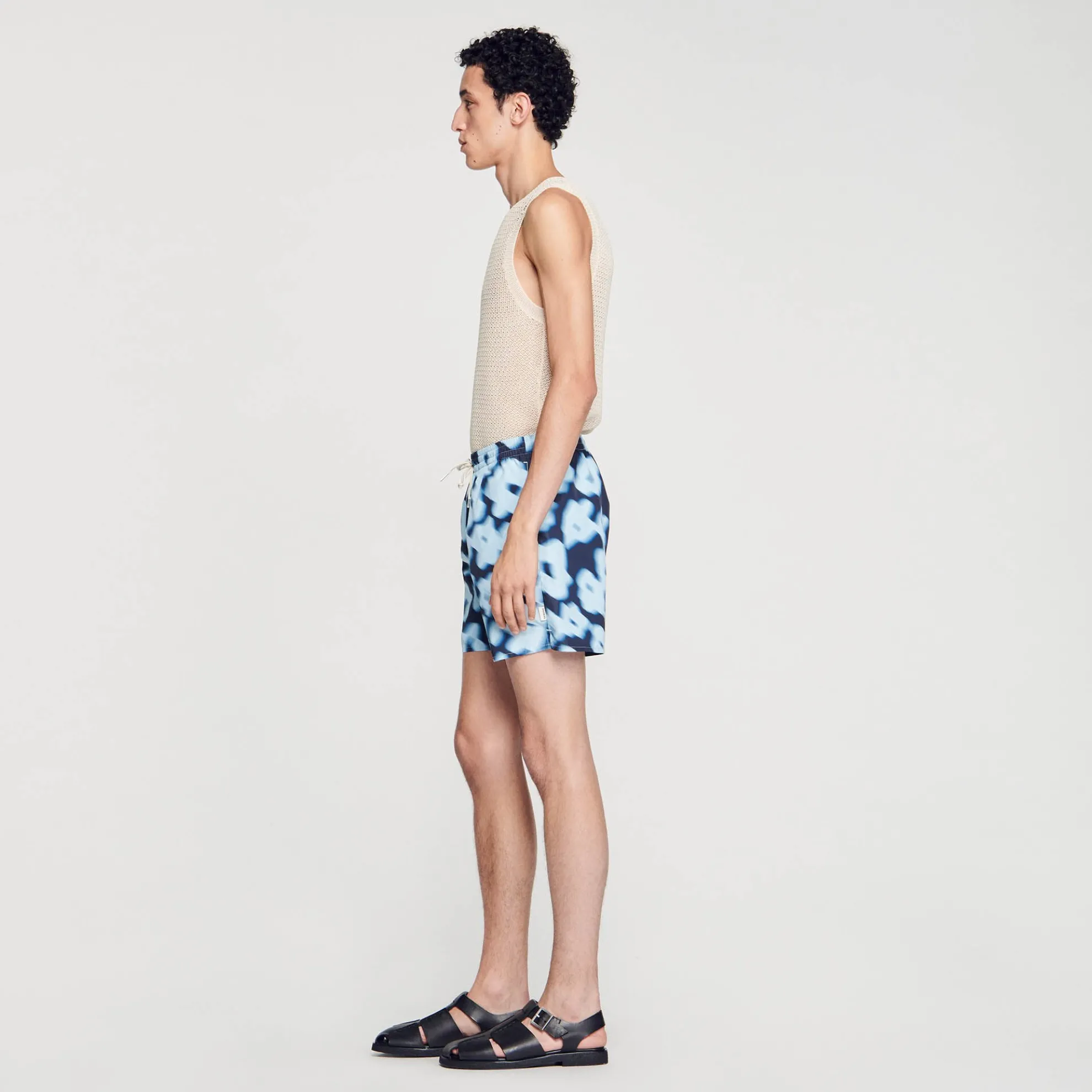 Zwembroek met bloemenprint, elastische tailleband met trekkoord, steekzakken en opgezette achterzak.