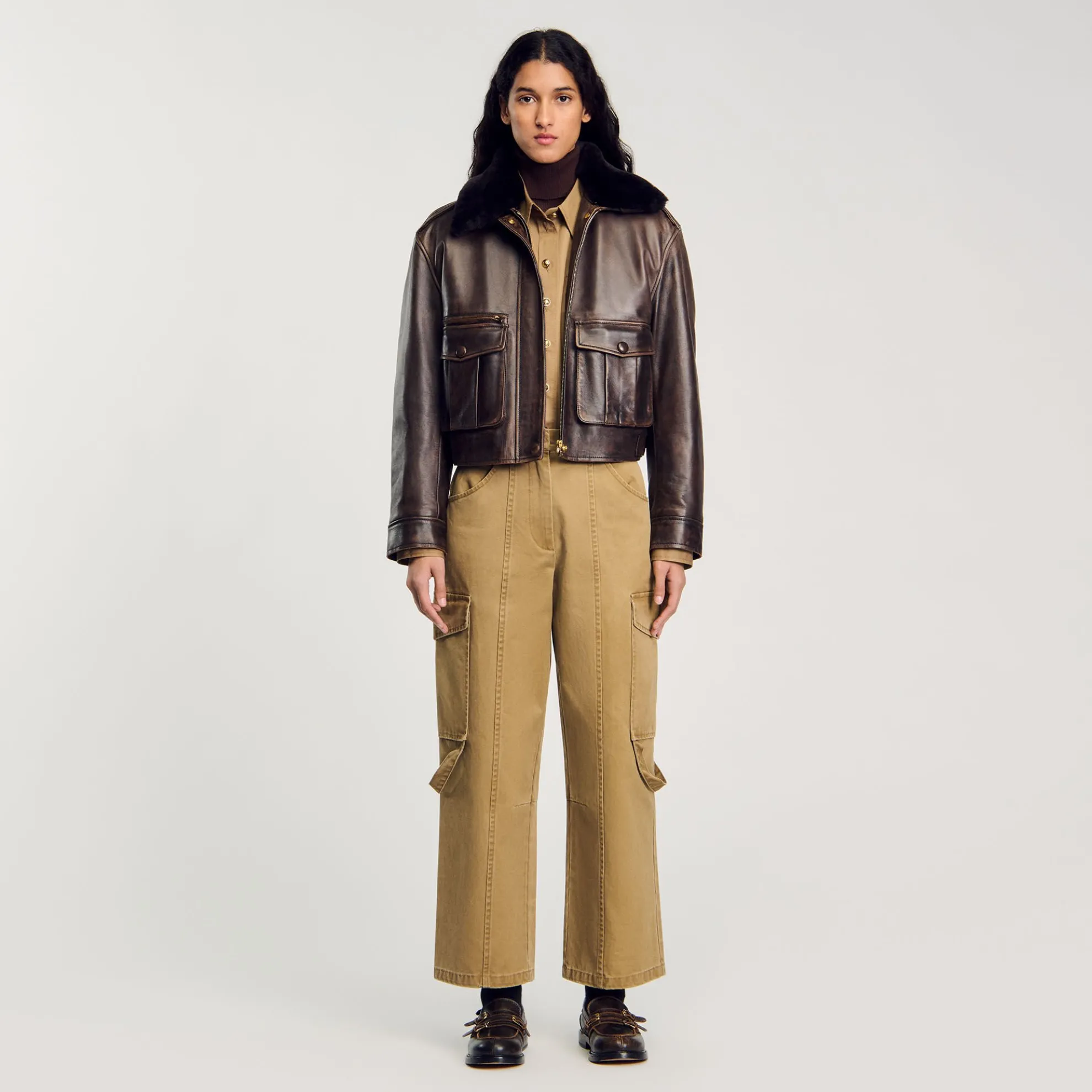 Cargobroek met wijde pijpen, grote klepzakken en zijbanden.