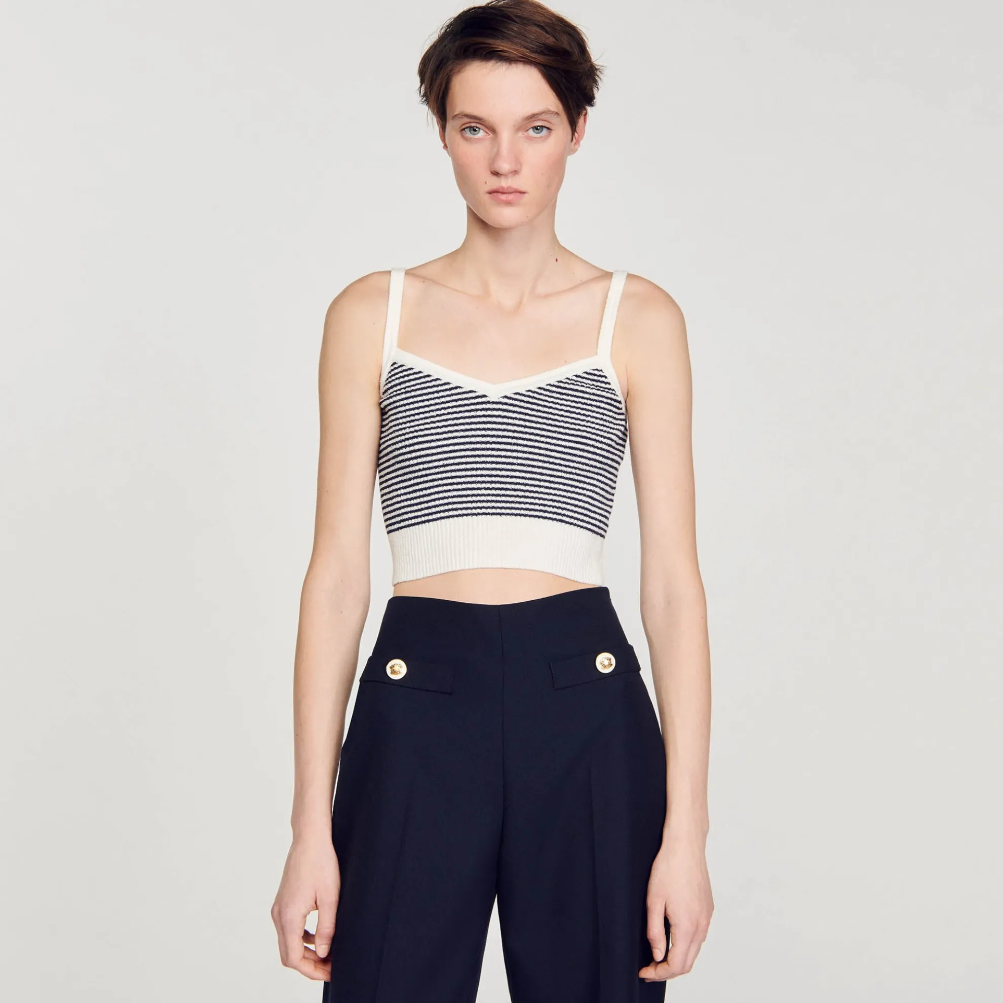 Gebreide korte brassière van gestreepte bouclé stof met dunne schouderbandjes en contrasterende geribde boorden.
