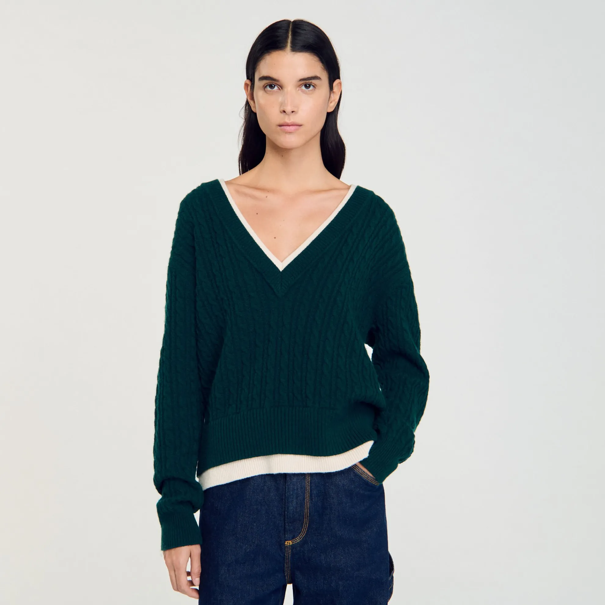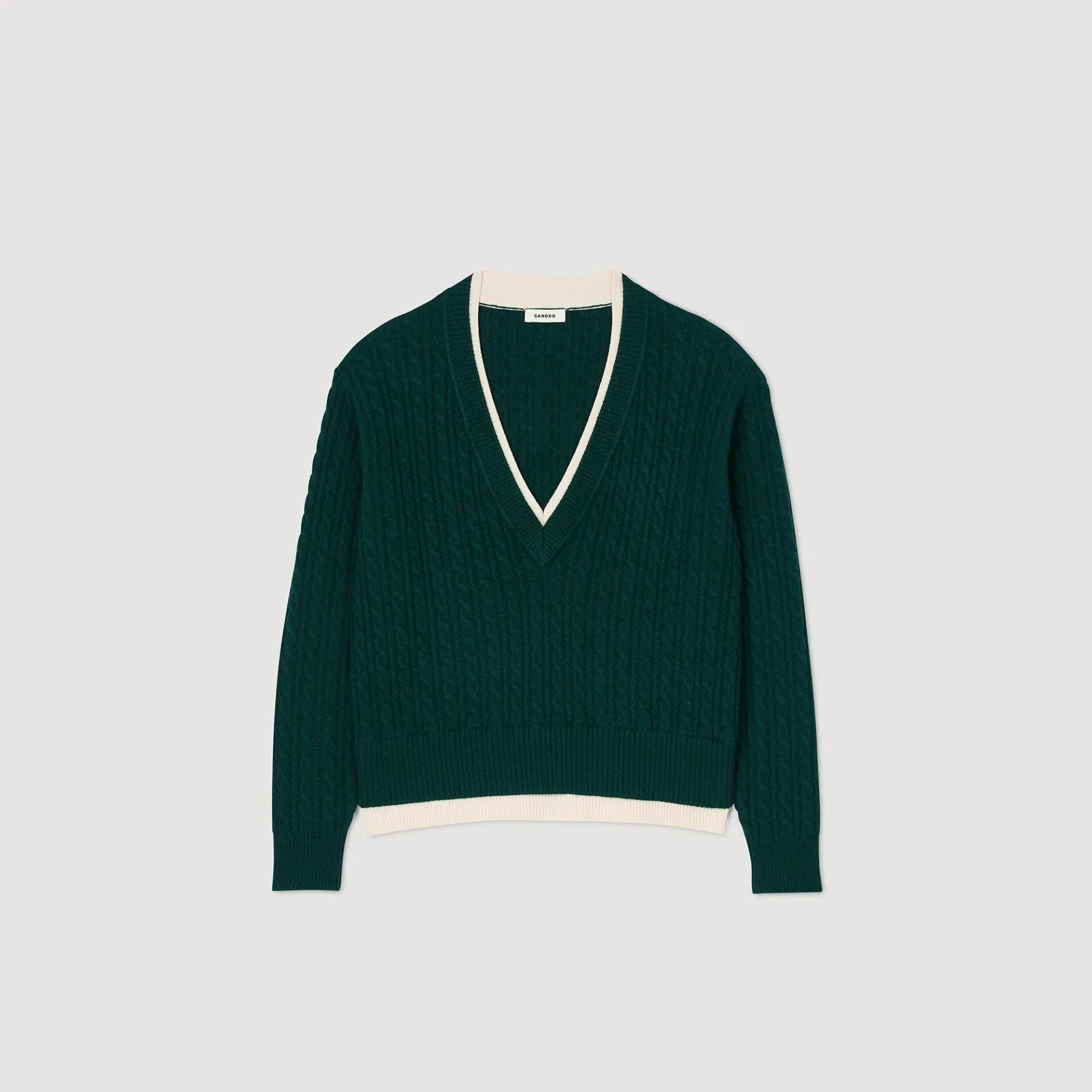 Tweekleurige kabelgebreide trui met trompe l’œil van wol en kasjmier met lange mouwen en een V-hals.