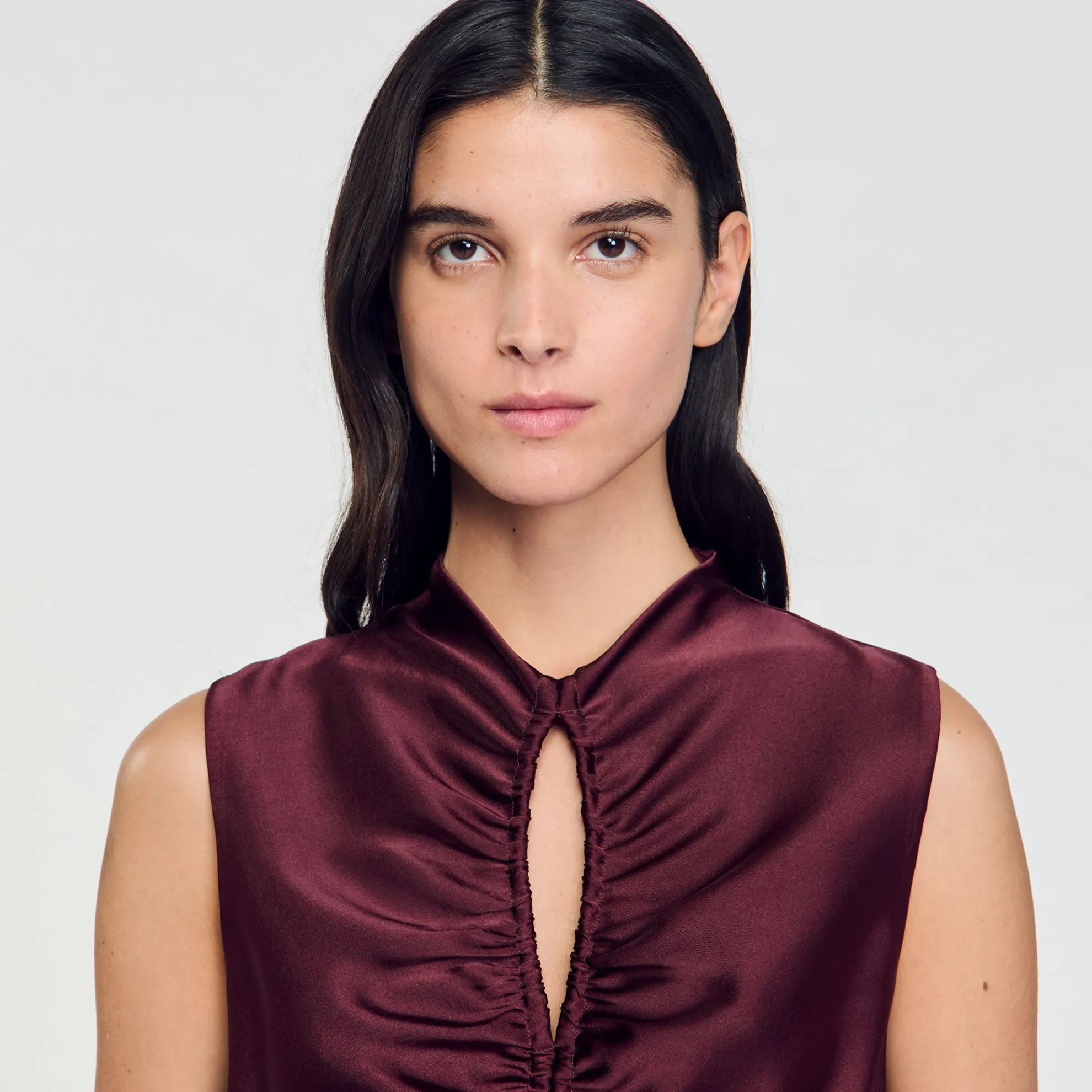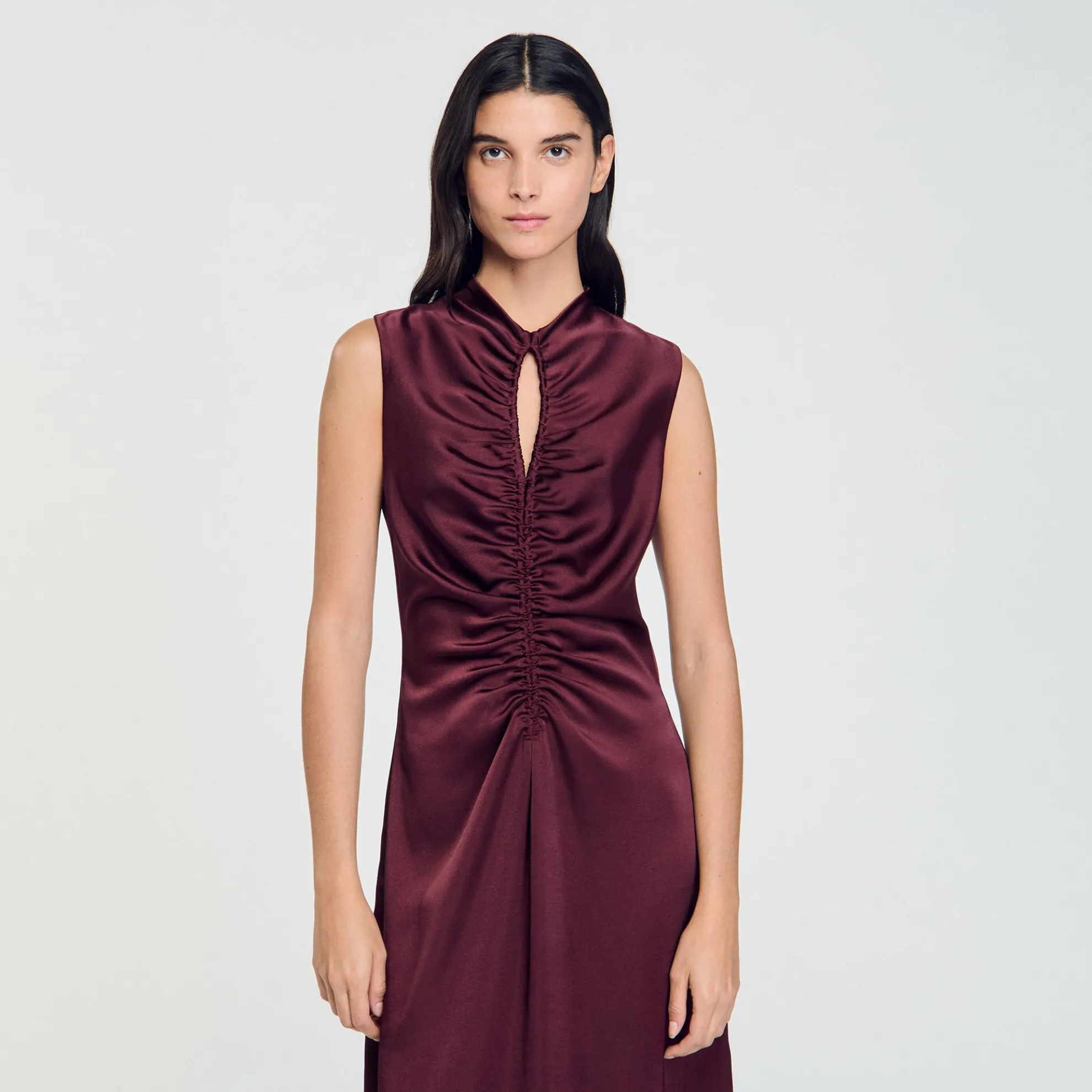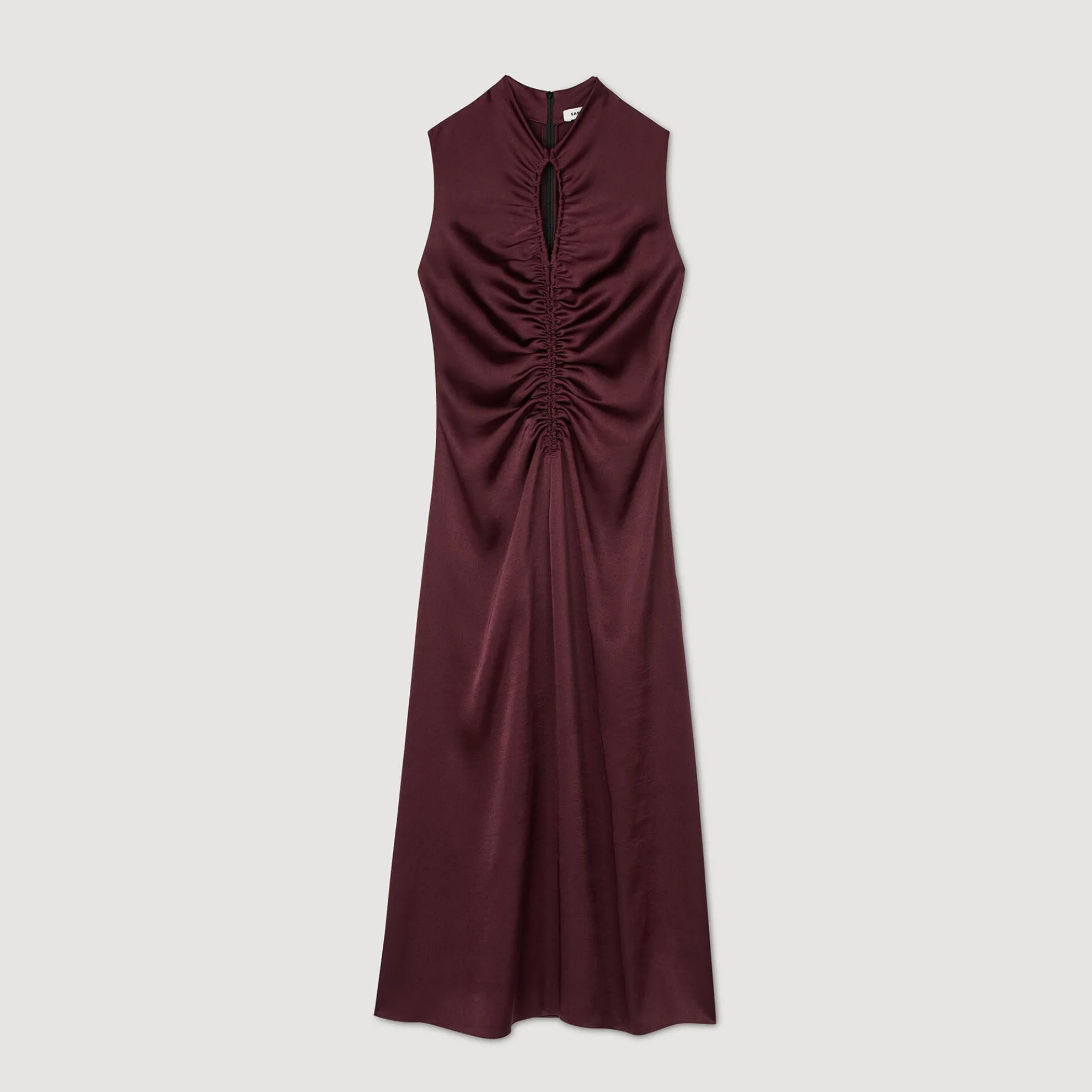 Mouwloze satijnen jurk met een ronde hals met druppelvormig decolleté en ruches aan de voorkant.
