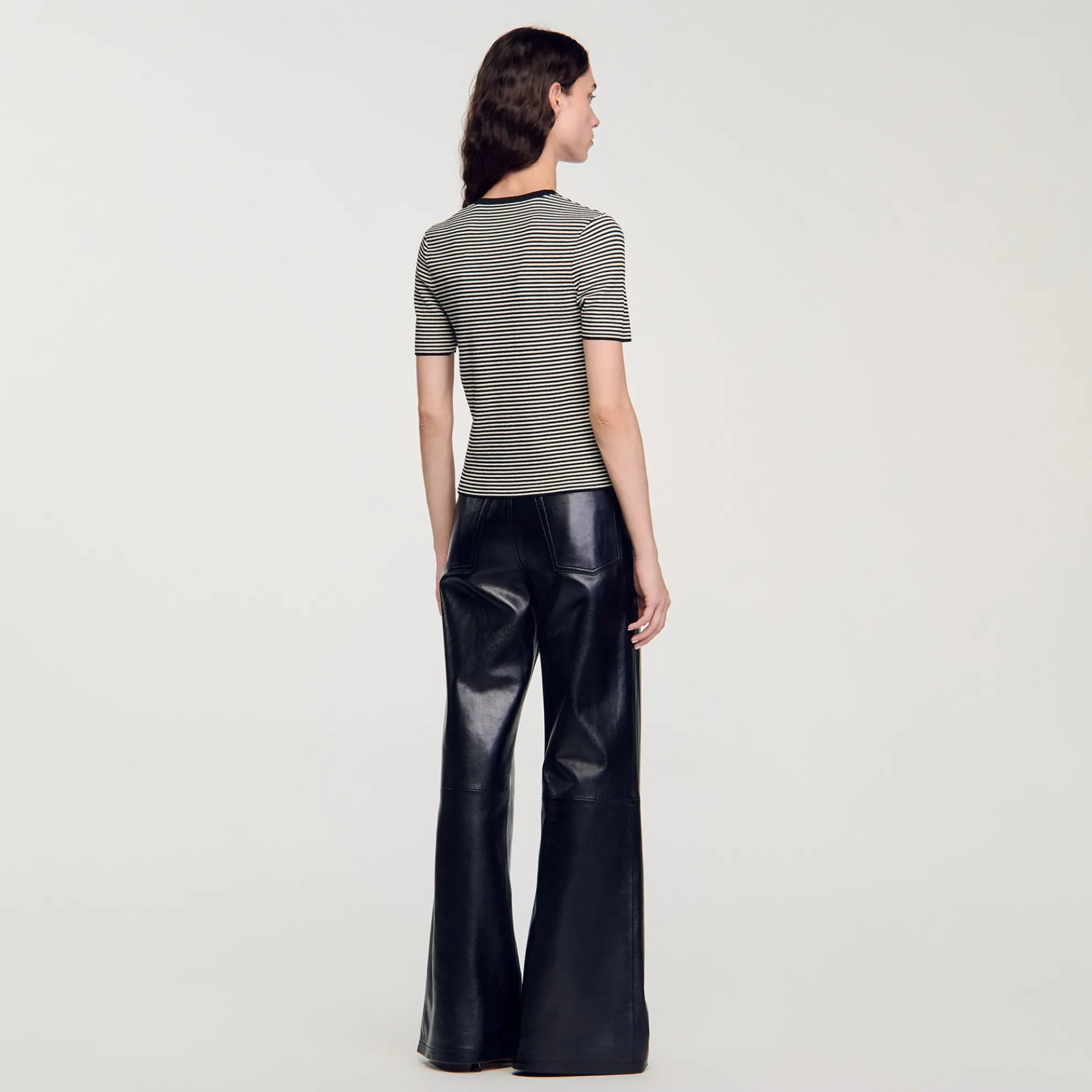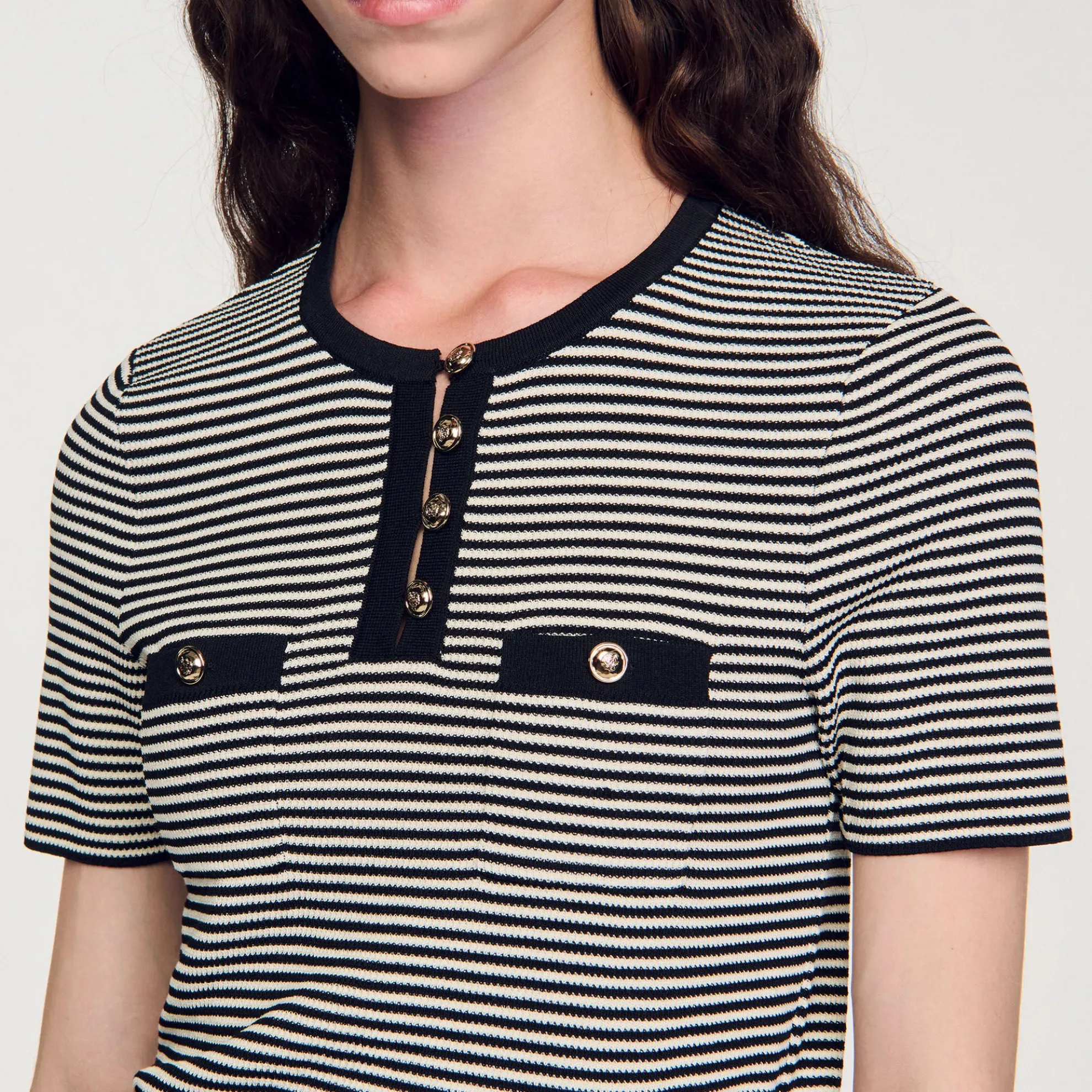 Gestreepte gebreide trui met ronde hals, korte mouwen, knoopsluiting en opgestikte zakken op de borst.