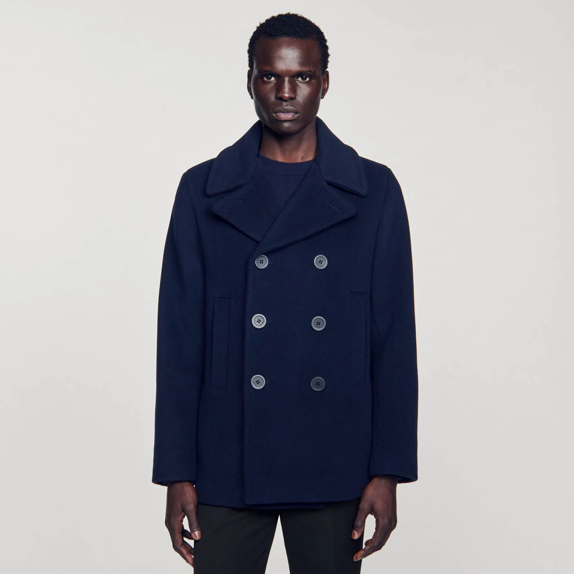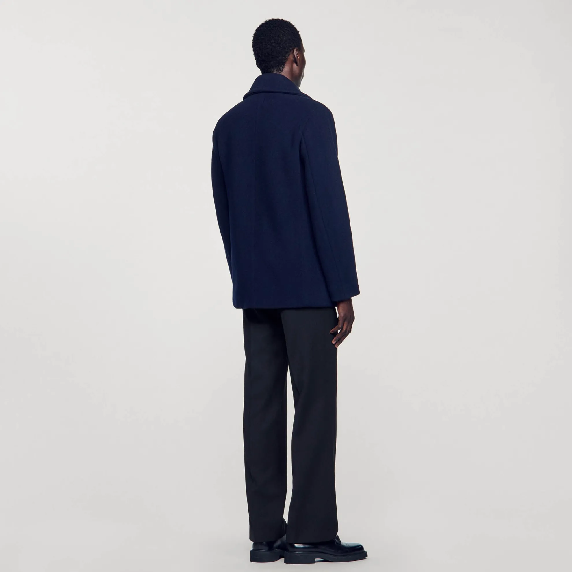 Rechte jas van wolmix in kaban stijl met een reverskraag, lange mouwen en een dubbele rij knopen.