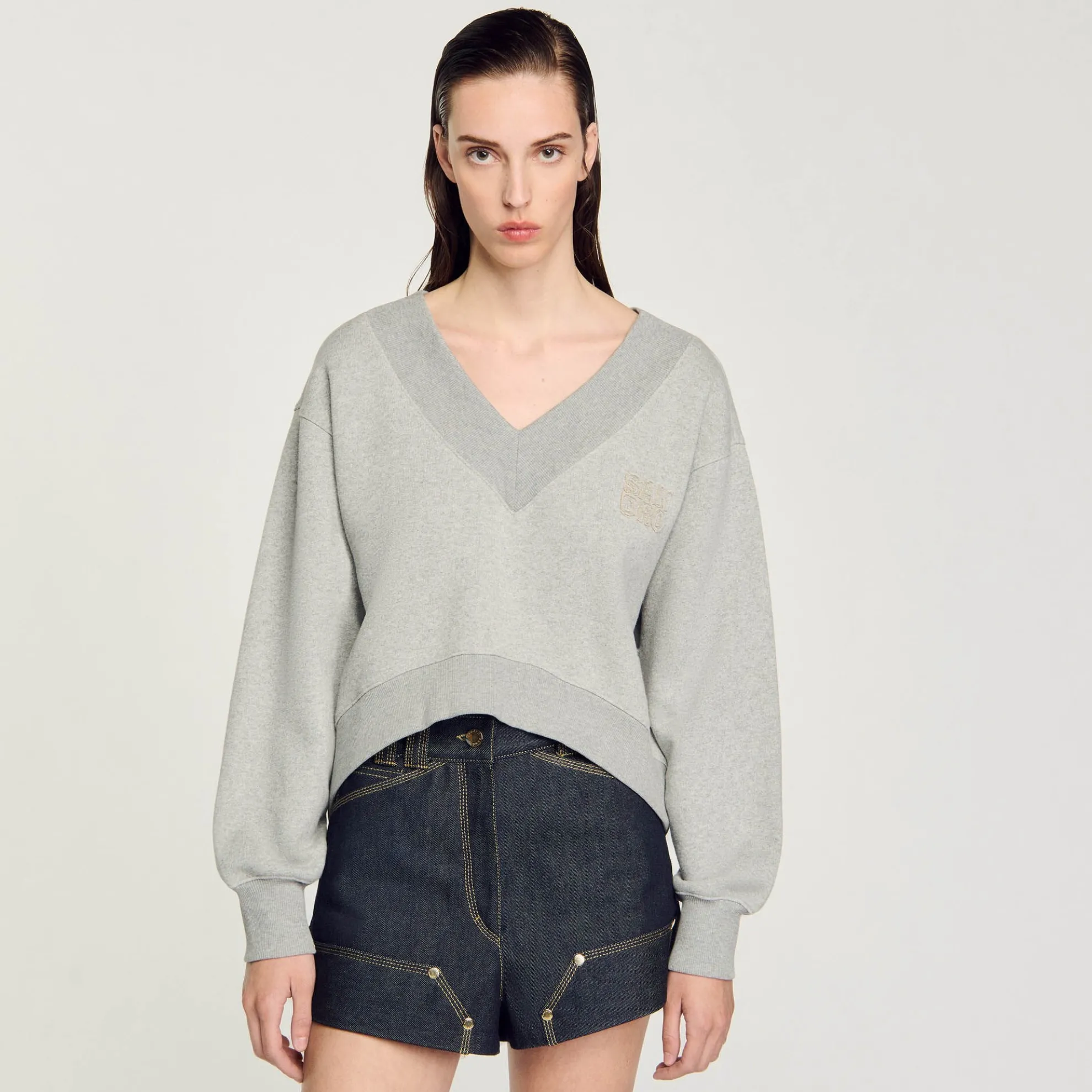 Kort, wijd sweatshirt met diepe V-hals, lange mouwen en geribde zoom.