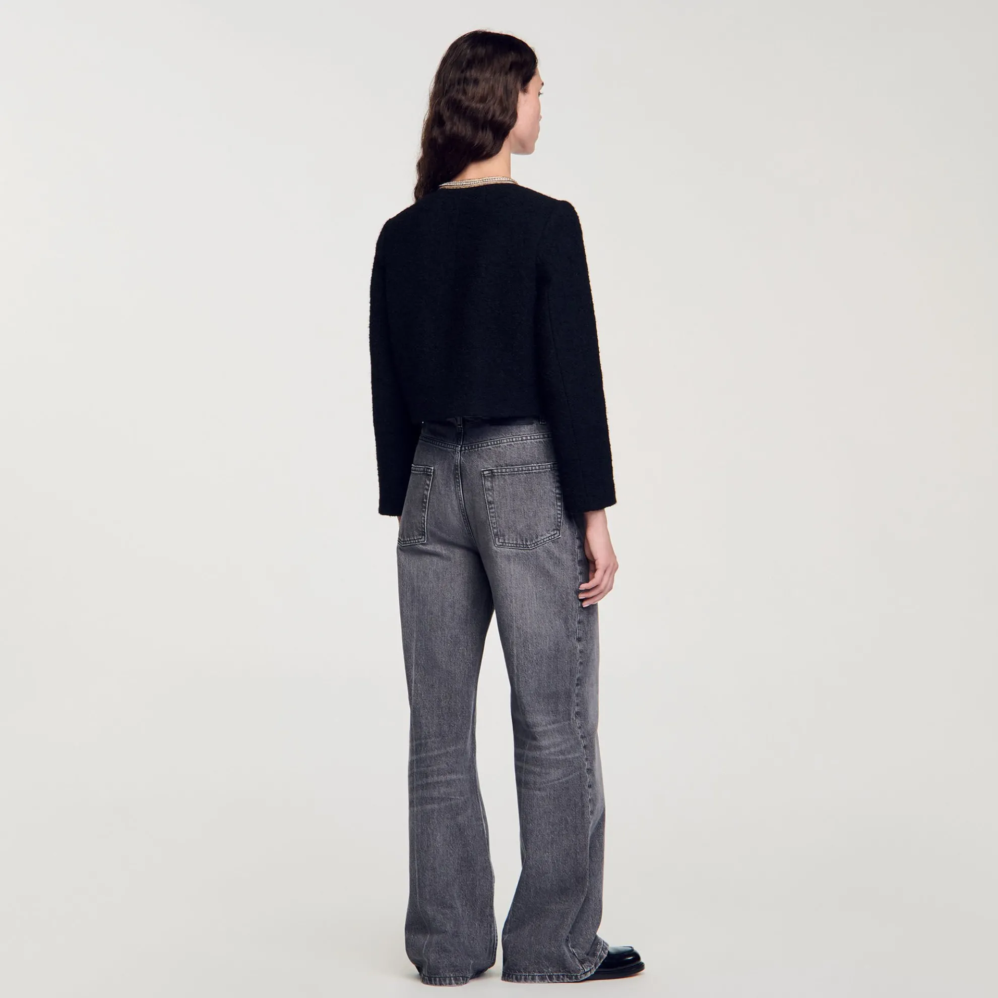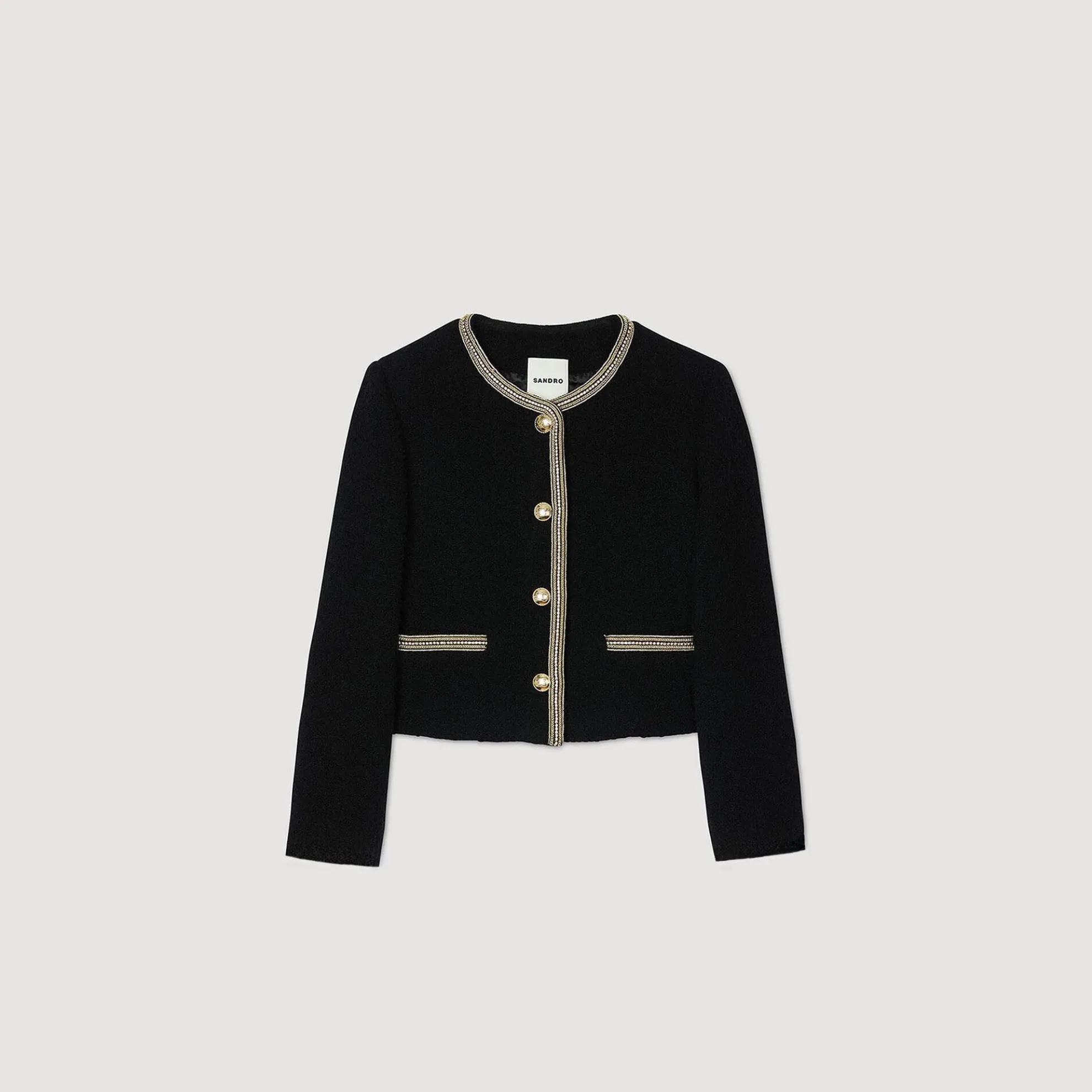 Kort tweed jasje met ronde kraag, lange mouwen, een knoopsluiting en een sierlijke kettingbies.