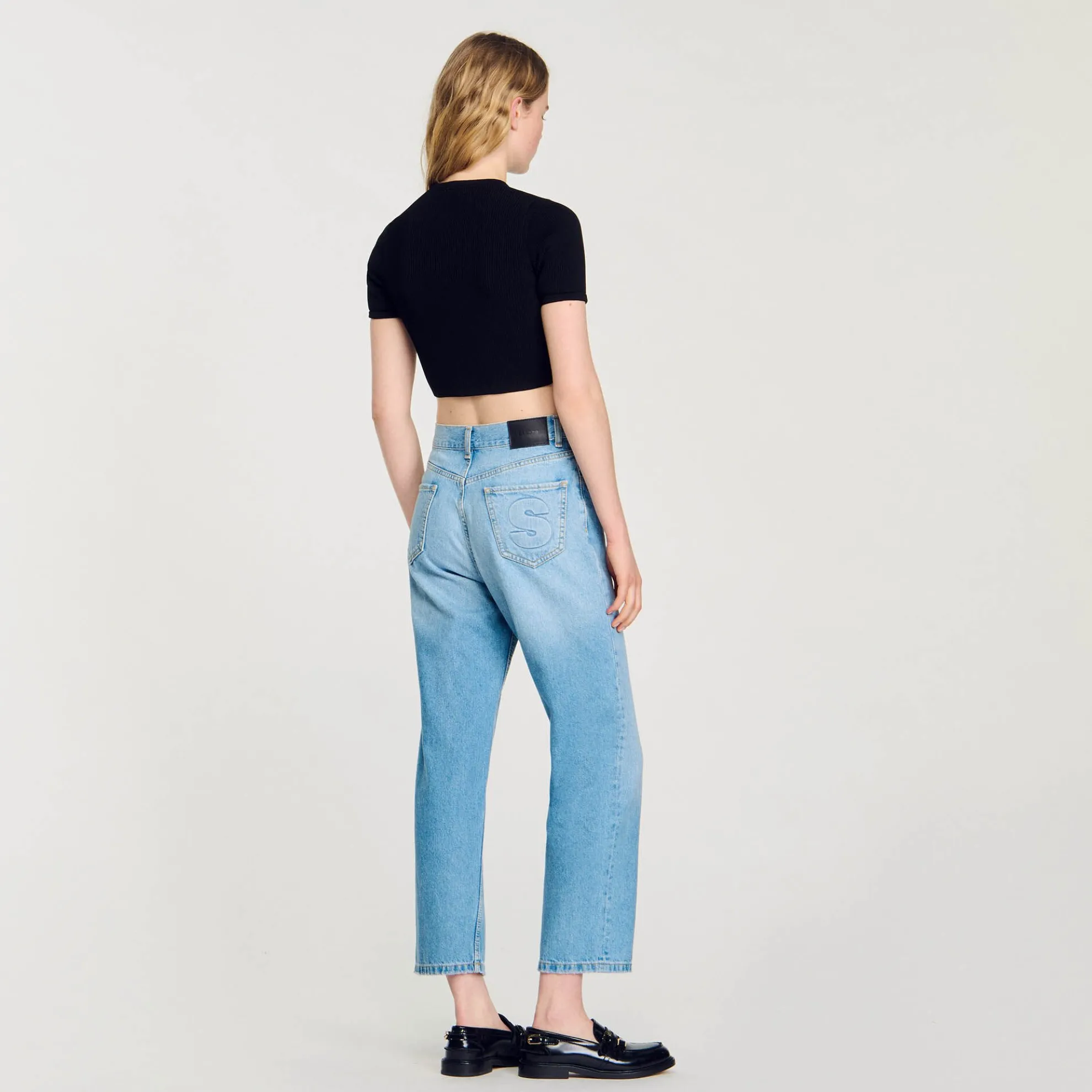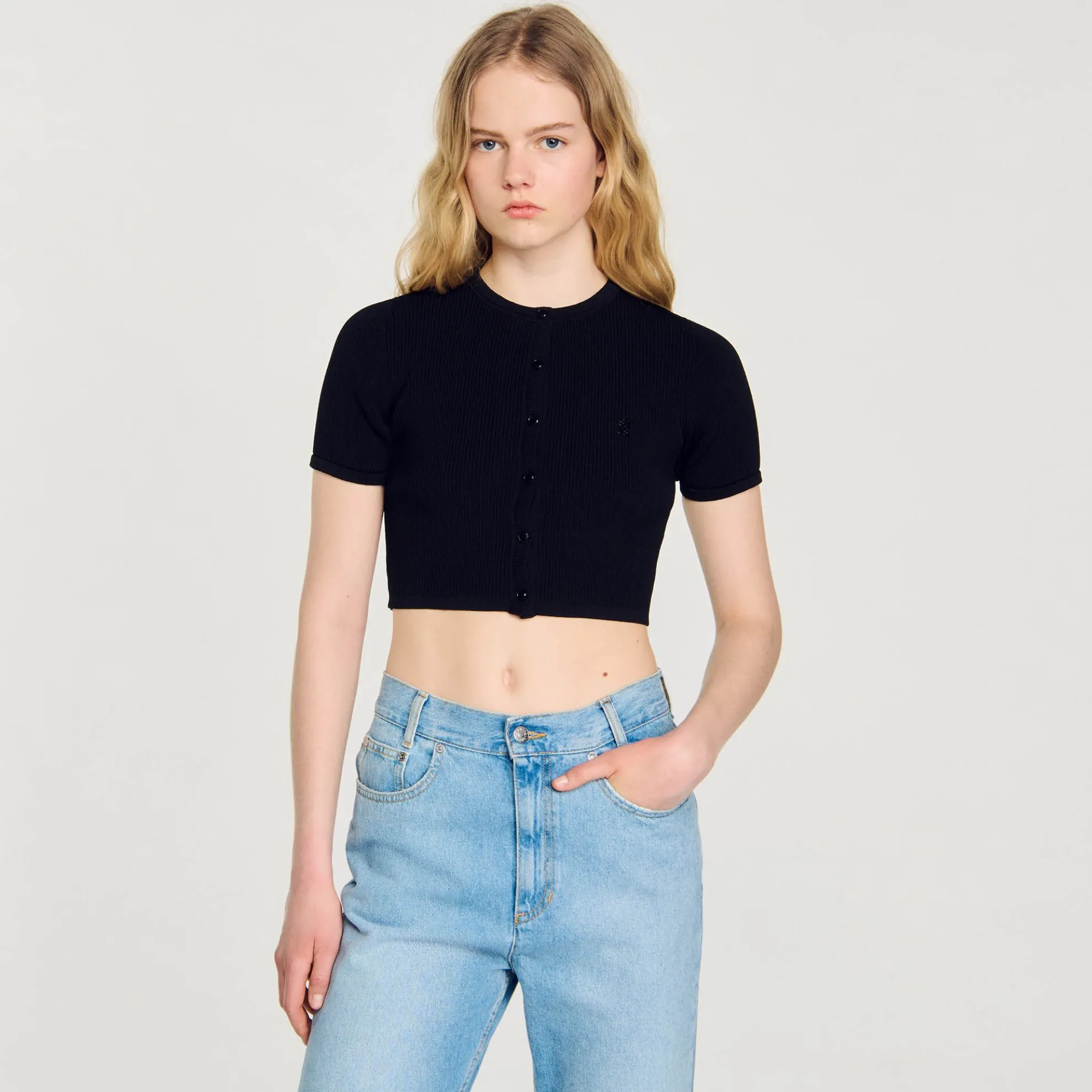 Kort ribgebreid vest met ronde hals, korte mouwen en ton-sur-ton SANDRO-chip op de borst.