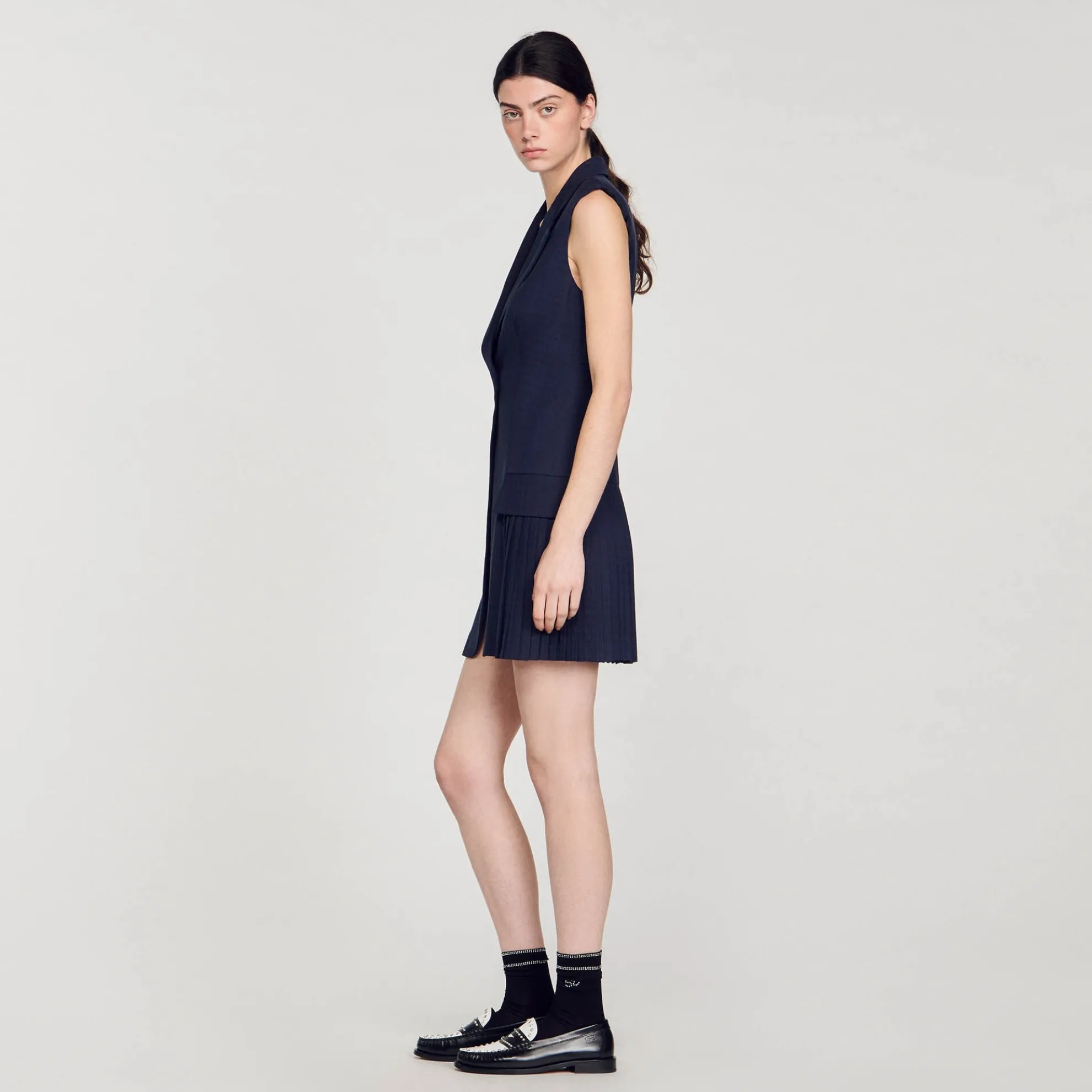 Mouwloze korte jurk in blazer stijl met ingekeepte reverskraag en V-hals decolleté, knoopsluiting, klepzakken en geplooide rok.