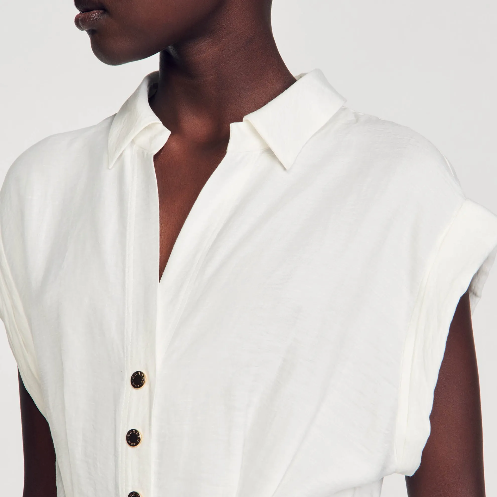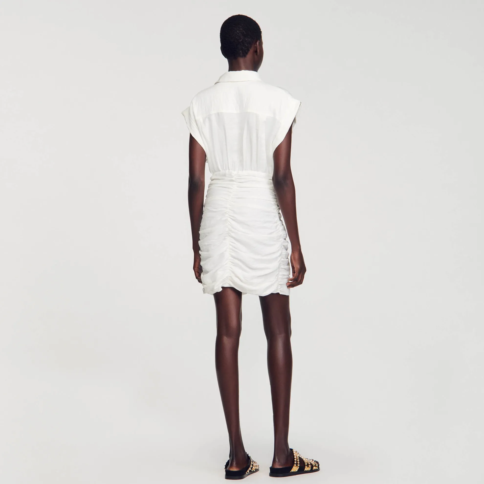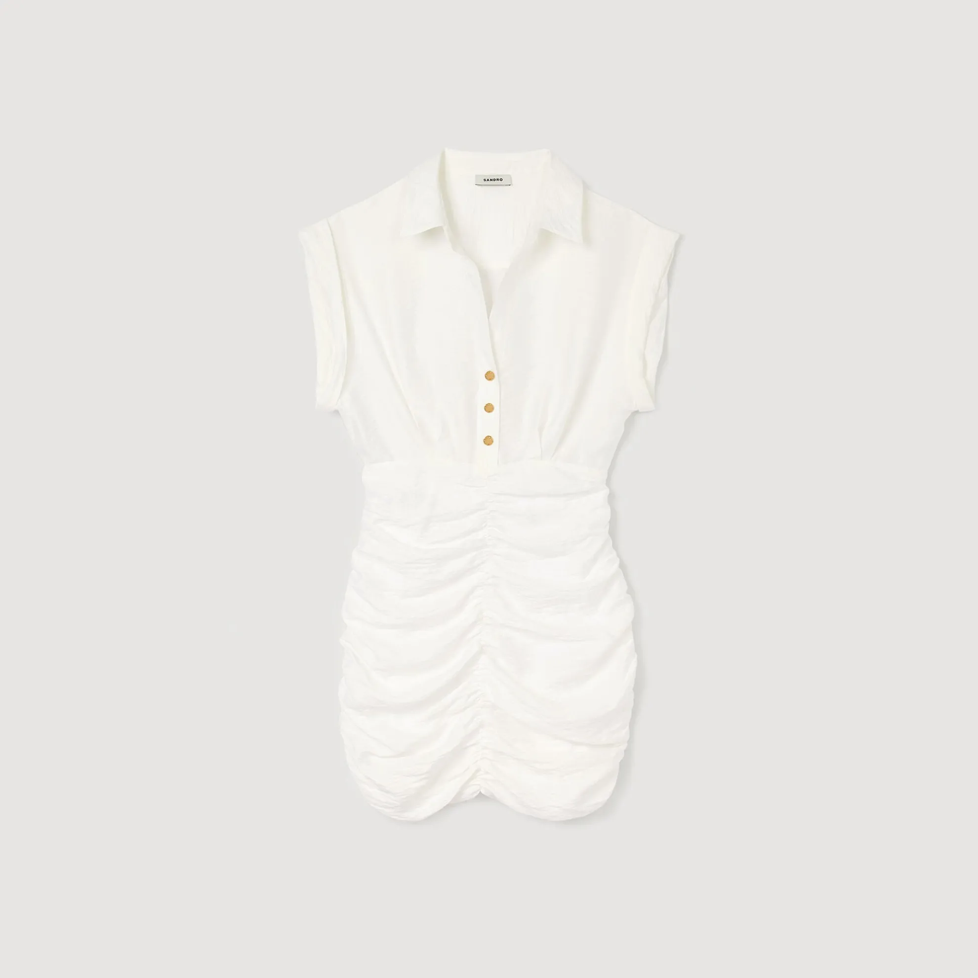 Mouwloze korte jurk van linnenmix met een open overhemdkraag met asymmetrische knopen en een nauwsluitend, gerimpeld rokgedeelte.