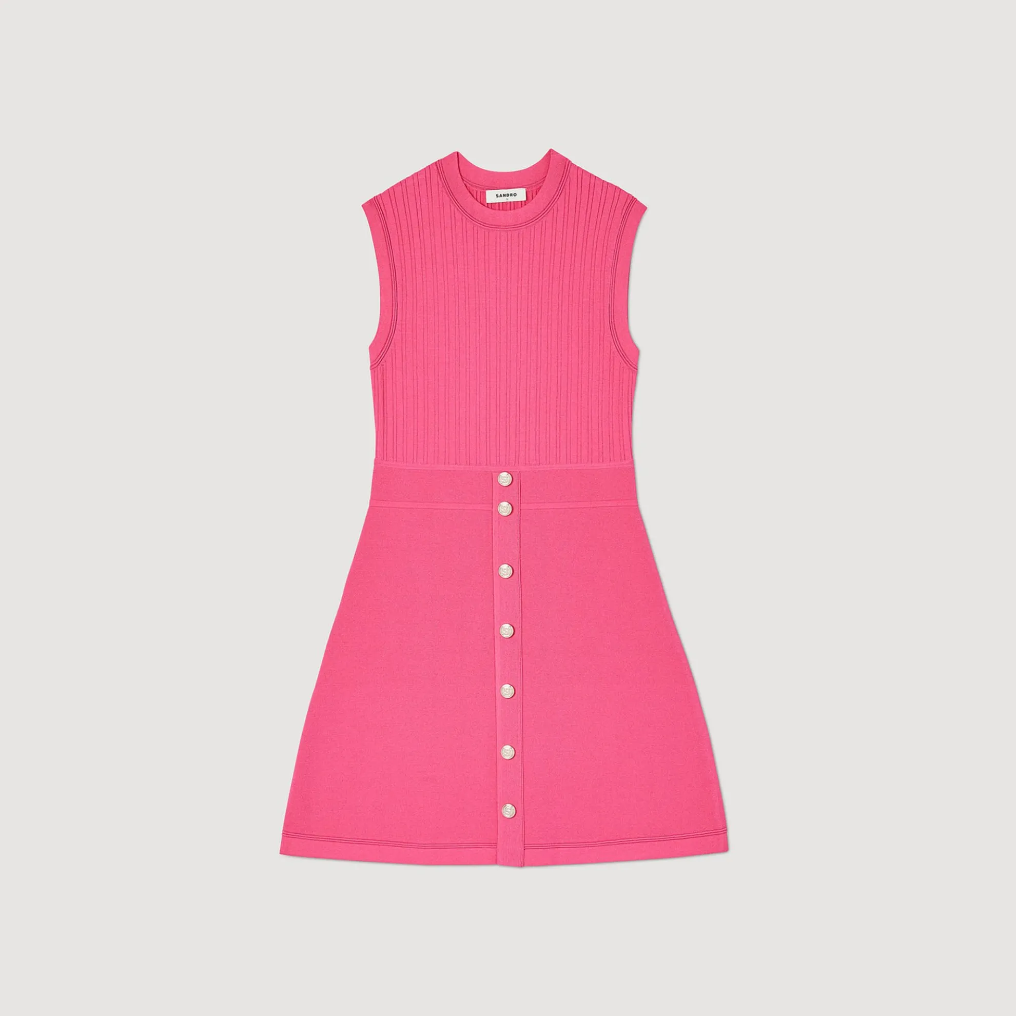 Mouwloze korte jurk van milano tricot, met lijfje van ribtricot en wijd uitlopend bij de zoom, met een ronde hals en goudkleurige knopen.