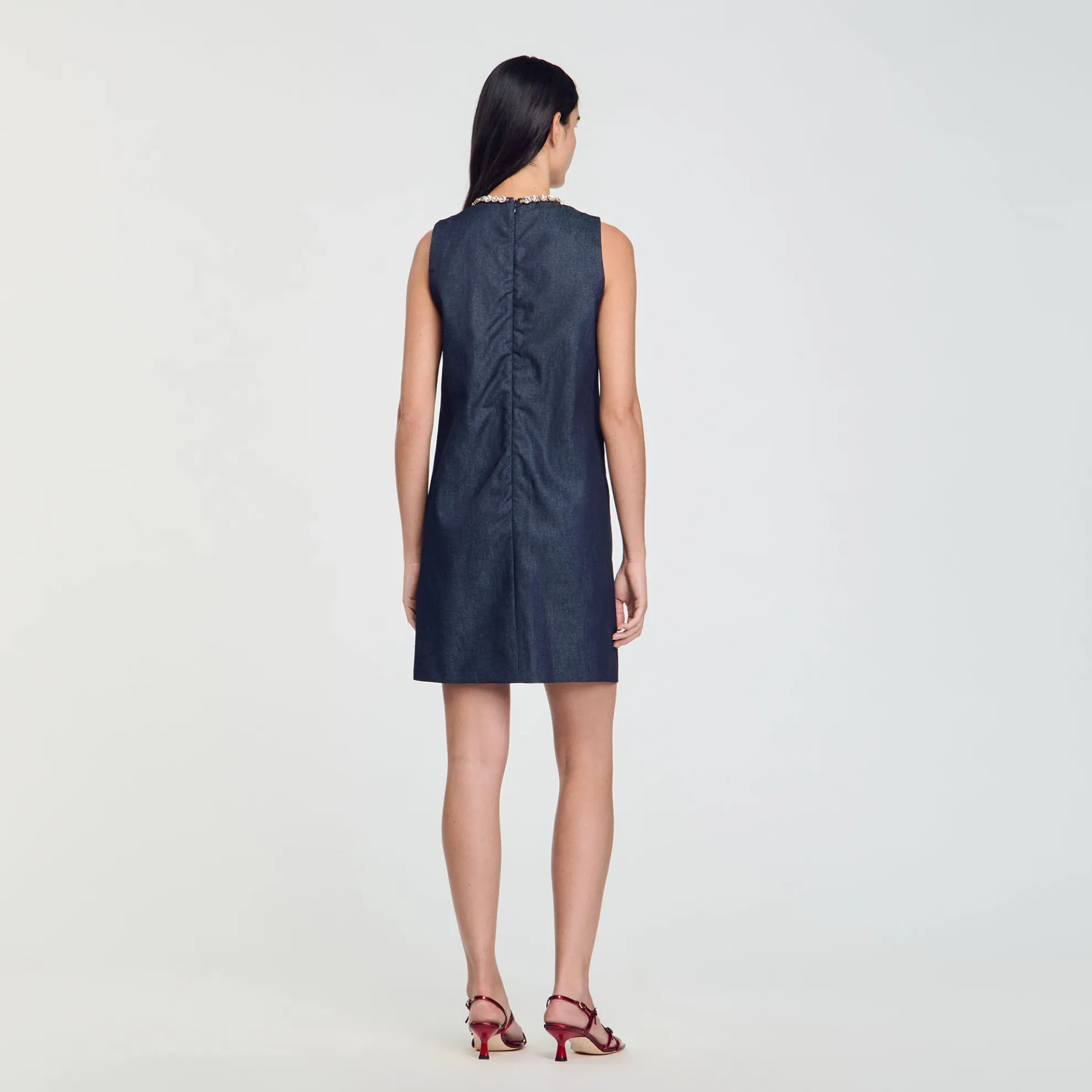 Mouwloze korte spijkerjurk met druppelvormige hals met stras.