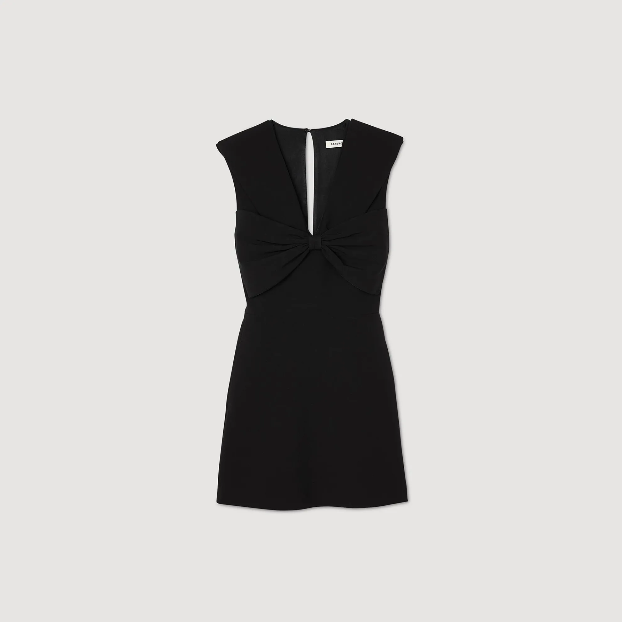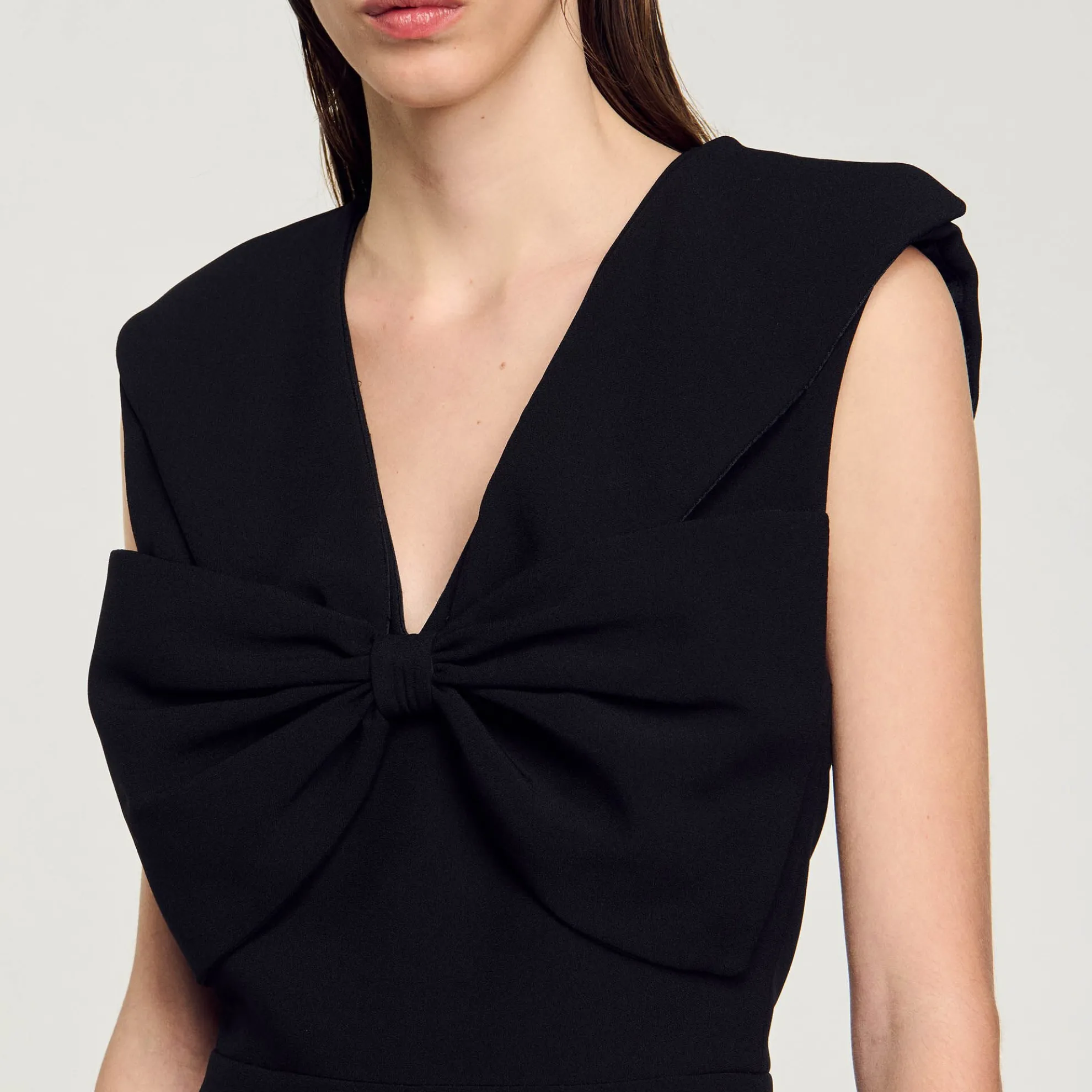Mouwloze korte jurk met schouderstukken, V-hals en oversized strik aan de voorkant.