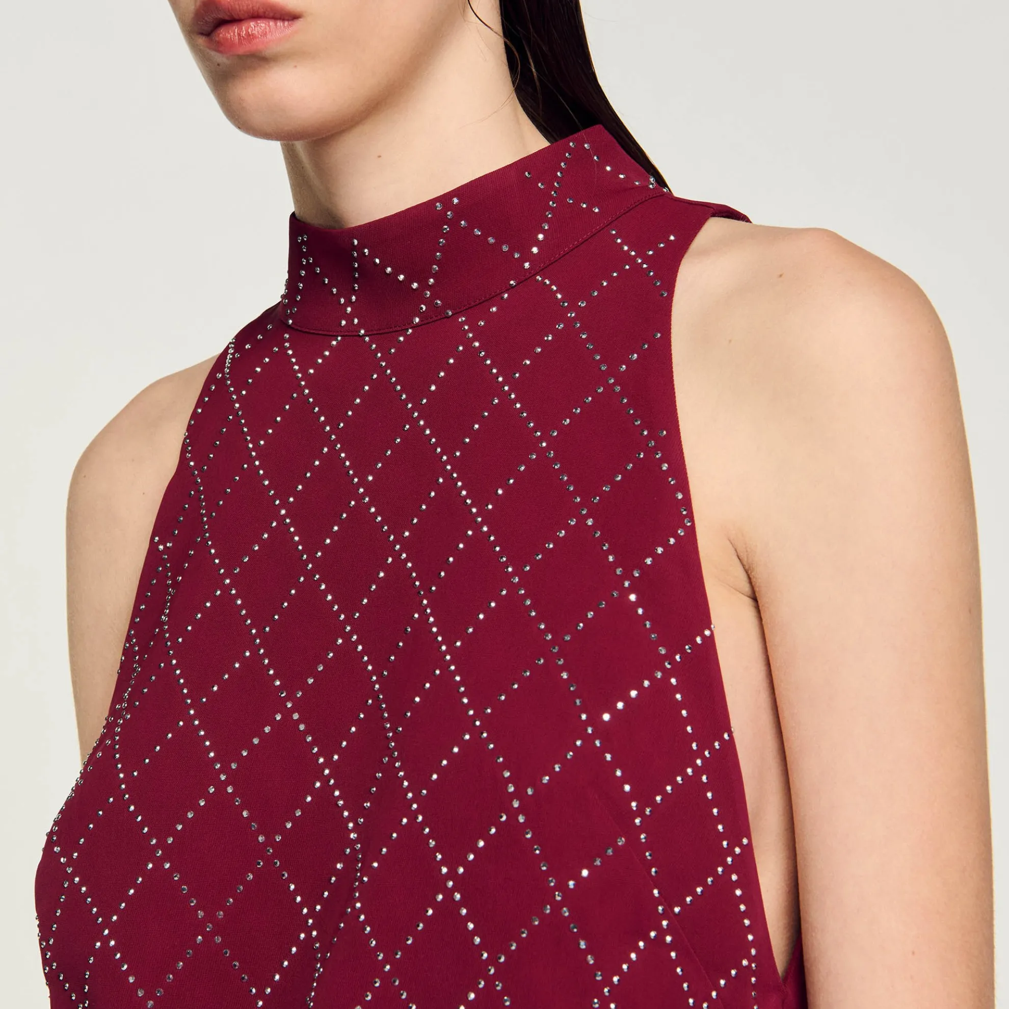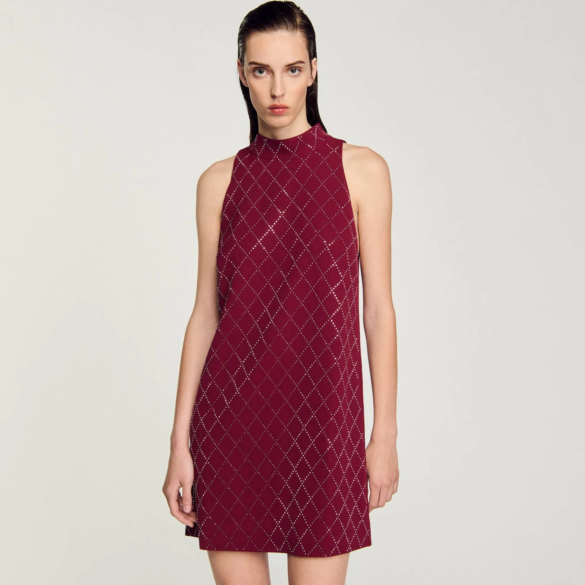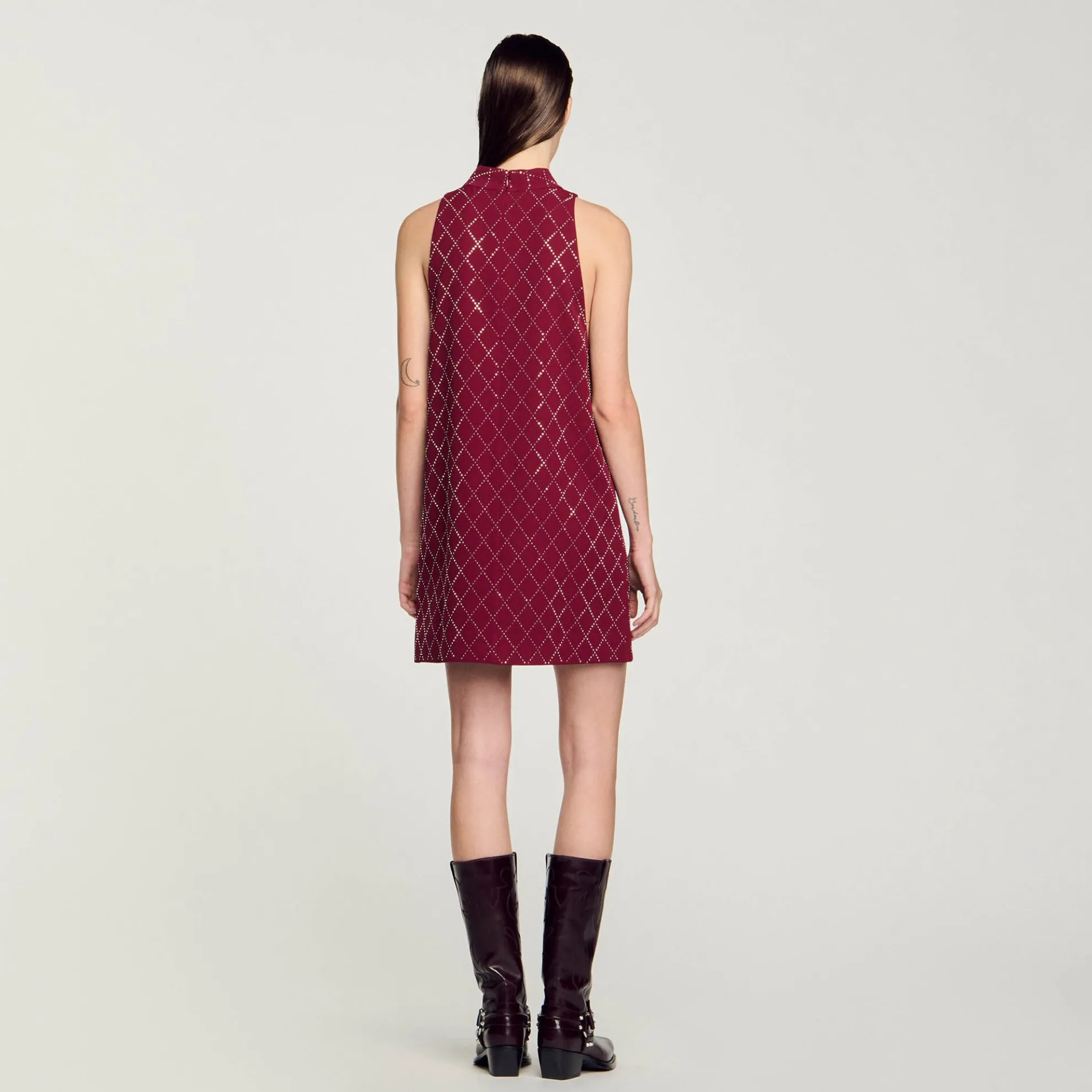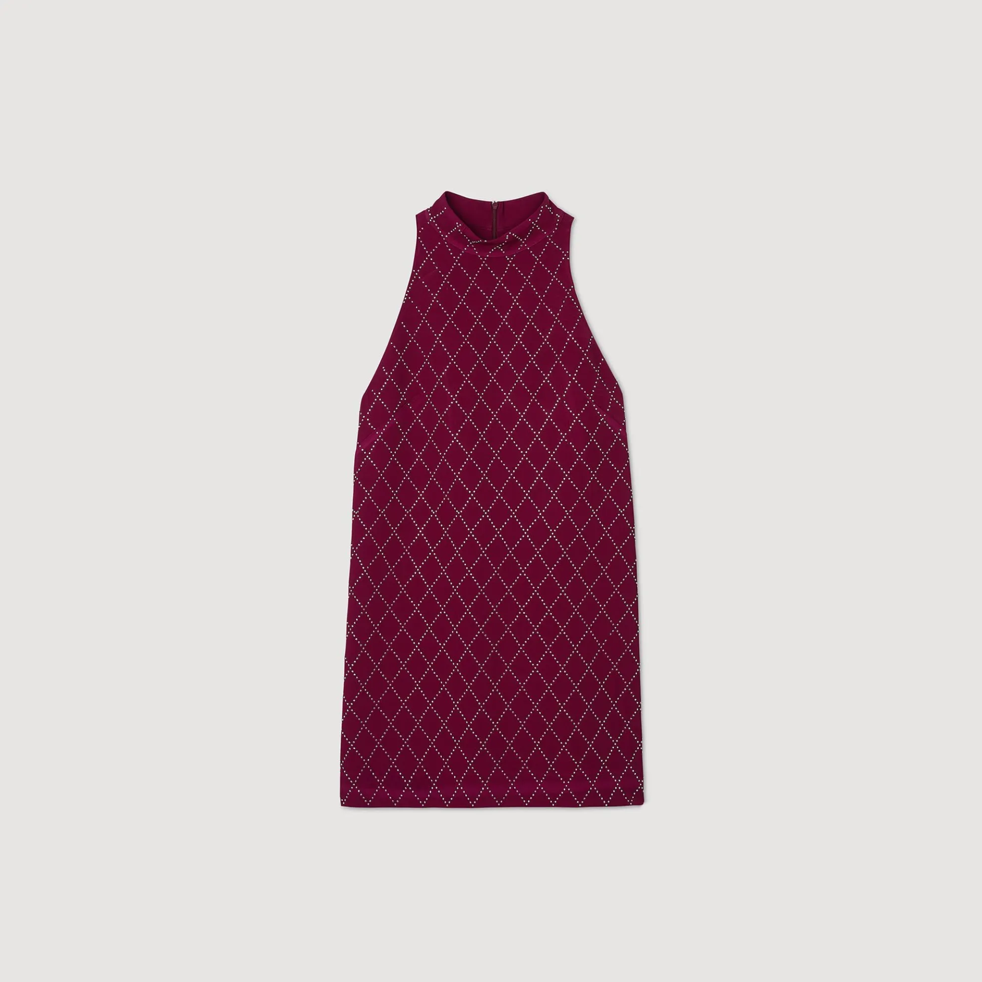 Mouwloze, licht uitlopende korte jurk met opstaande kraag met all-over glanzende metalen studs.
