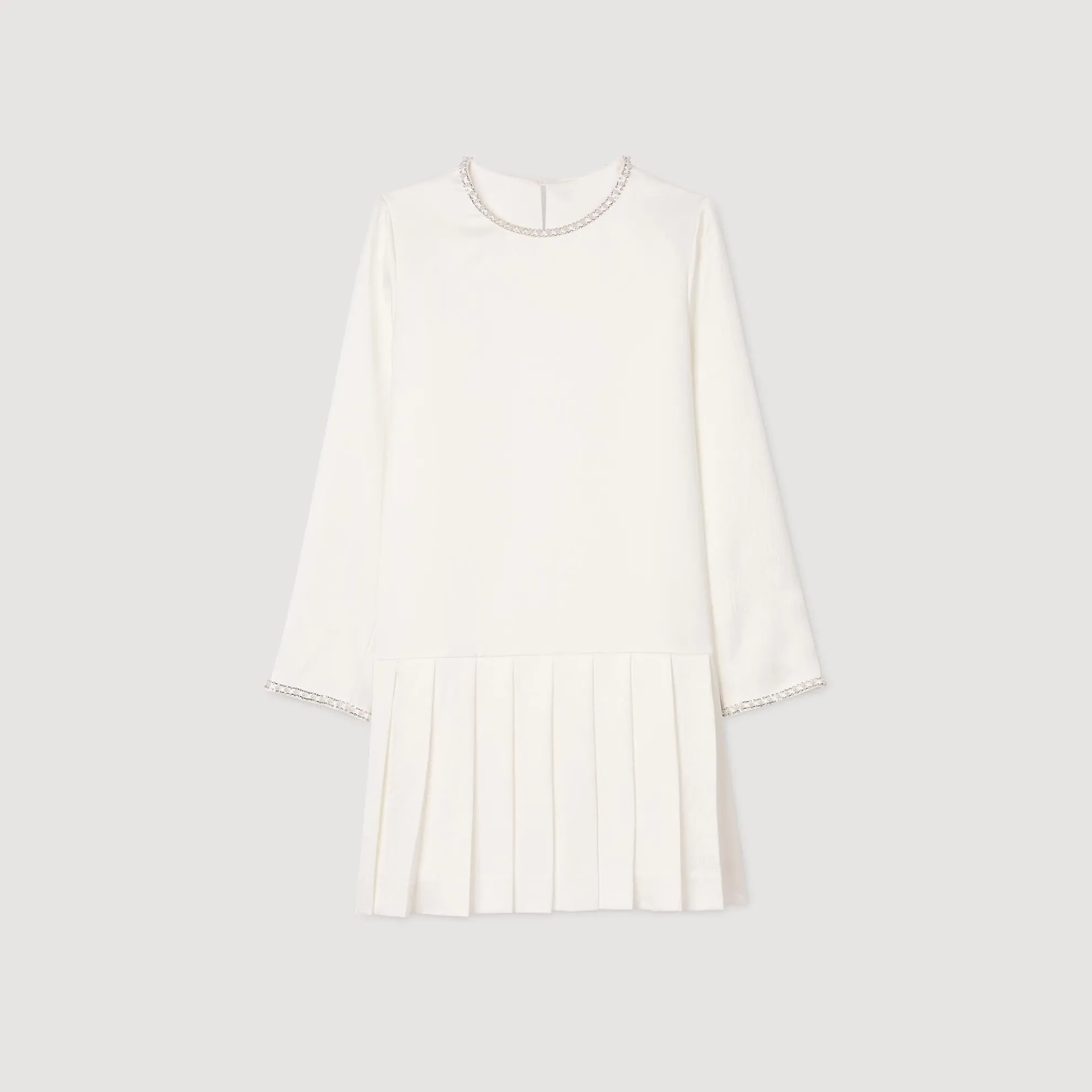 Korte, satijnen jurk met een ronde halslijn versierd met parels, lange mouwen en een geplooid rokgedeelte.