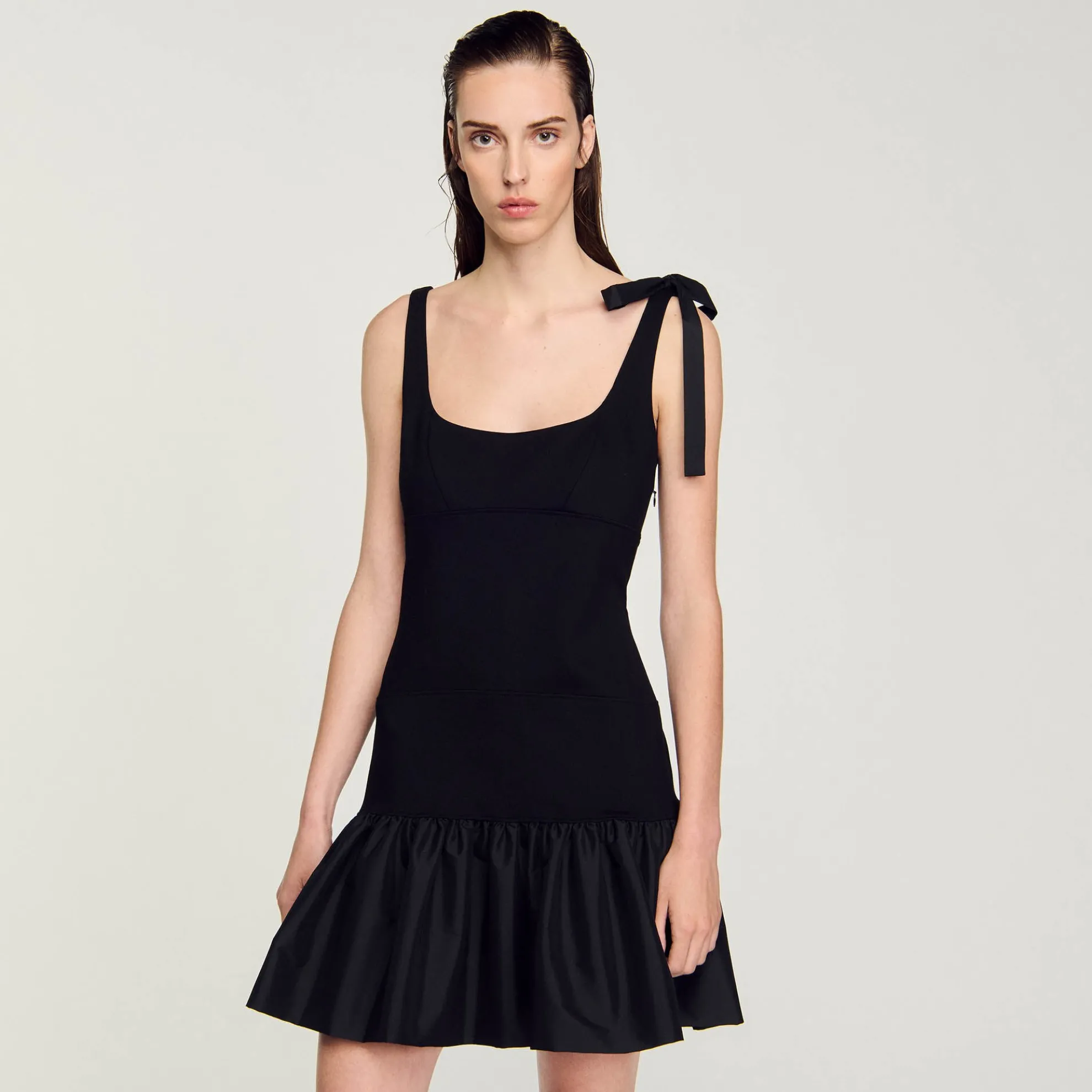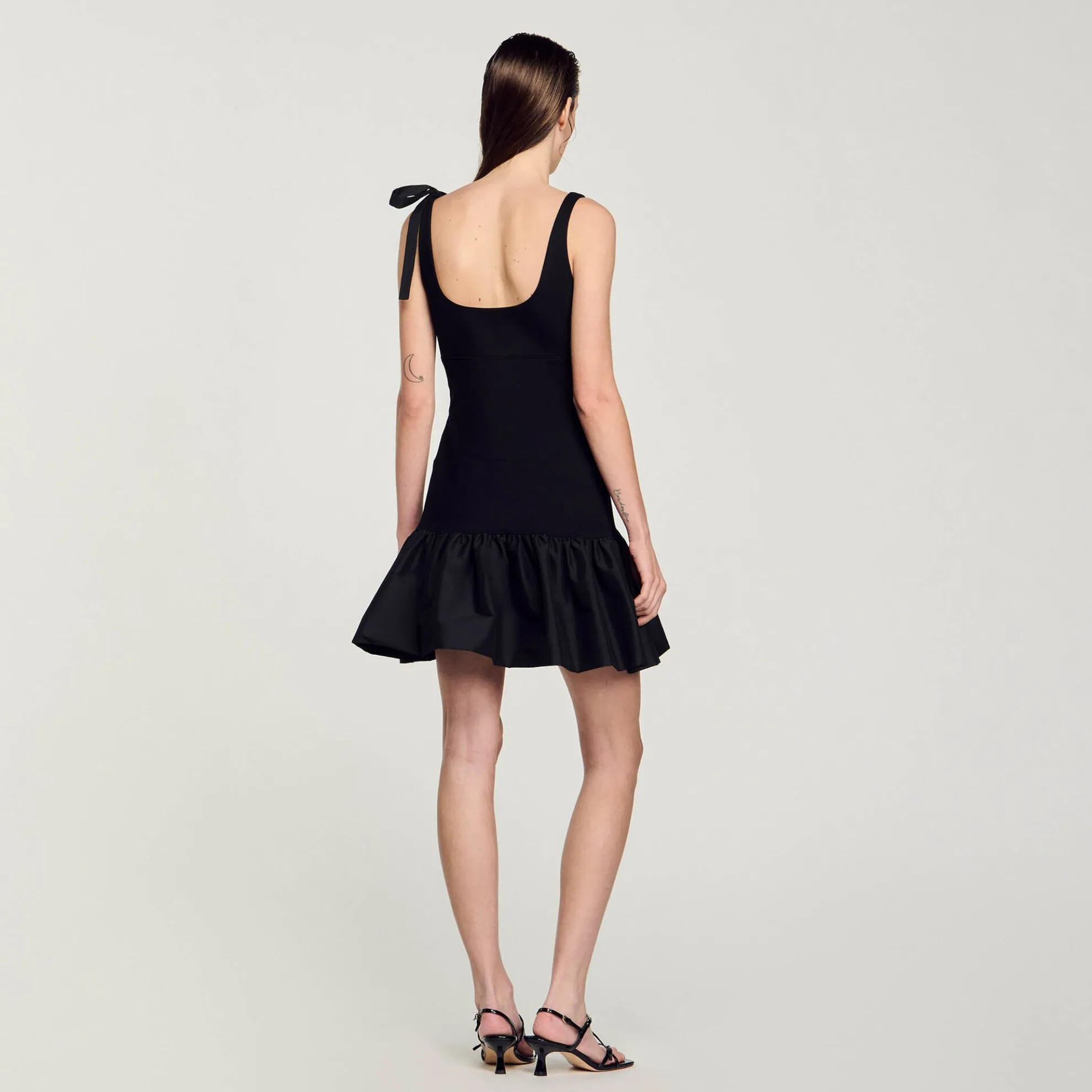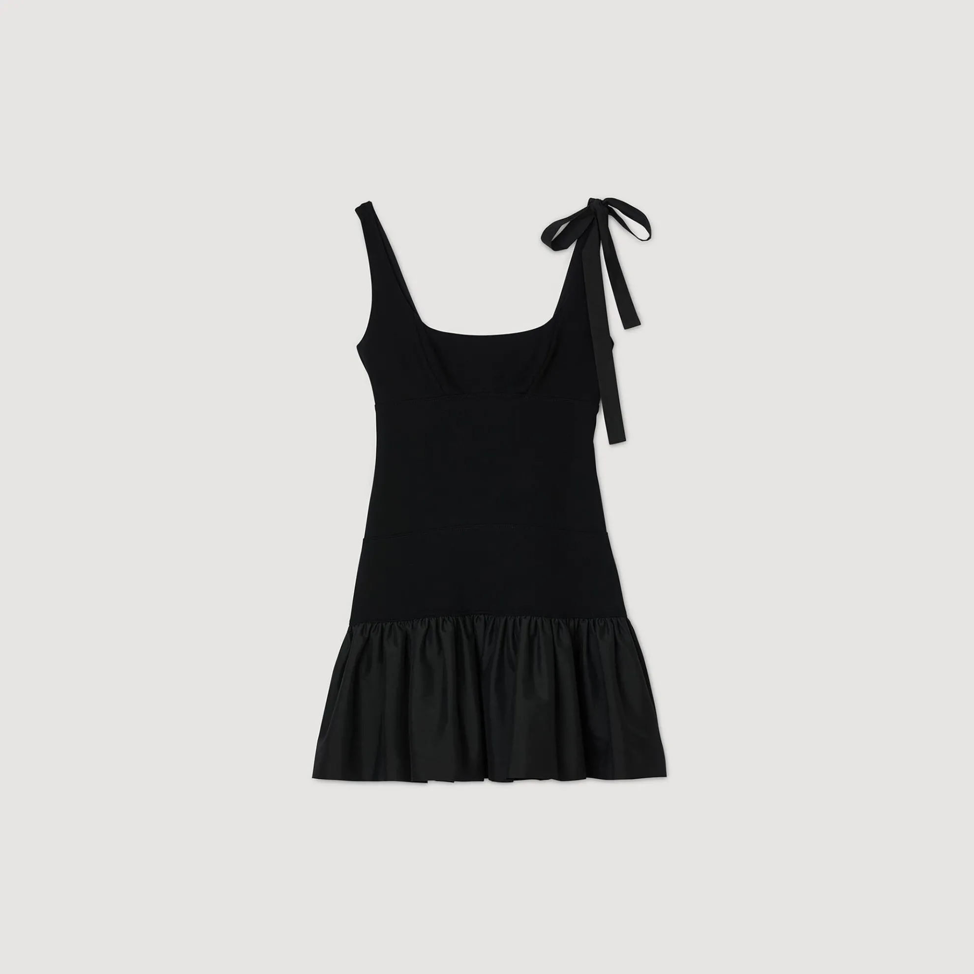 Korte jurk in een mix van zware jersey aan de bovenkant en technische tafzijde aan de onderkant, met schouderbandjes (waarvan één met strik), een ronde halslijn aan de voor- en achterkant en een uitlopend volumineus rokgedeelte.