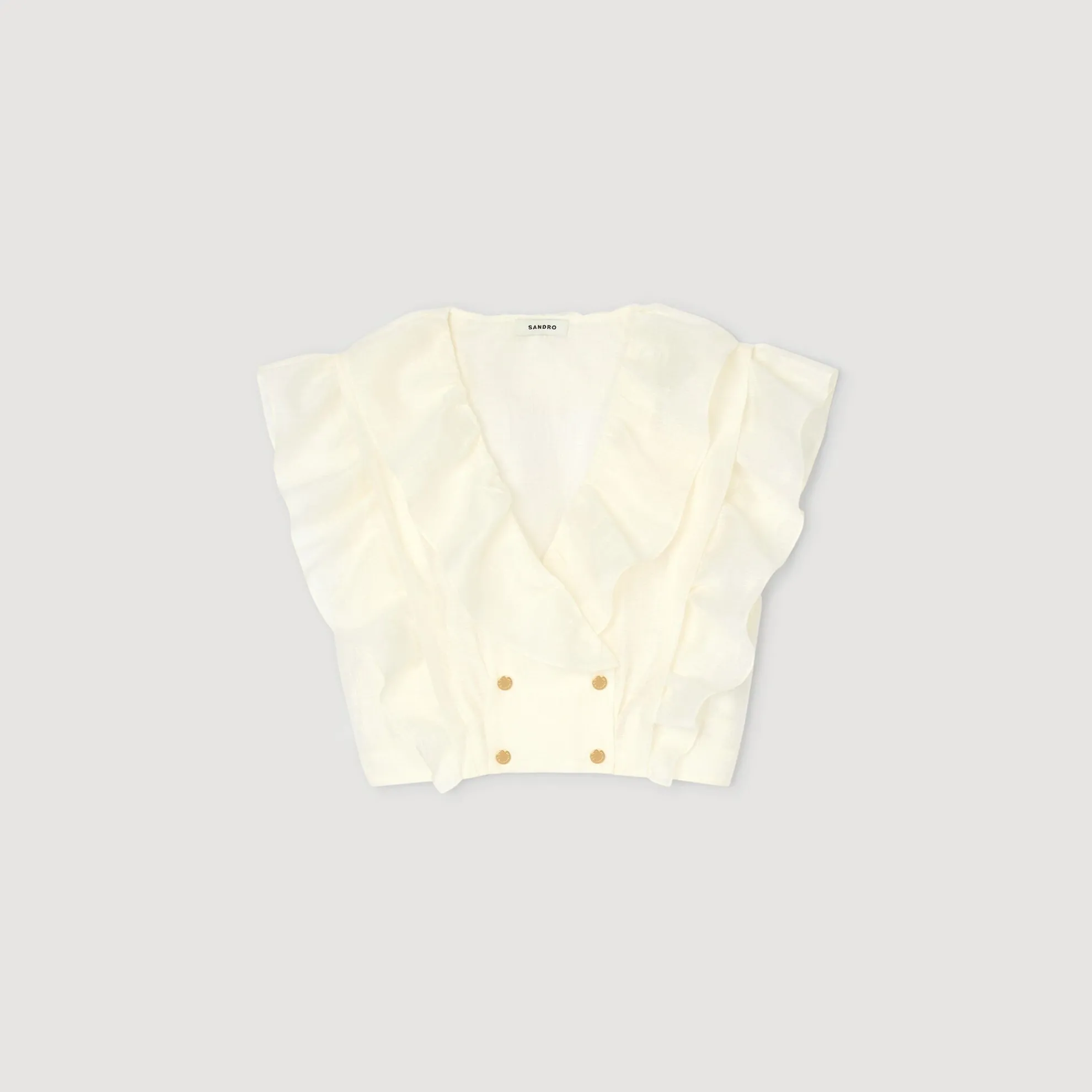 Korte, mouwloze top met brede volants, een gekruiste V-hals en drukknopen.