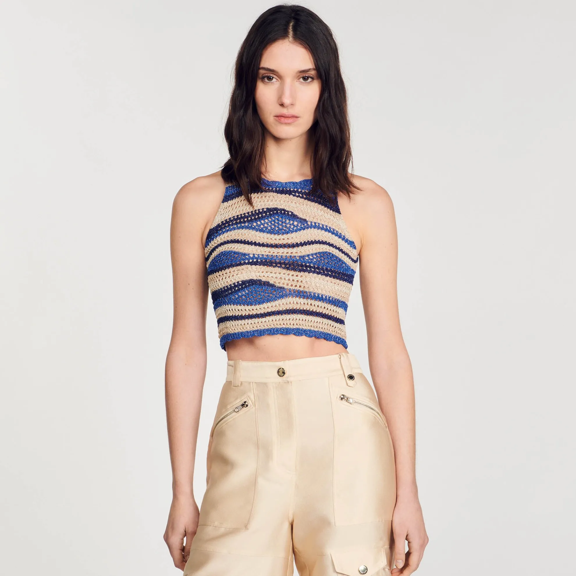 Korte, mouwloze top van glinsterend opengewerkt tricot met een ronde hals.