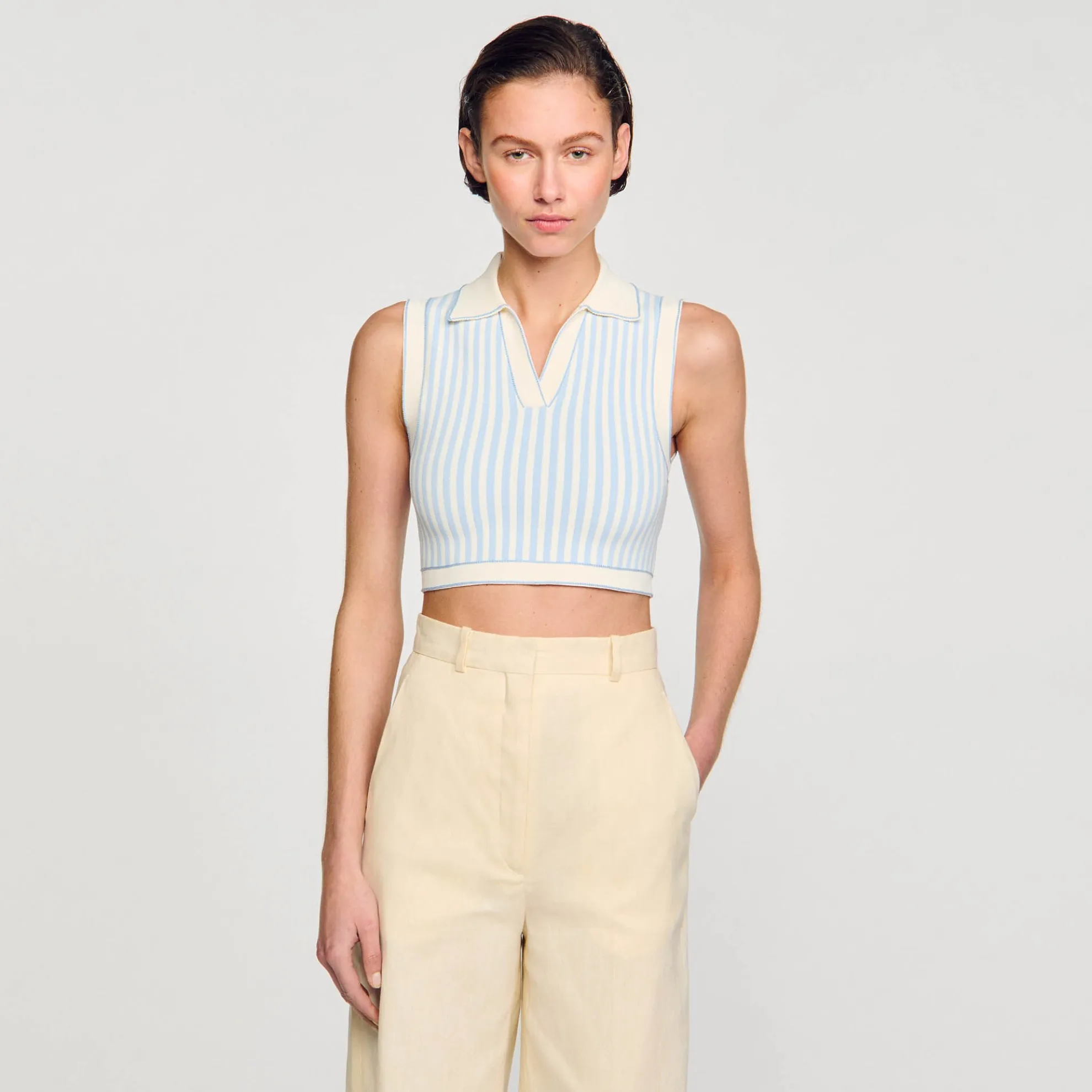 Korte mouwloze trui met strepen, open polokraag en contrasterende randen.