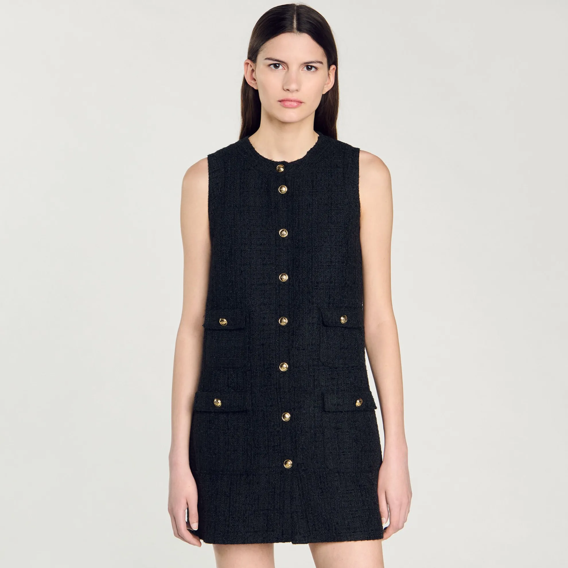 Korte mouwloze jurk van tweed met een ronde hals, een knoopsluiting en opgestikte zakken met flap.