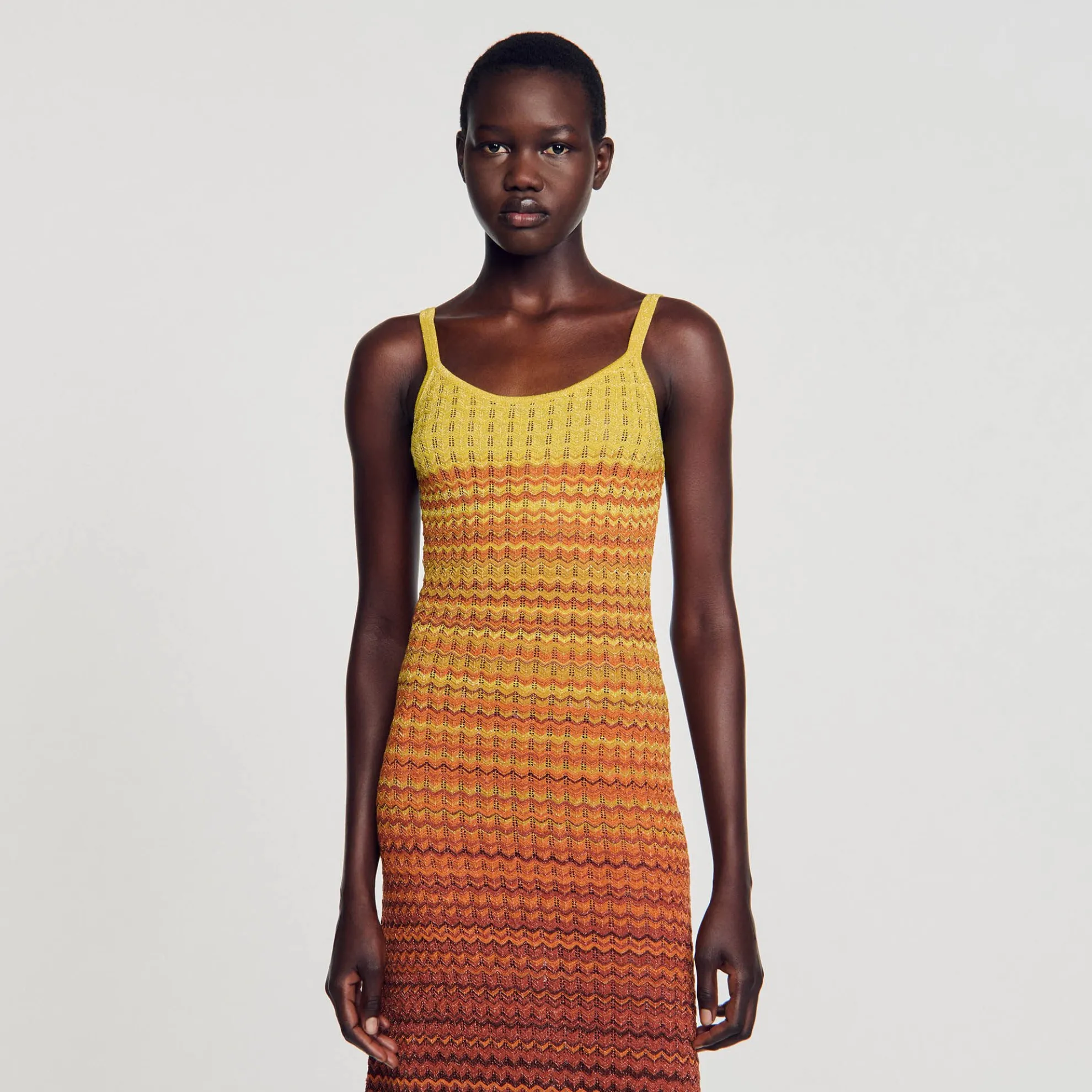 Lange jurk pointillé gebreid met kleurverloop en zigzagmotief, dunne bandjes en een ronde halslijn.