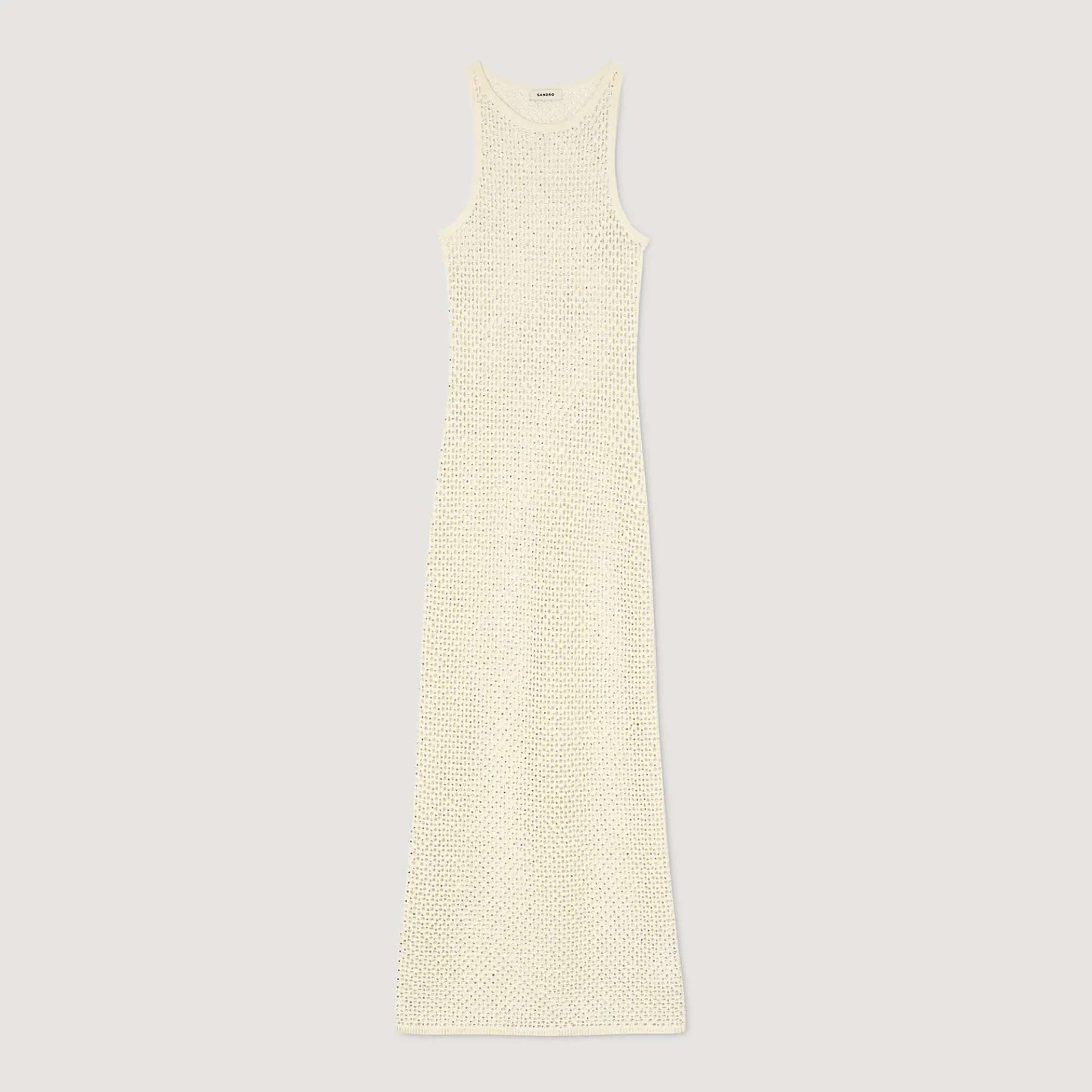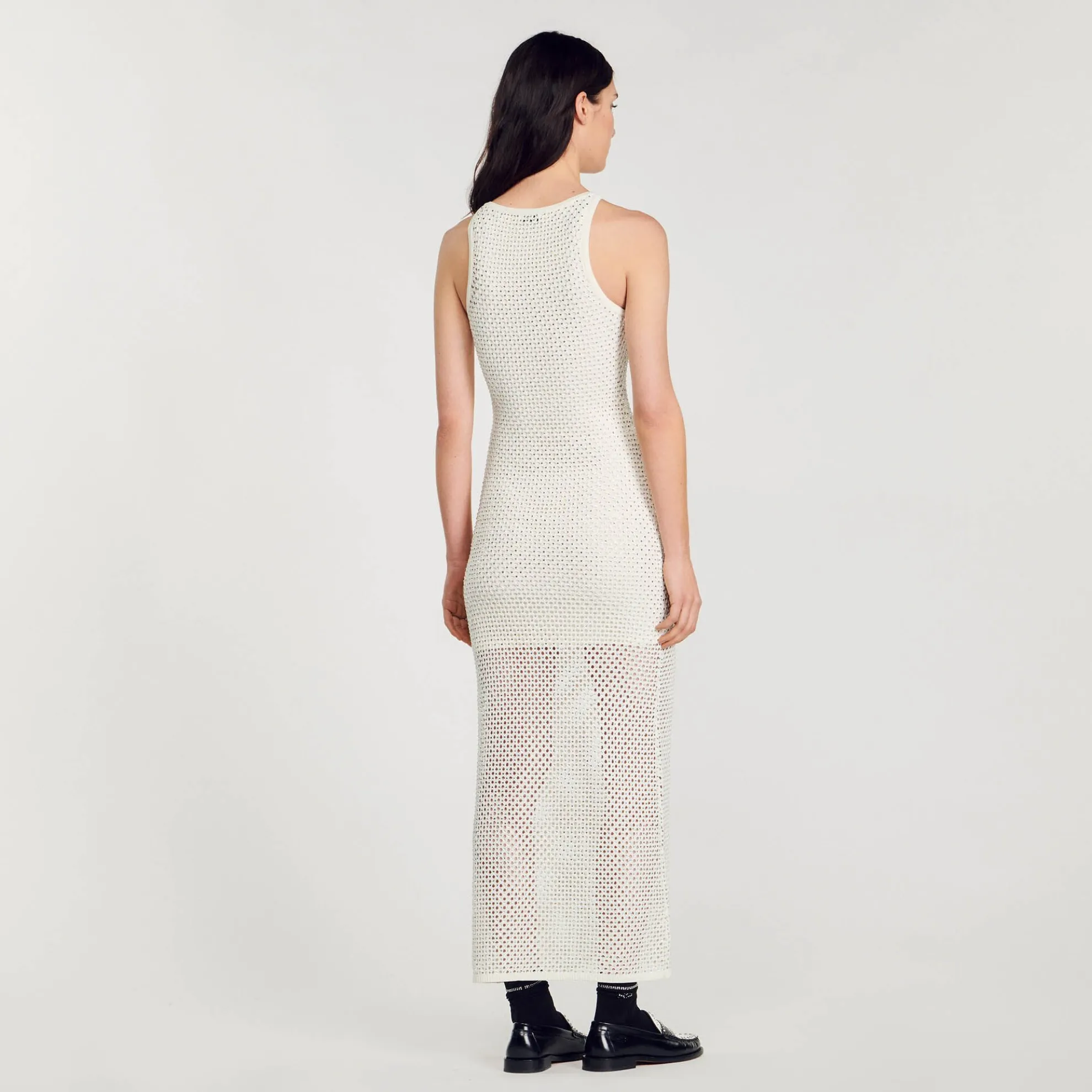 Lange jurk van mesh versierd met stras met armsgaten in Amerikaanse stijl, een ronde halslijn en een korte voering.