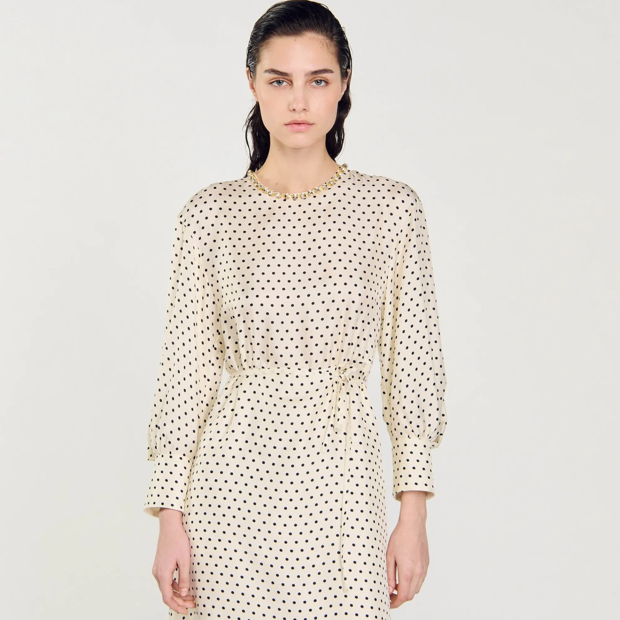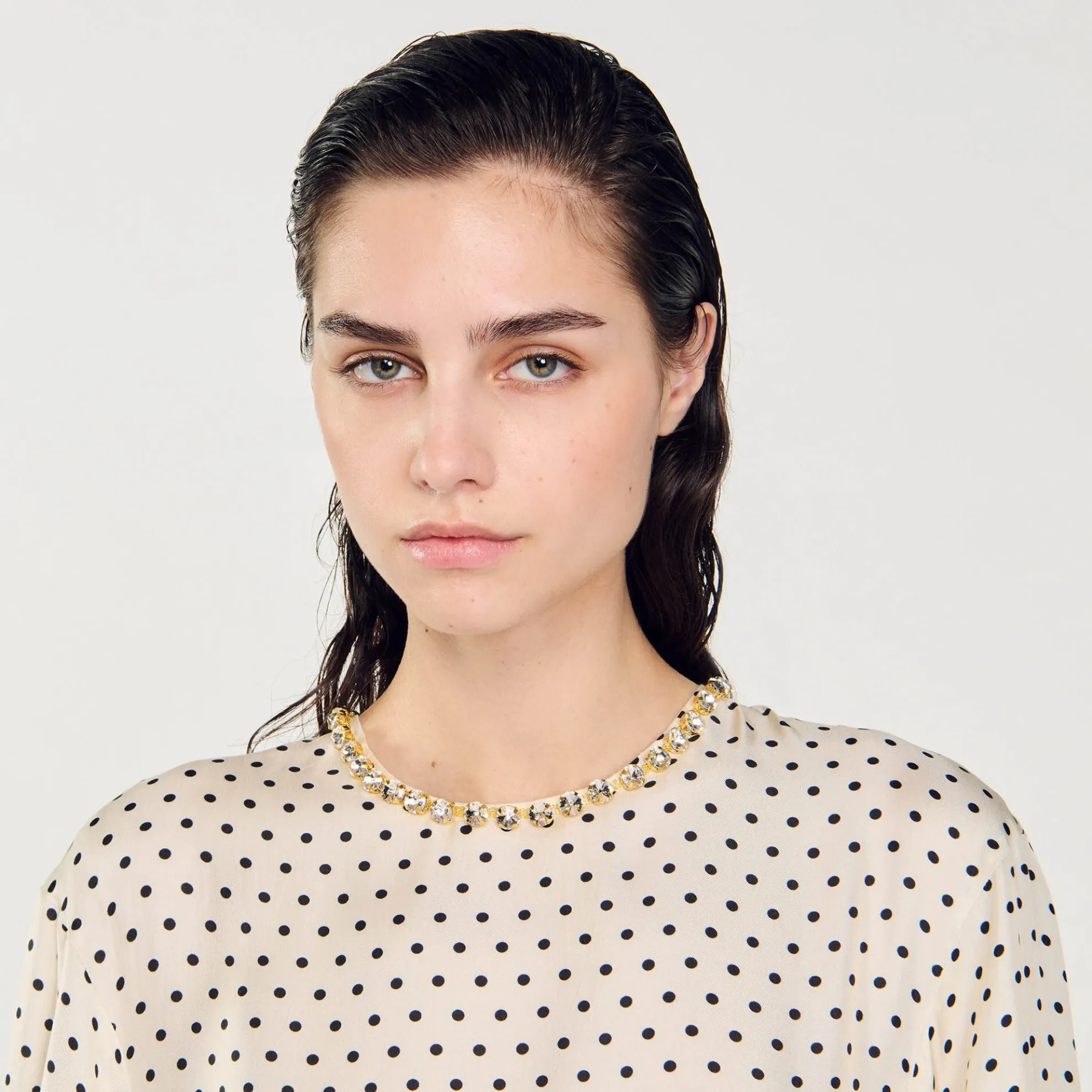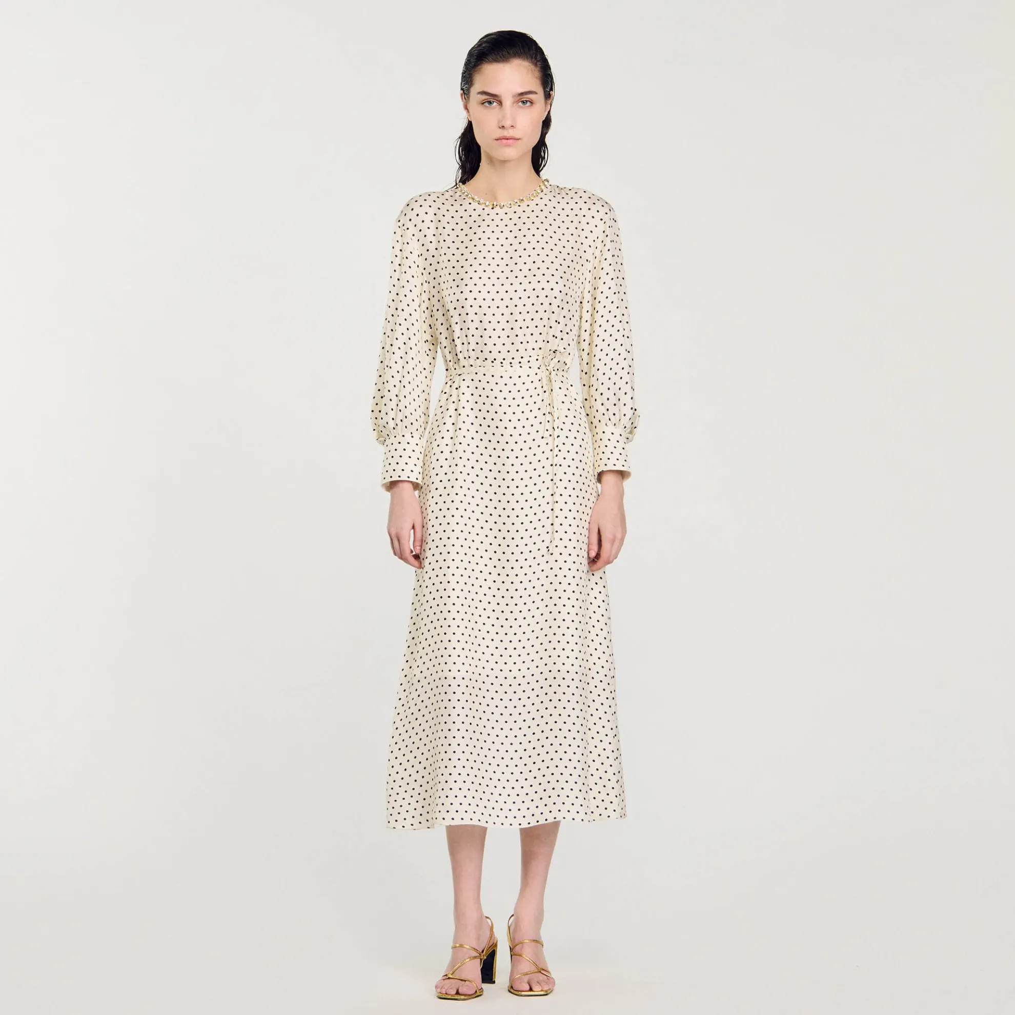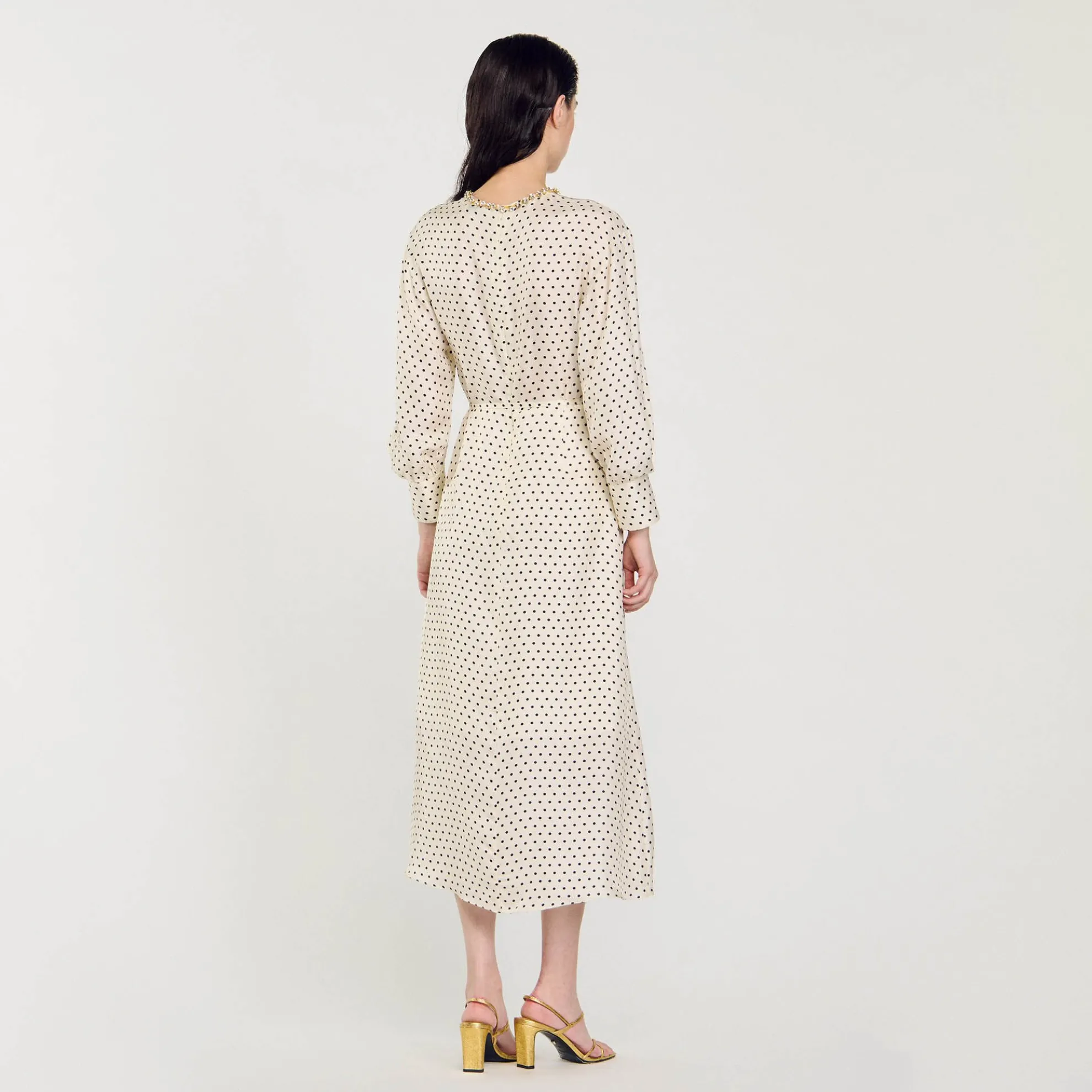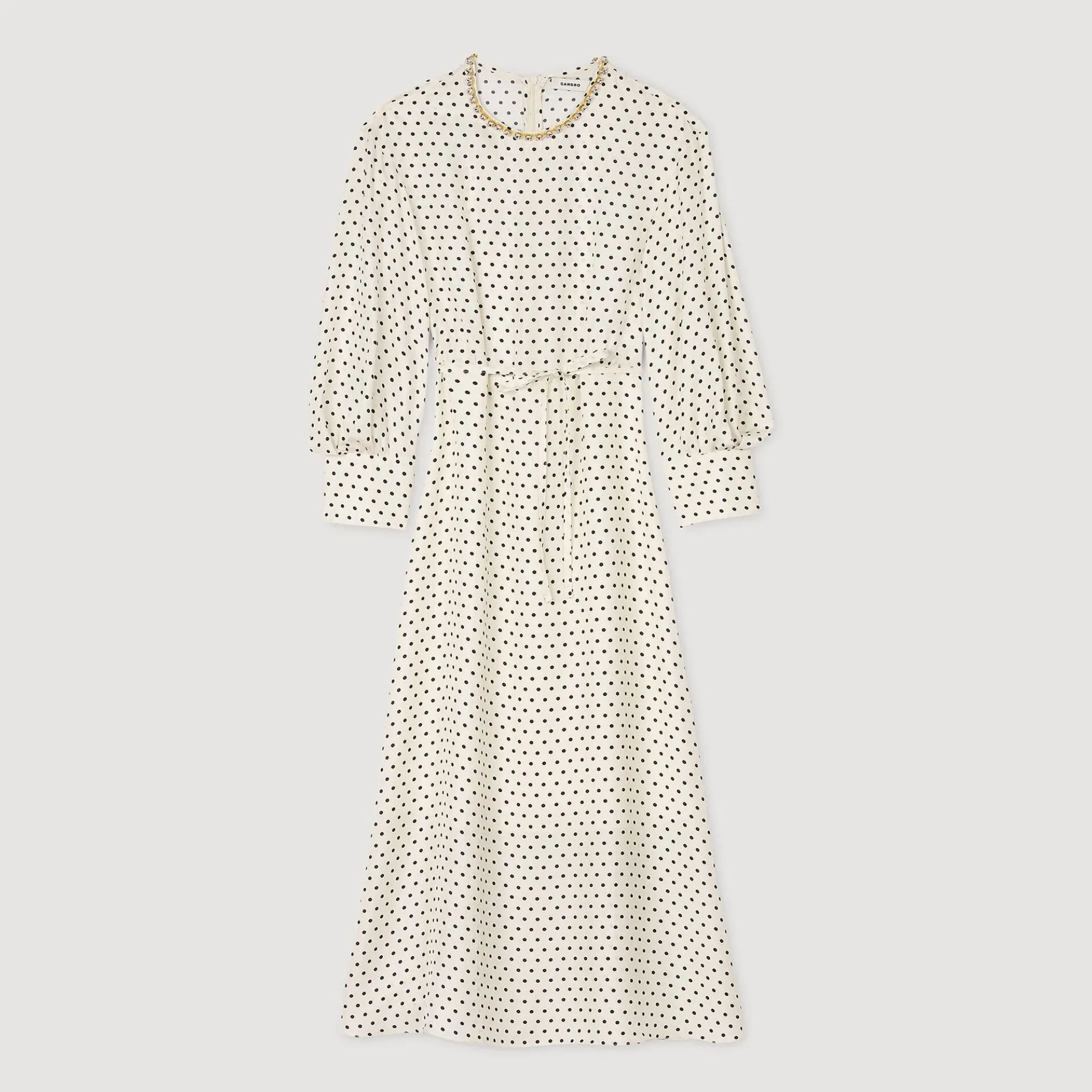 Lange soepelvallende jurk met contrasterende stippen, een ronde kraag met stras, lange mouwen met knoopmanchetten en een afneembare strikceintuur in de taille.