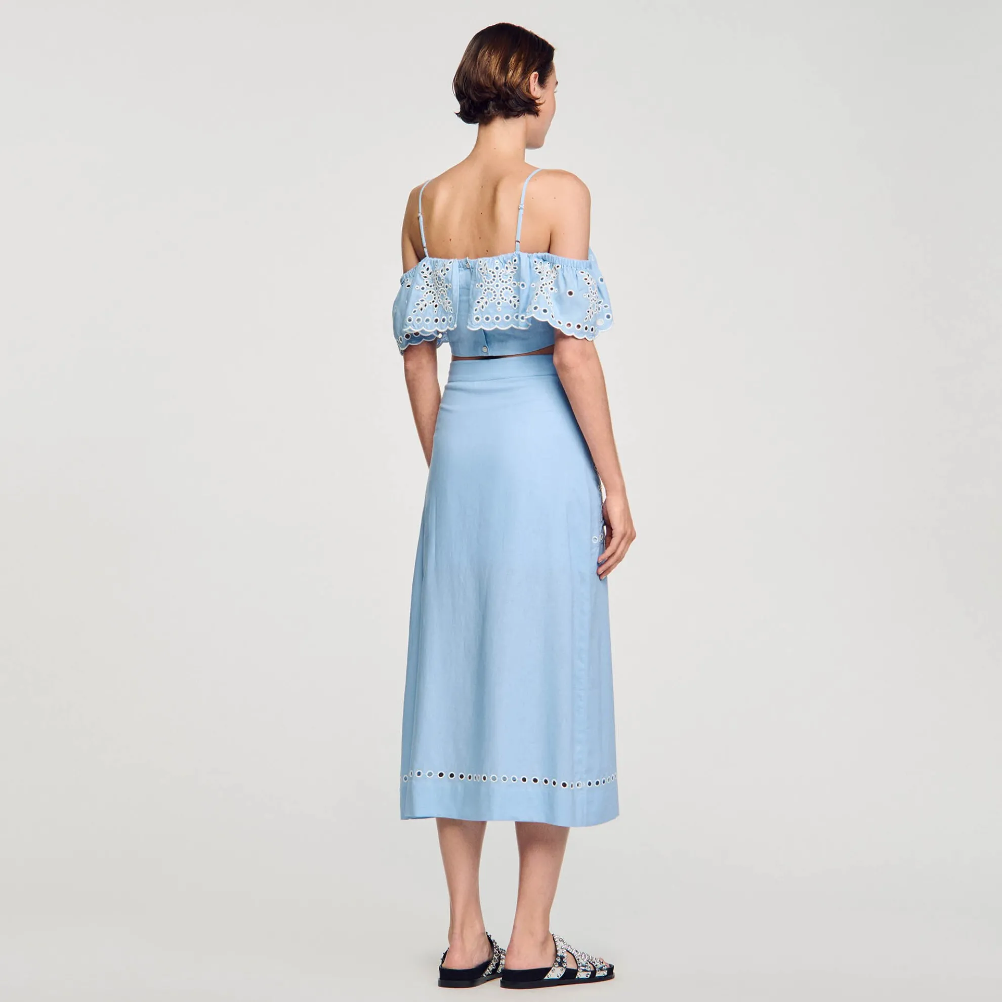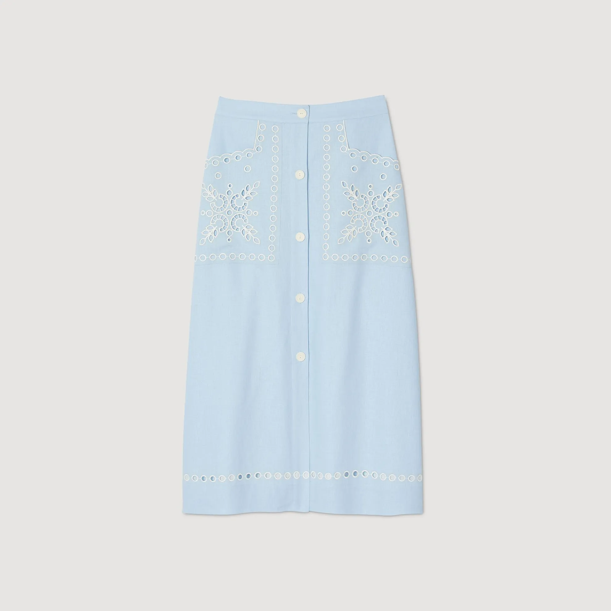 Lange rok met knoopsluiting, versierd met contrasterende broderie anglaise met bloemmotief op de zakken en zoom.