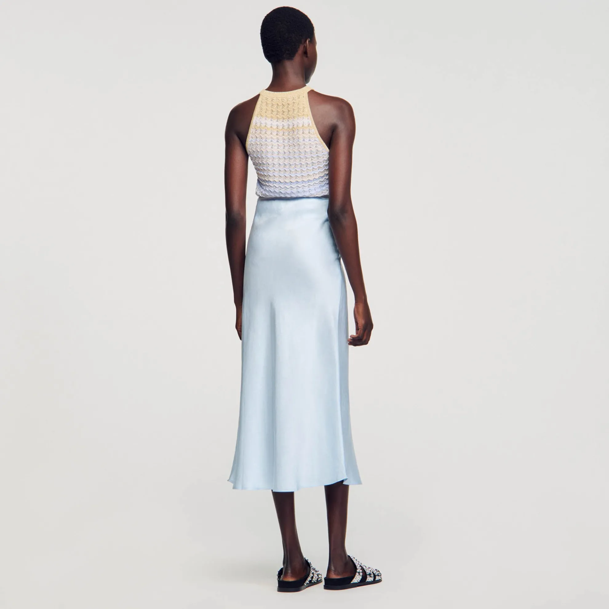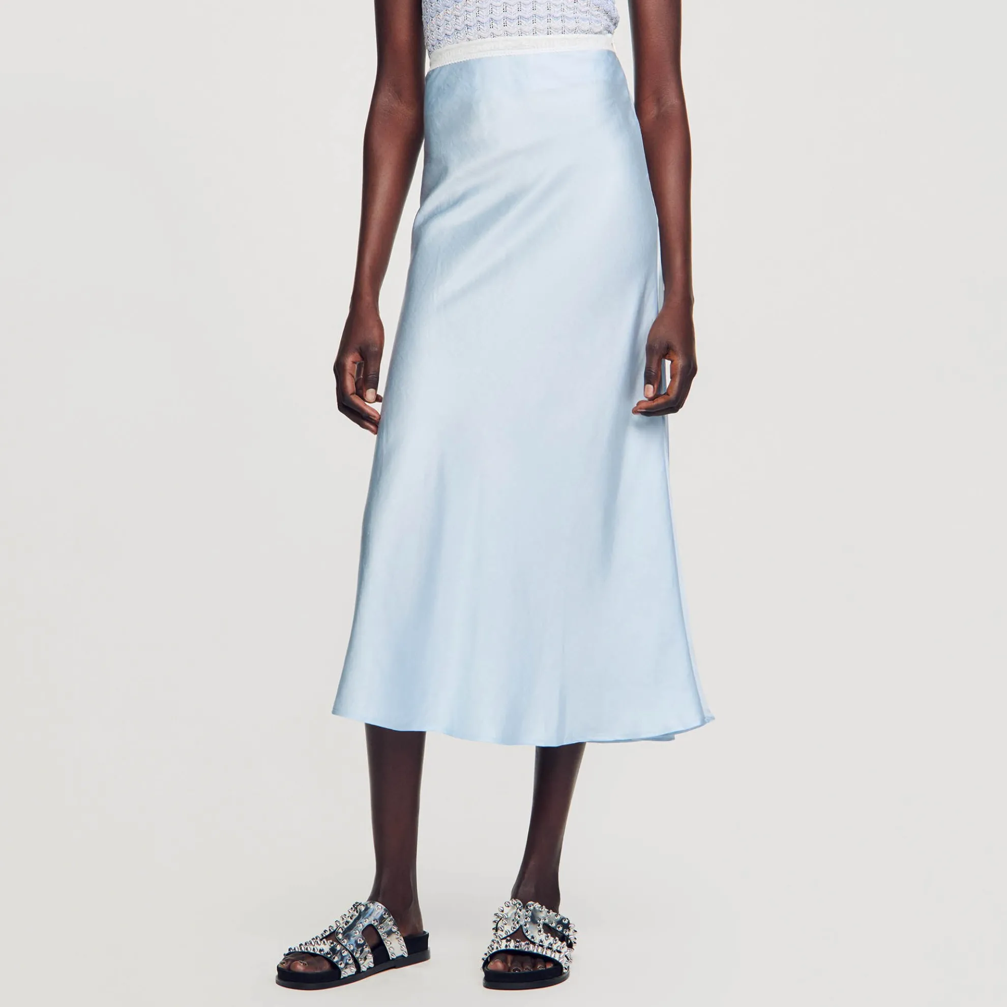 Rechte soepelvallende rok van mix van satijn en linnen met een kanten SANDRO ceintuur in de taille.
