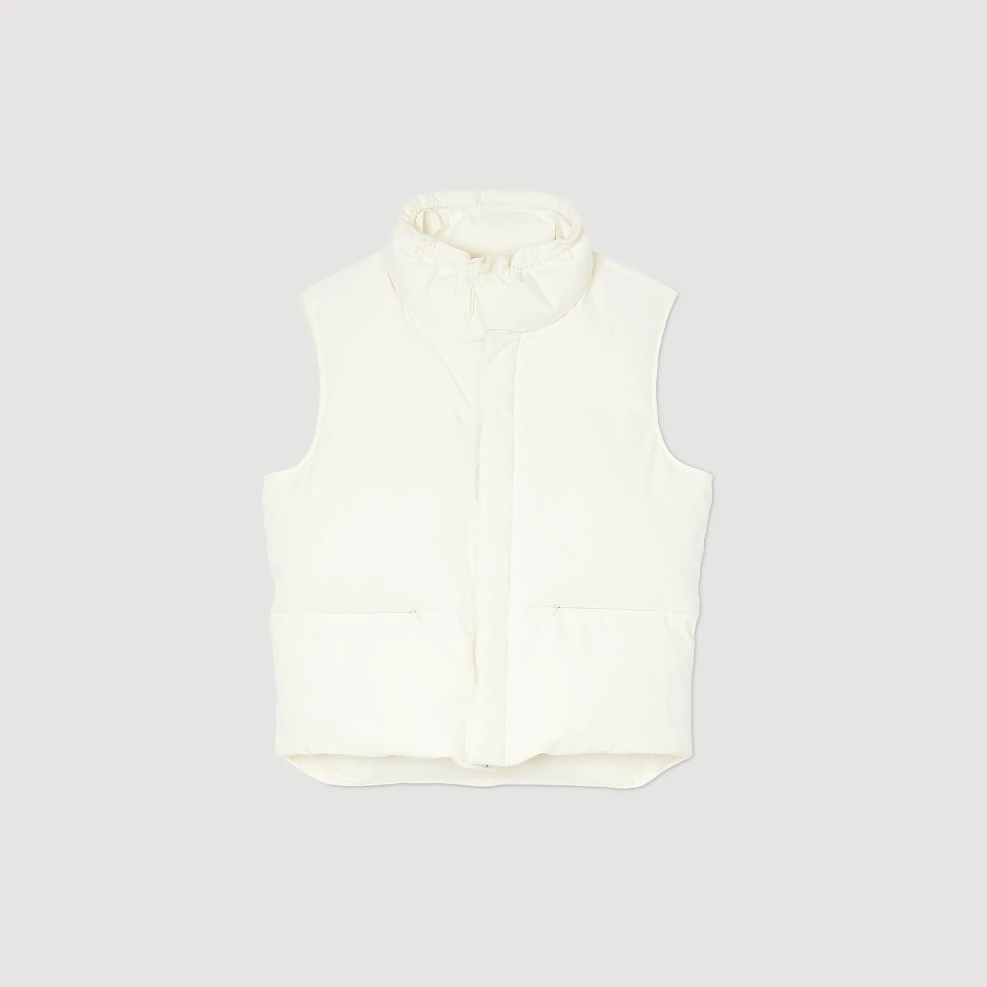 Mouwloos gewatteerd donsjack van technische stof, met opstaande kraag met trekkoord, verborgen ritssluiting met knoopsluiting en twee zakken aan de voorkant.